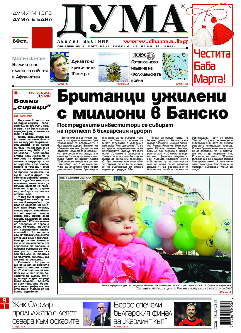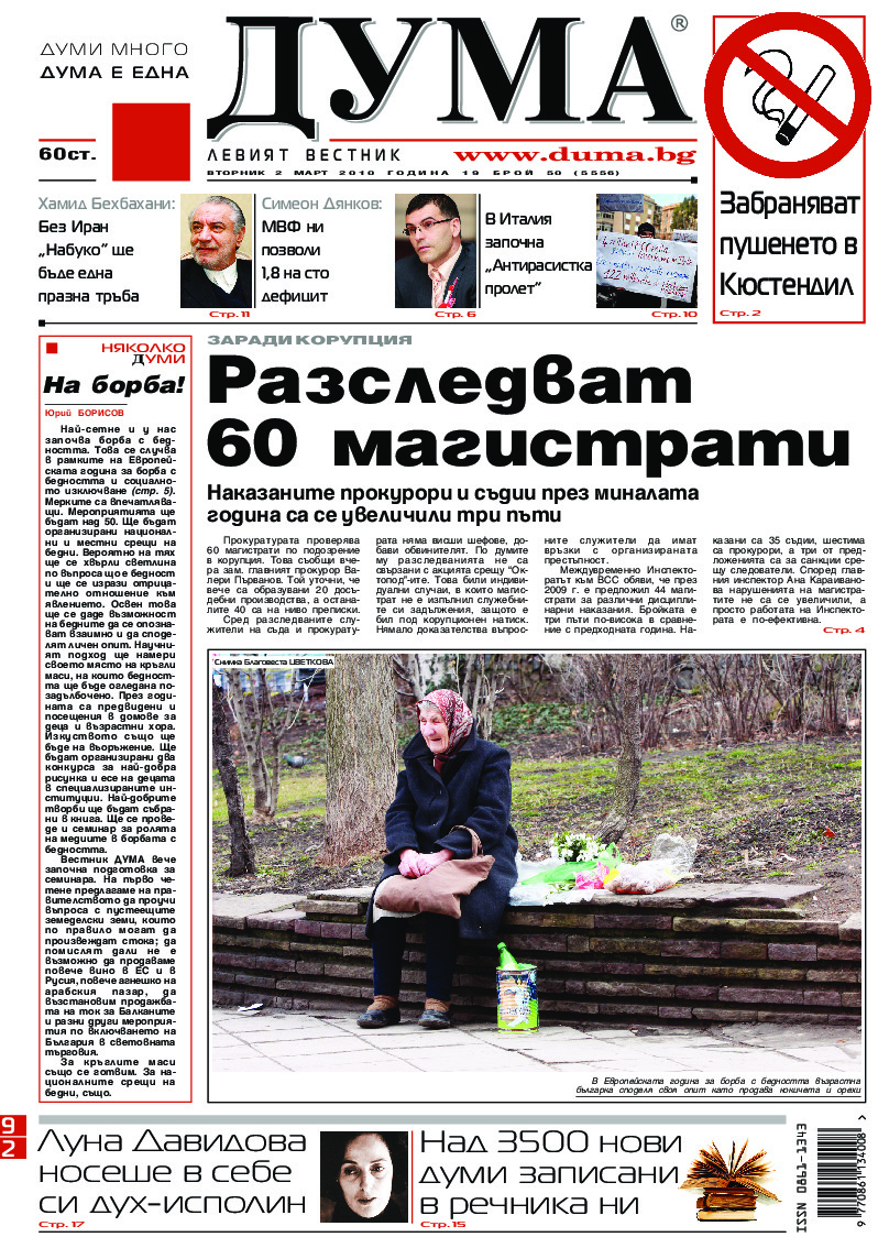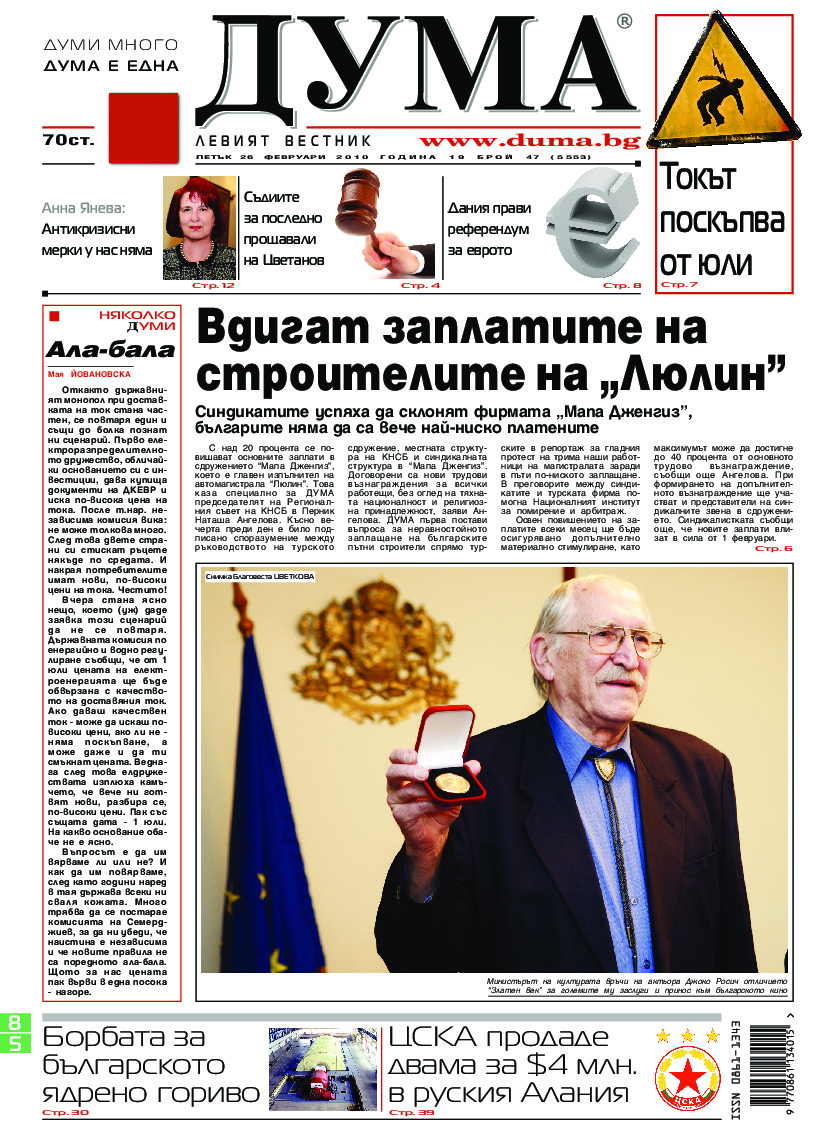 АБОНАМЕНТ за вестник „ДУМА“ за 2026 година. Можете да се абонирате в: „Български пощи“ АД до 15 декември 2025 г., „Доби прес“ ЕООД до 28 декември 2025 г., в редакцията на вестника до 20 декември 2025 г. Каталожен номер 6. Цени: 12 месеца - 149 € / 291,42 лв., 6 месеца - 75 € / 146,69 лв., 3 месеца - 40 € / 78,23 лв., 1 месец - 14 € / 27,38 лв. За повече информация тел. 02 9705 203 и 02 9705 216 отдел „Разпространение” на в-к ДУМА на ул. „Позитано” 20 А. E-mail: abonament@duma.bg АБОНАМЕНТ за вестник „ДУМА“ за 2026 година. Можете да се абонирате в: „Български пощи“ АД до 15 декември 2025 г., „Доби прес“ ЕООД до 28 декември 2025 г., в редакцията на вестника до 20 декември 2025 г. Каталожен номер 6. Цени: 12 месеца - 149 € / 291,42 лв., 6 месеца - 75 € / 146,69 лв., 3 месеца - 40 € / 78,23 лв., 1 месец - 14 € / 27,38 лв. За повече информация тел. 02 9705 203 и 02 9705 216 отдел „Разпространение” на в-к ДУМА на ул. „Позитано” 20 А. E-mail: abonament@duma.bg