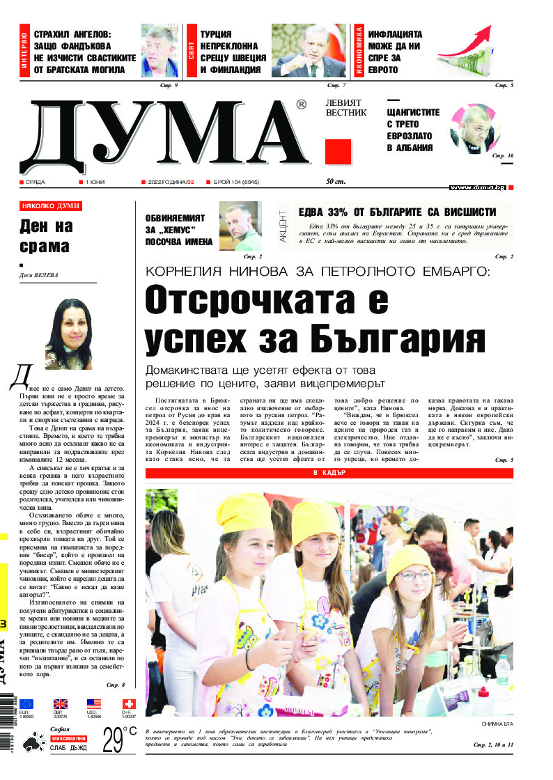 АБОНАМЕНТ за вестник „ДУМА“ за 2026 година. Можете да се абонирате в: „Български пощи“ АД до 15 декември 2025 г., „Доби прес“ ЕООД до 28 декември 2025 г., в редакцията на вестника до 20 декември 2025 г. Каталожен номер 6. Цени: 12 месеца - 149 € / 291,42 лв., 6 месеца - 75 € / 146,69 лв., 3 месеца - 40 € / 78,23 лв., 1 месец - 14 € / 27,38 лв. За повече информация тел. 02 9705 203 и 02 9705 216 отдел „Разпространение” на в-к ДУМА на ул. „Позитано” 20 А. E-mail: abonament@duma.bg АБОНАМЕНТ за вестник „ДУМА“ за 2026 година. Можете да се абонирате в: „Български пощи“ АД до 15 декември 2025 г., „Доби прес“ ЕООД до 28 декември 2025 г., в редакцията на вестника до 20 декември 2025 г. Каталожен номер 6. Цени: 12 месеца - 149 € / 291,42 лв., 6 месеца - 75 € / 146,69 лв., 3 месеца - 40 € / 78,23 лв., 1 месец - 14 € / 27,38 лв. За повече информация тел. 02 9705 203 и 02 9705 216 отдел „Разпространение” на в-к ДУМА на ул. „Позитано” 20 А. E-mail: abonament@duma.bg