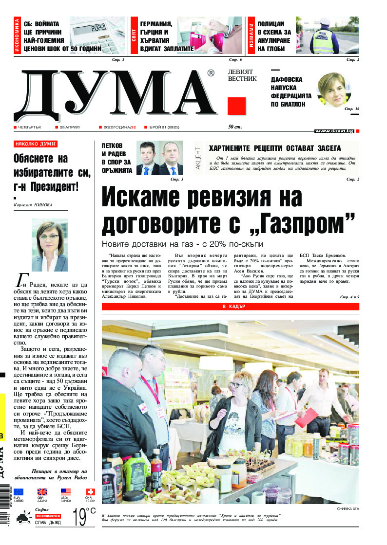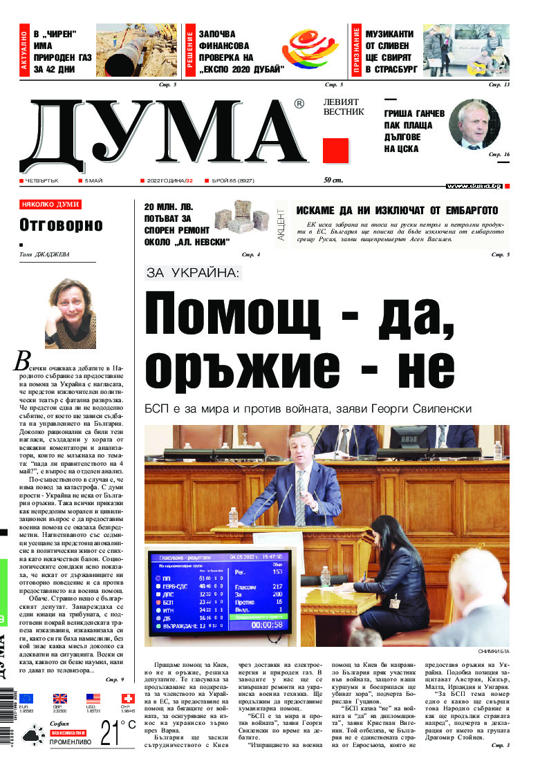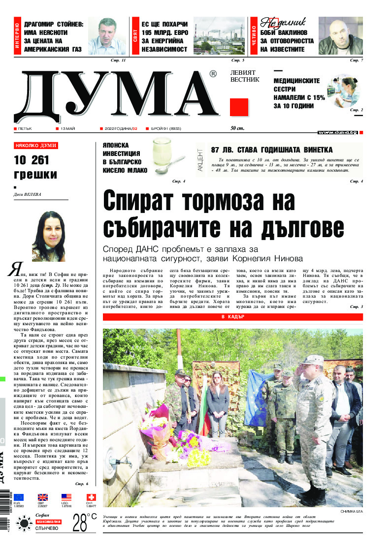 АБОНАМЕНТ за вестник „ДУМА“ за 2026 година. Можете да се абонирате в: „Български пощи“ АД до 15 декември 2025 г., „Доби прес“ ЕООД до 28 декември 2025 г., в редакцията на вестника до 20 декември 2025 г. Каталожен номер 6. Цени: 12 месеца - 149 € / 291,42 лв., 6 месеца - 75 € / 146,69 лв., 3 месеца - 40 € / 78,23 лв., 1 месец - 14 € / 27,38 лв. За повече информация тел. 02 9705 203 и 02 9705 216 отдел „Разпространение” на в-к ДУМА на ул. „Позитано” 20 А. E-mail: abonament@duma.bg АБОНАМЕНТ за вестник „ДУМА“ за 2026 година. Можете да се абонирате в: „Български пощи“ АД до 15 декември 2025 г., „Доби прес“ ЕООД до 28 декември 2025 г., в редакцията на вестника до 20 декември 2025 г. Каталожен номер 6. Цени: 12 месеца - 149 € / 291,42 лв., 6 месеца - 75 € / 146,69 лв., 3 месеца - 40 € / 78,23 лв., 1 месец - 14 € / 27,38 лв. За повече информация тел. 02 9705 203 и 02 9705 216 отдел „Разпространение” на в-к ДУМА на ул. „Позитано” 20 А. E-mail: abonament@duma.bg
