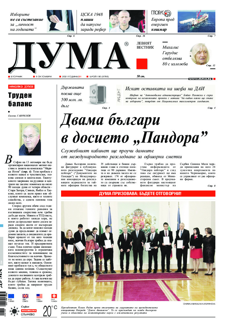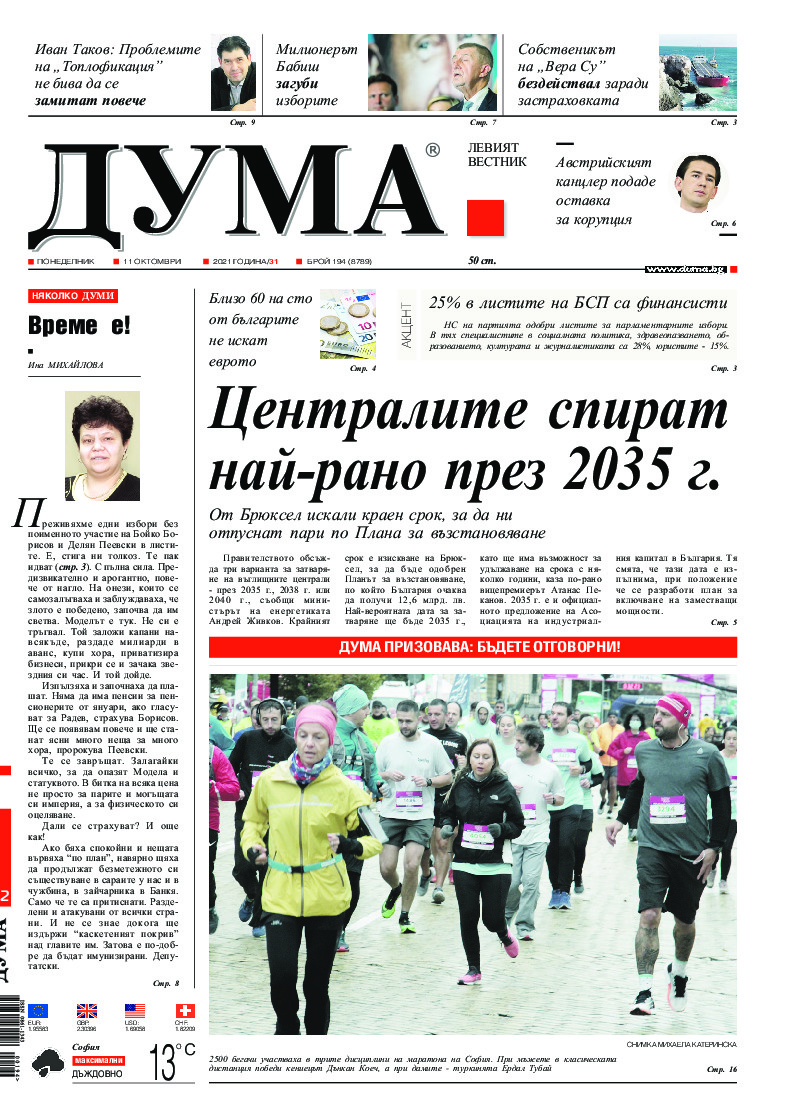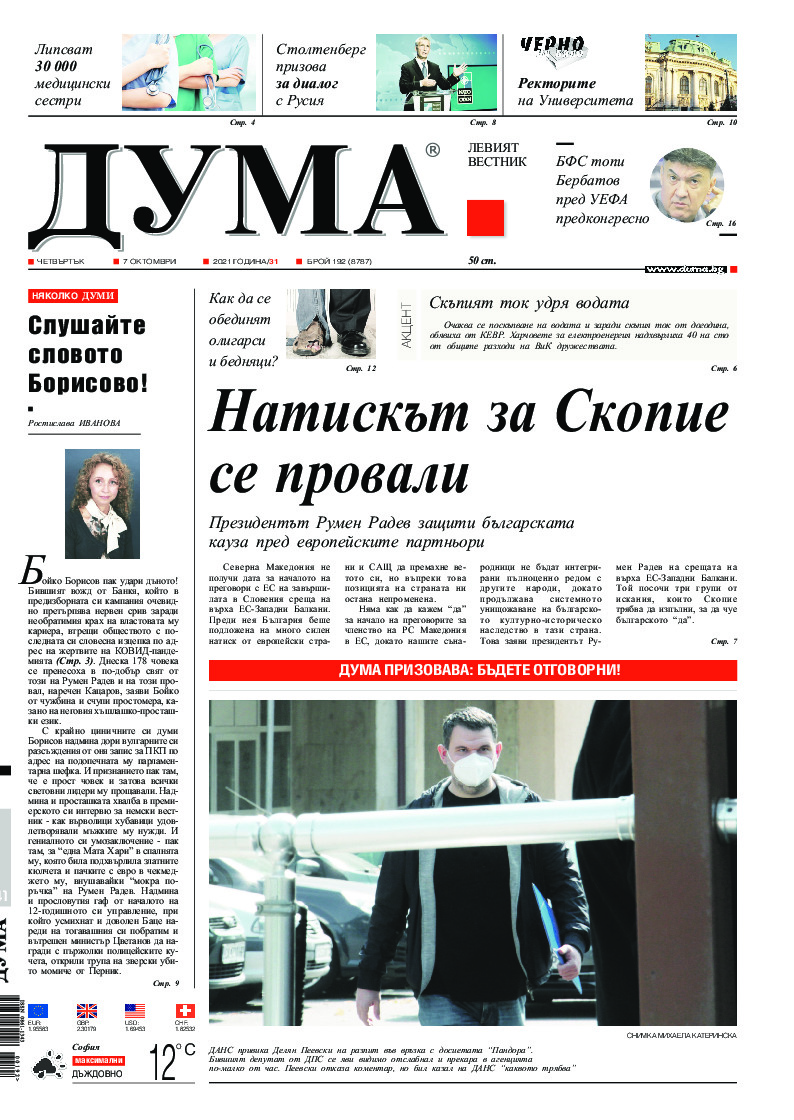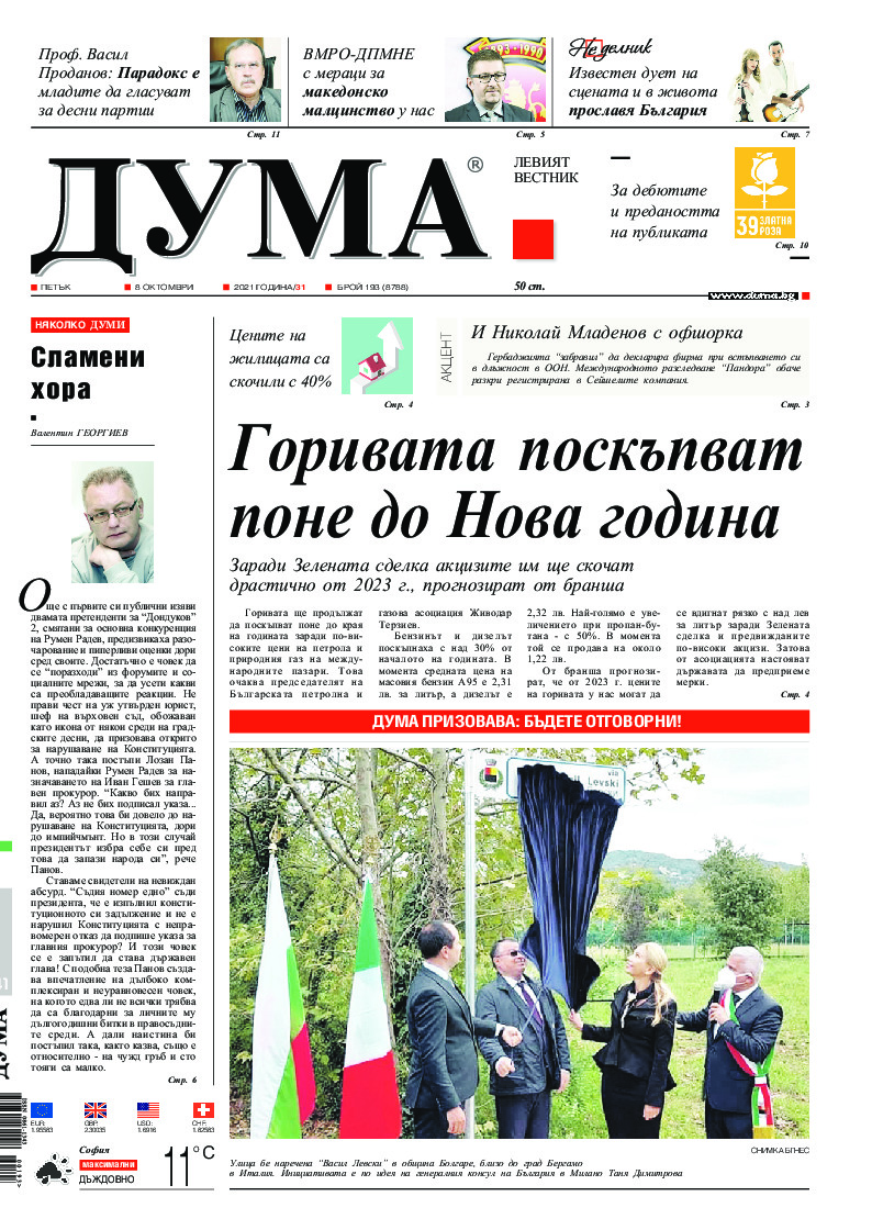 АБОНАМЕНТ за вестник „ДУМА“ за 2026 година. Можете да се абонирате в: „Български пощи“ АД до 15 декември 2025 г., „Доби прес“ ЕООД до 28 декември 2025 г., в редакцията на вестника до 20 декември 2025 г. Каталожен номер 6. Цени: 12 месеца - 149 € / 291,42 лв., 6 месеца - 75 € / 146,69 лв., 3 месеца - 40 € / 78,23 лв., 1 месец - 14 € / 27,38 лв. За повече информация тел. 02 9705 203 и 02 9705 216 отдел „Разпространение” на в-к ДУМА на ул. „Позитано” 20 А. E-mail: abonament@duma.bg АБОНАМЕНТ за вестник „ДУМА“ за 2026 година. Можете да се абонирате в: „Български пощи“ АД до 15 декември 2025 г., „Доби прес“ ЕООД до 28 декември 2025 г., в редакцията на вестника до 20 декември 2025 г. Каталожен номер 6. Цени: 12 месеца - 149 € / 291,42 лв., 6 месеца - 75 € / 146,69 лв., 3 месеца - 40 € / 78,23 лв., 1 месец - 14 € / 27,38 лв. За повече информация тел. 02 9705 203 и 02 9705 216 отдел „Разпространение” на в-к ДУМА на ул. „Позитано” 20 А. E-mail: abonament@duma.bg