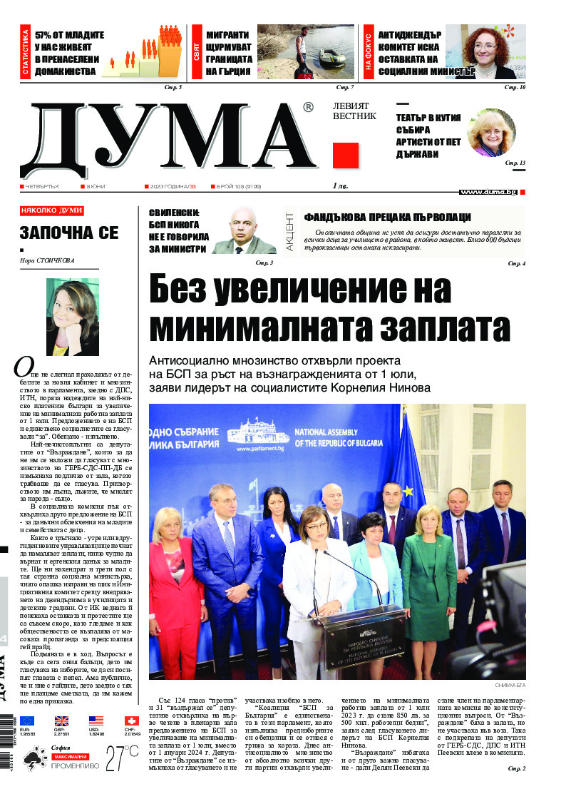 АБОНАМЕНТ за вестник „ДУМА“ за 2026 година. Можете да се абонирате в: „Български пощи“ АД до 15 декември 2025 г., „Доби прес“ ЕООД до 28 декември 2025 г., в редакцията на вестника до 20 декември 2025 г. Каталожен номер 6. Цени: 12 месеца - 149 € / 291,42 лв., 6 месеца - 75 € / 146,69 лв., 3 месеца - 40 € / 78,23 лв., 1 месец - 14 € / 27,38 лв. За повече информация тел. 02 9705 203 и 02 9705 216 отдел „Разпространение” на в-к ДУМА на ул. „Позитано” 20 А. E-mail: abonament@duma.bg АБОНАМЕНТ за вестник „ДУМА“ за 2026 година. Можете да се абонирате в: „Български пощи“ АД до 15 декември 2025 г., „Доби прес“ ЕООД до 28 декември 2025 г., в редакцията на вестника до 20 декември 2025 г. Каталожен номер 6. Цени: 12 месеца - 149 € / 291,42 лв., 6 месеца - 75 € / 146,69 лв., 3 месеца - 40 € / 78,23 лв., 1 месец - 14 € / 27,38 лв. За повече информация тел. 02 9705 203 и 02 9705 216 отдел „Разпространение” на в-к ДУМА на ул. „Позитано” 20 А. E-mail: abonament@duma.bg
