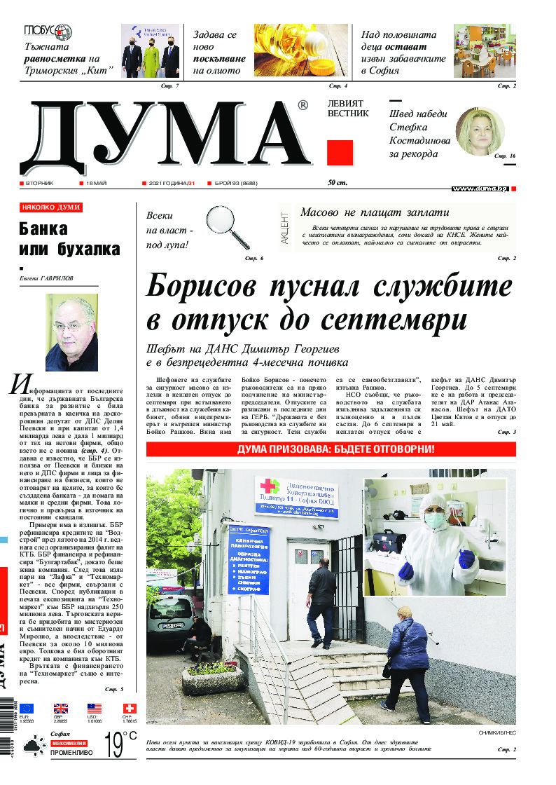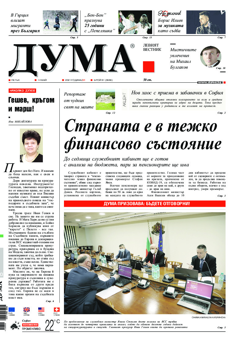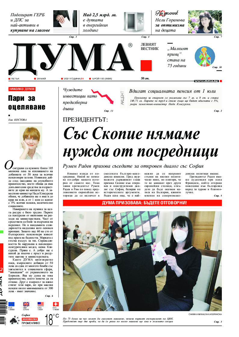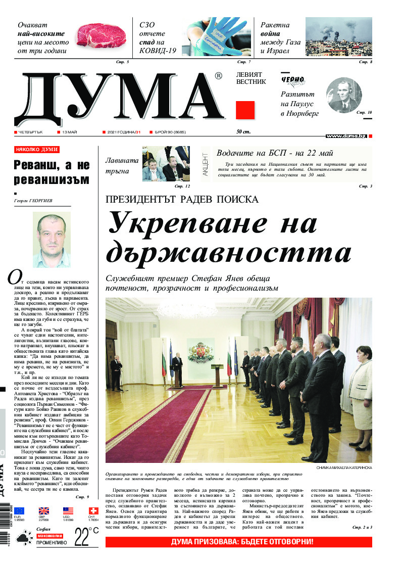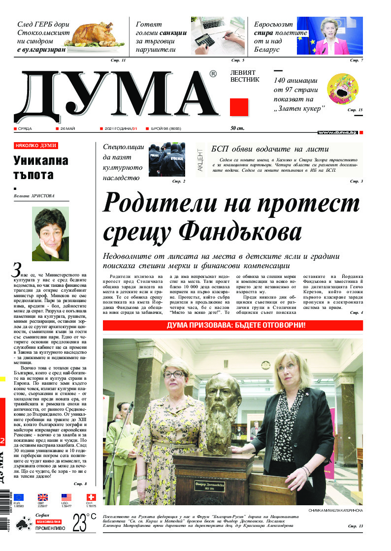 АБОНАМЕНТ за вестник „ДУМА“ за 2026 година. Можете да се абонирате в: „Български пощи“ АД до 15 декември 2025 г., „Доби прес“ ЕООД до 28 декември 2025 г., в редакцията на вестника до 20 декември 2025 г. Каталожен номер 6. Цени: 12 месеца - 149 € / 291,42 лв., 6 месеца - 75 € / 146,69 лв., 3 месеца - 40 € / 78,23 лв., 1 месец - 14 € / 27,38 лв. За повече информация тел. 02 9705 203 и 02 9705 216 отдел „Разпространение” на в-к ДУМА на ул. „Позитано” 20 А. E-mail: abonament@duma.bg АБОНАМЕНТ за вестник „ДУМА“ за 2026 година. Можете да се абонирате в: „Български пощи“ АД до 15 декември 2025 г., „Доби прес“ ЕООД до 28 декември 2025 г., в редакцията на вестника до 20 декември 2025 г. Каталожен номер 6. Цени: 12 месеца - 149 € / 291,42 лв., 6 месеца - 75 € / 146,69 лв., 3 месеца - 40 € / 78,23 лв., 1 месец - 14 € / 27,38 лв. За повече информация тел. 02 9705 203 и 02 9705 216 отдел „Разпространение” на в-к ДУМА на ул. „Позитано” 20 А. E-mail: abonament@duma.bg