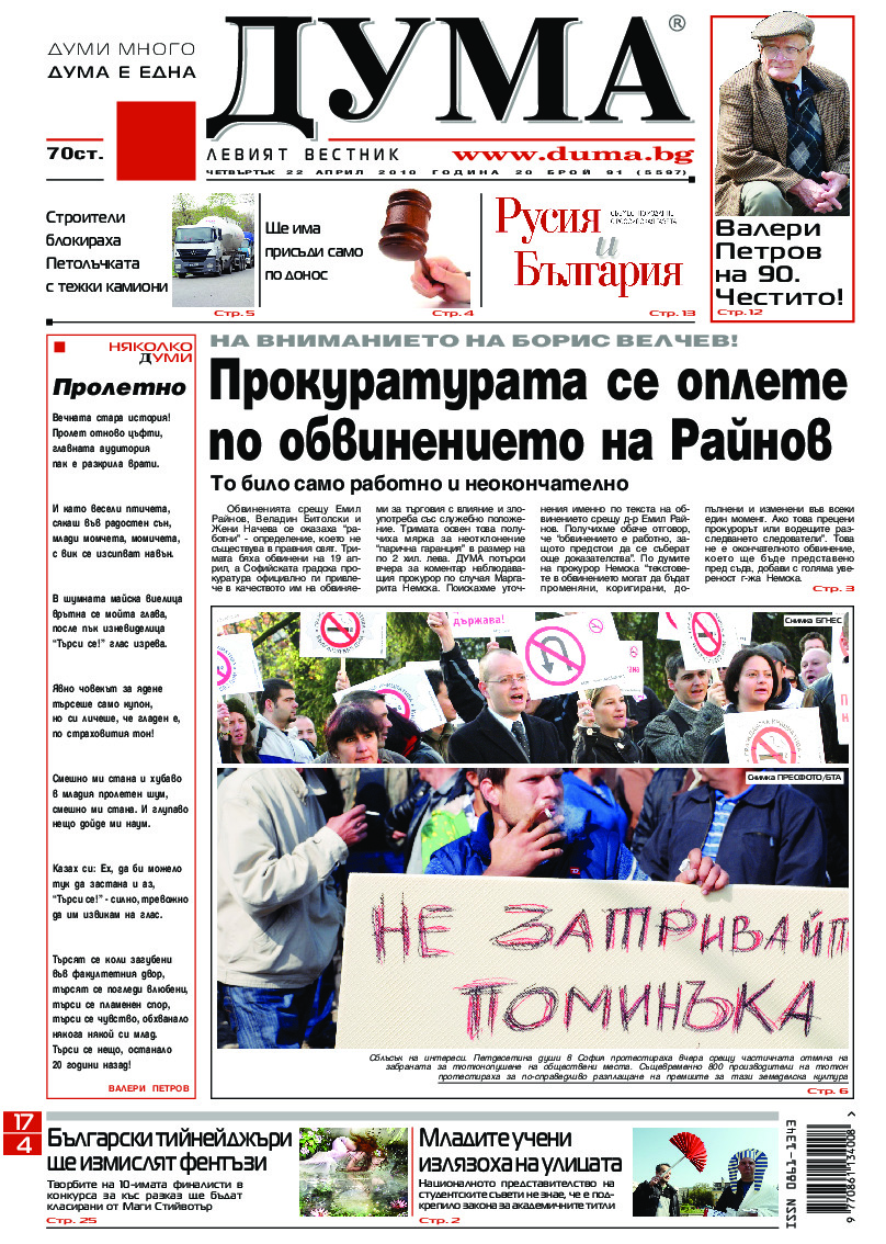 АБОНАМЕНТ за вестник „ДУМА“ за 2026 година. Можете да се абонирате в: „Български пощи“ АД до 15 декември 2025 г., „Доби прес“ ЕООД до 28 декември 2025 г., в редакцията на вестника до 20 декември 2025 г. Каталожен номер 6. Цени: 12 месеца - 149 € / 291,42 лв., 6 месеца - 75 € / 146,69 лв., 3 месеца - 40 € / 78,23 лв., 1 месец - 14 € / 27,38 лв. За повече информация тел. 02 9705 203 и 02 9705 216 отдел „Разпространение” на в-к ДУМА на ул. „Позитано” 20 А. E-mail: abonament@duma.bg АБОНАМЕНТ за вестник „ДУМА“ за 2026 година. Можете да се абонирате в: „Български пощи“ АД до 15 декември 2025 г., „Доби прес“ ЕООД до 28 декември 2025 г., в редакцията на вестника до 20 декември 2025 г. Каталожен номер 6. Цени: 12 месеца - 149 € / 291,42 лв., 6 месеца - 75 € / 146,69 лв., 3 месеца - 40 € / 78,23 лв., 1 месец - 14 € / 27,38 лв. За повече информация тел. 02 9705 203 и 02 9705 216 отдел „Разпространение” на в-к ДУМА на ул. „Позитано” 20 А. E-mail: abonament@duma.bg
