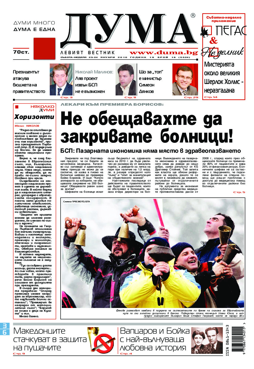 АБОНАМЕНТ за вестник „ДУМА“ за 2026 година. Можете да се абонирате в: „Български пощи“ АД до 15 декември 2025 г., „Доби прес“ ЕООД до 28 декември 2025 г., в редакцията на вестника до 20 декември 2025 г. Каталожен номер 6. Цени: 12 месеца - 149 € / 291,42 лв., 6 месеца - 75 € / 146,69 лв., 3 месеца - 40 € / 78,23 лв., 1 месец - 14 € / 27,38 лв. За повече информация тел. 02 9705 203 и 02 9705 216 отдел „Разпространение” на в-к ДУМА на ул. „Позитано” 20 А. E-mail: abonament@duma.bg АБОНАМЕНТ за вестник „ДУМА“ за 2026 година. Можете да се абонирате в: „Български пощи“ АД до 15 декември 2025 г., „Доби прес“ ЕООД до 28 декември 2025 г., в редакцията на вестника до 20 декември 2025 г. Каталожен номер 6. Цени: 12 месеца - 149 € / 291,42 лв., 6 месеца - 75 € / 146,69 лв., 3 месеца - 40 € / 78,23 лв., 1 месец - 14 € / 27,38 лв. За повече информация тел. 02 9705 203 и 02 9705 216 отдел „Разпространение” на в-к ДУМА на ул. „Позитано” 20 А. E-mail: abonament@duma.bg