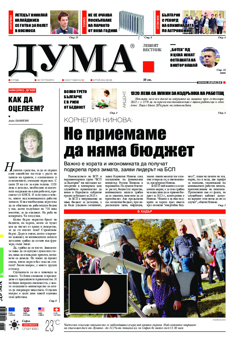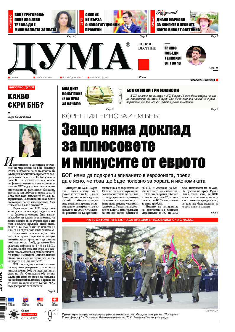 АБОНАМЕНТ за вестник „ДУМА“ за 2026 година. Можете да се абонирате в: „Български пощи“ АД до 15 декември 2025 г., „Доби прес“ ЕООД до 28 декември 2025 г., в редакцията на вестника до 20 декември 2025 г. Каталожен номер 6. Цени: 12 месеца - 149 € / 291,42 лв., 6 месеца - 75 € / 146,69 лв., 3 месеца - 40 € / 78,23 лв., 1 месец - 14 € / 27,38 лв. За повече информация тел. 02 9705 203 и 02 9705 216 отдел „Разпространение” на в-к ДУМА на ул. „Позитано” 20 А. E-mail: abonament@duma.bg АБОНАМЕНТ за вестник „ДУМА“ за 2026 година. Можете да се абонирате в: „Български пощи“ АД до 15 декември 2025 г., „Доби прес“ ЕООД до 28 декември 2025 г., в редакцията на вестника до 20 декември 2025 г. Каталожен номер 6. Цени: 12 месеца - 149 € / 291,42 лв., 6 месеца - 75 € / 146,69 лв., 3 месеца - 40 € / 78,23 лв., 1 месец - 14 € / 27,38 лв. За повече информация тел. 02 9705 203 и 02 9705 216 отдел „Разпространение” на в-к ДУМА на ул. „Позитано” 20 А. E-mail: abonament@duma.bg