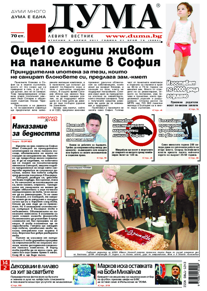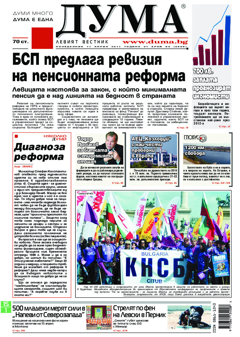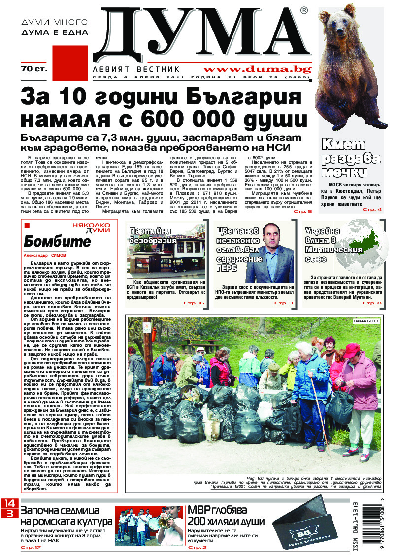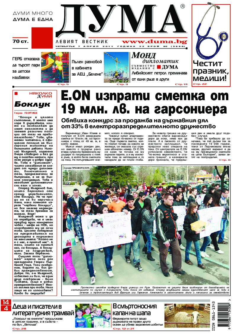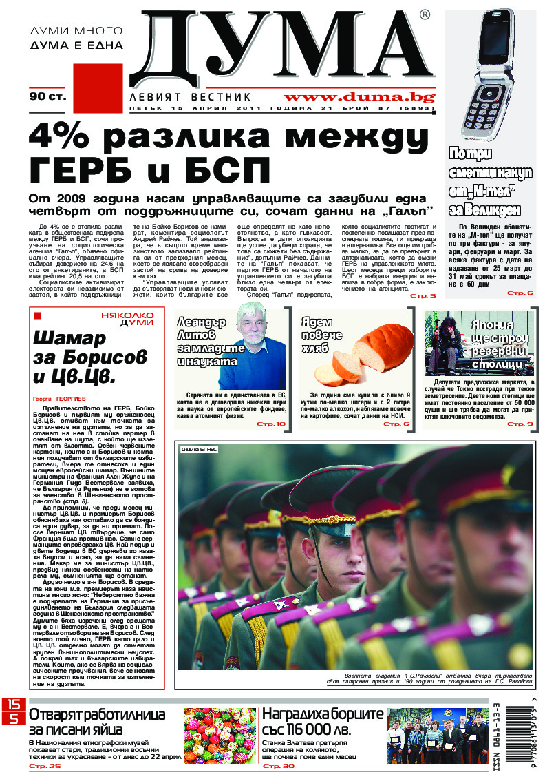 АБОНАМЕНТ за вестник „ДУМА“ за 2026 година. Можете да се абонирате в: „Български пощи“ АД до 15 декември 2025 г., „Доби прес“ ЕООД до 28 декември 2025 г., в редакцията на вестника до 20 декември 2025 г. Каталожен номер 6. Цени: 12 месеца - 149 € / 291,42 лв., 6 месеца - 75 € / 146,69 лв., 3 месеца - 40 € / 78,23 лв., 1 месец - 14 € / 27,38 лв. За повече информация тел. 02 9705 203 и 02 9705 216 отдел „Разпространение” на в-к ДУМА на ул. „Позитано” 20 А. E-mail: abonament@duma.bg АБОНАМЕНТ за вестник „ДУМА“ за 2026 година. Можете да се абонирате в: „Български пощи“ АД до 15 декември 2025 г., „Доби прес“ ЕООД до 28 декември 2025 г., в редакцията на вестника до 20 декември 2025 г. Каталожен номер 6. Цени: 12 месеца - 149 € / 291,42 лв., 6 месеца - 75 € / 146,69 лв., 3 месеца - 40 € / 78,23 лв., 1 месец - 14 € / 27,38 лв. За повече информация тел. 02 9705 203 и 02 9705 216 отдел „Разпространение” на в-к ДУМА на ул. „Позитано” 20 А. E-mail: abonament@duma.bg