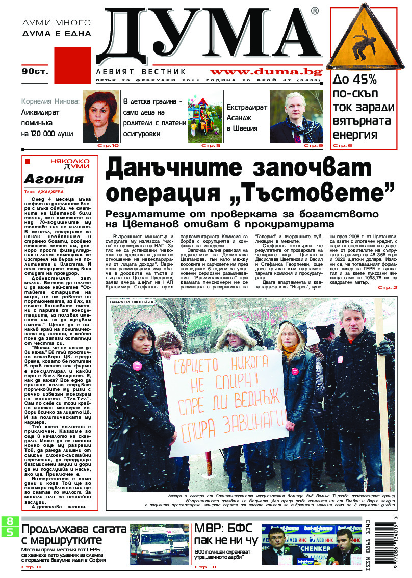 АБОНАМЕНТ за вестник „ДУМА“ за 2026 година. Можете да се абонирате в: „Български пощи“ АД до 15 декември 2025 г., „Доби прес“ ЕООД до 28 декември 2025 г., в редакцията на вестника до 20 декември 2025 г. Каталожен номер 6. Цени: 12 месеца - 149 € / 291,42 лв., 6 месеца - 75 € / 146,69 лв., 3 месеца - 40 € / 78,23 лв., 1 месец - 14 € / 27,38 лв. За повече информация тел. 02 9705 203 и 02 9705 216 отдел „Разпространение” на в-к ДУМА на ул. „Позитано” 20 А. E-mail: abonament@duma.bg АБОНАМЕНТ за вестник „ДУМА“ за 2026 година. Можете да се абонирате в: „Български пощи“ АД до 15 декември 2025 г., „Доби прес“ ЕООД до 28 декември 2025 г., в редакцията на вестника до 20 декември 2025 г. Каталожен номер 6. Цени: 12 месеца - 149 € / 291,42 лв., 6 месеца - 75 € / 146,69 лв., 3 месеца - 40 € / 78,23 лв., 1 месец - 14 € / 27,38 лв. За повече информация тел. 02 9705 203 и 02 9705 216 отдел „Разпространение” на в-к ДУМА на ул. „Позитано” 20 А. E-mail: abonament@duma.bg