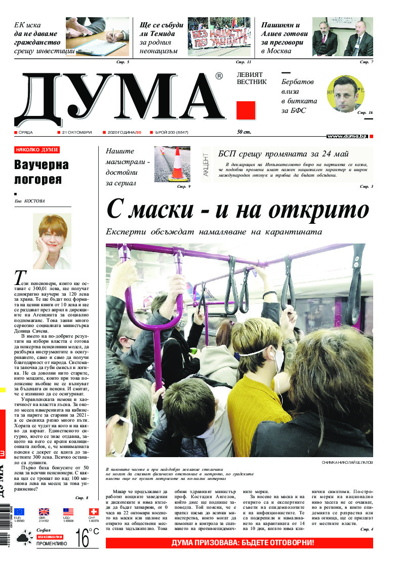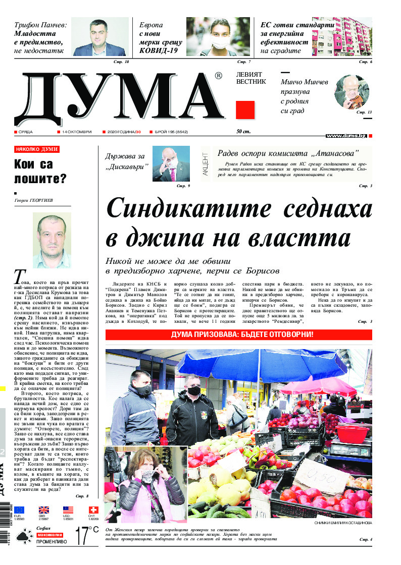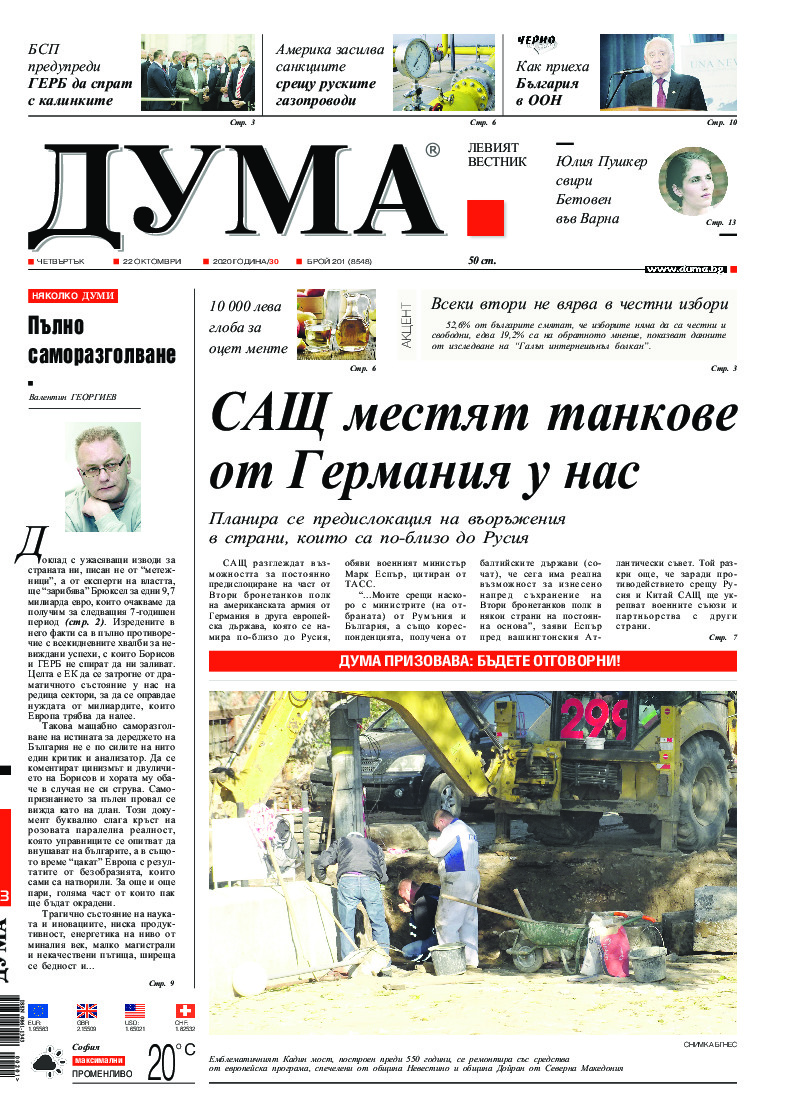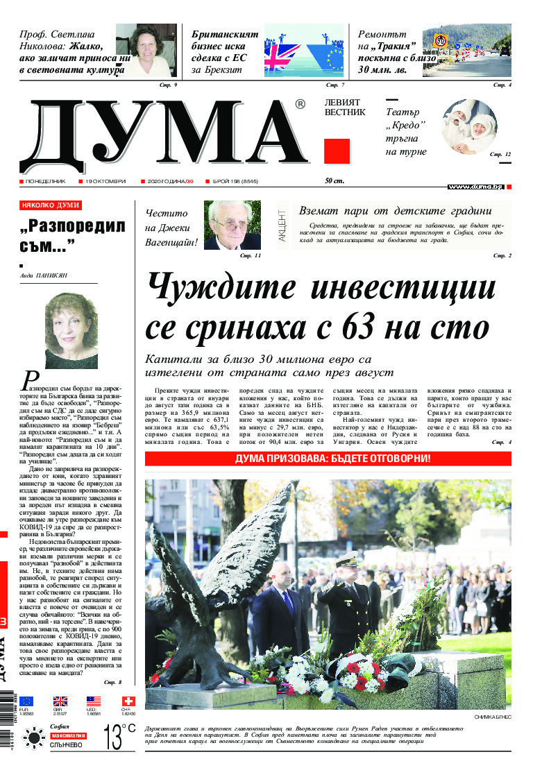 АБОНАМЕНТ за вестник „ДУМА“ за 2026 година. Можете да се абонирате в: „Български пощи“ АД до 15 декември 2025 г., „Доби прес“ ЕООД до 28 декември 2025 г., в редакцията на вестника до 20 декември 2025 г. Каталожен номер 6. Цени: 12 месеца - 149 € / 291,42 лв., 6 месеца - 75 € / 146,69 лв., 3 месеца - 40 € / 78,23 лв., 1 месец - 14 € / 27,38 лв. За повече информация тел. 02 9705 203 и 02 9705 216 отдел „Разпространение” на в-к ДУМА на ул. „Позитано” 20 А. E-mail: abonament@duma.bg АБОНАМЕНТ за вестник „ДУМА“ за 2026 година. Можете да се абонирате в: „Български пощи“ АД до 15 декември 2025 г., „Доби прес“ ЕООД до 28 декември 2025 г., в редакцията на вестника до 20 декември 2025 г. Каталожен номер 6. Цени: 12 месеца - 149 € / 291,42 лв., 6 месеца - 75 € / 146,69 лв., 3 месеца - 40 € / 78,23 лв., 1 месец - 14 € / 27,38 лв. За повече информация тел. 02 9705 203 и 02 9705 216 отдел „Разпространение” на в-к ДУМА на ул. „Позитано” 20 А. E-mail: abonament@duma.bg