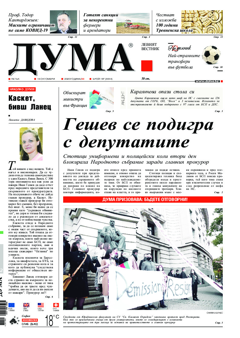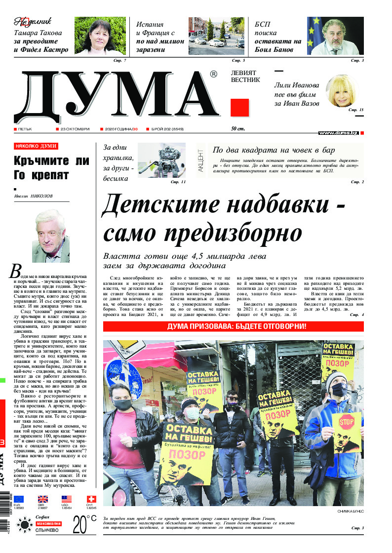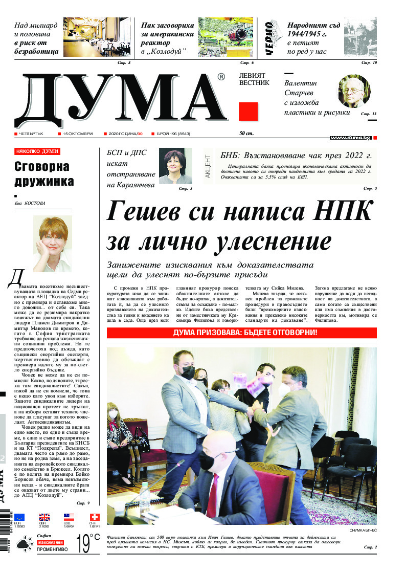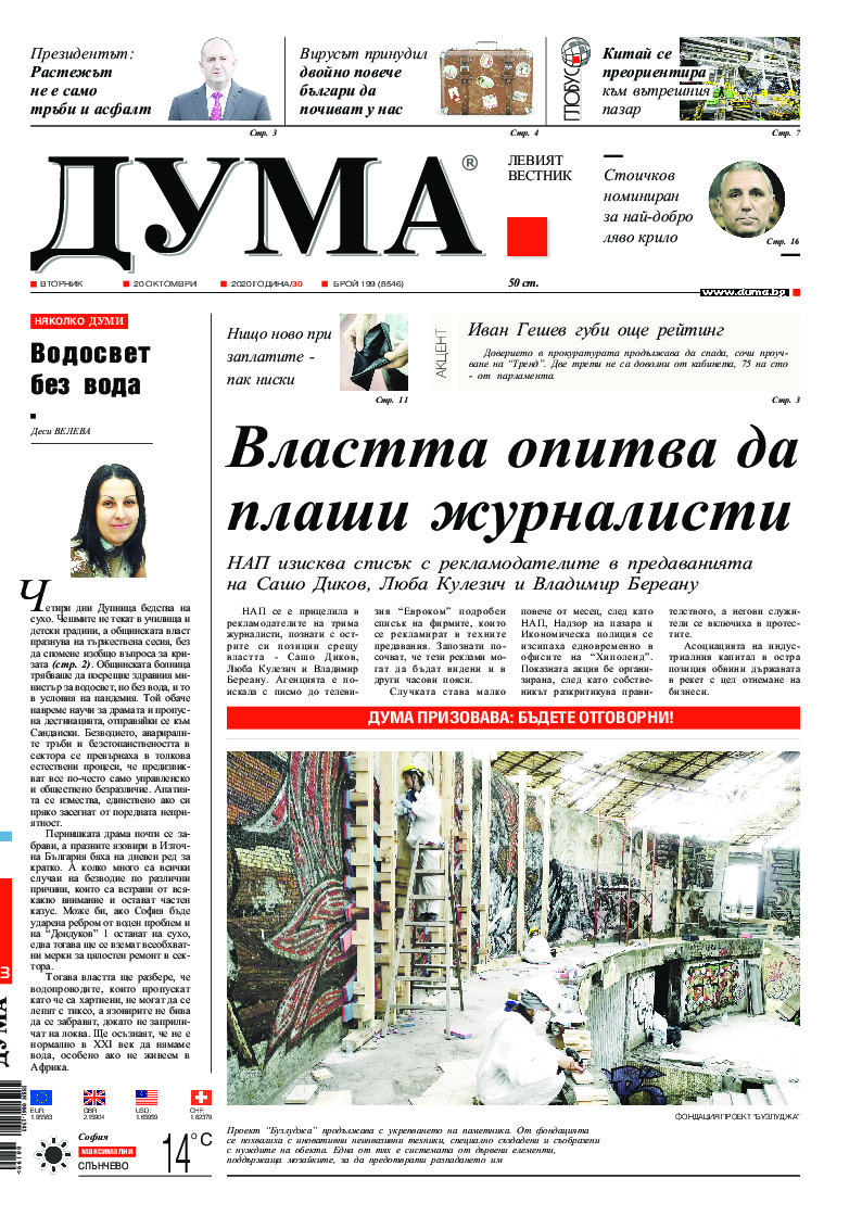 АБОНАМЕНТ за вестник „ДУМА“ за 2026 година. Можете да се абонирате в: „Български пощи“ АД до 15 декември 2025 г., „Доби прес“ ЕООД до 28 декември 2025 г., в редакцията на вестника до 20 декември 2025 г. Каталожен номер 6. Цени: 12 месеца - 149 € / 291,42 лв., 6 месеца - 75 € / 146,69 лв., 3 месеца - 40 € / 78,23 лв., 1 месец - 14 € / 27,38 лв. За повече информация тел. 02 9705 203 и 02 9705 216 отдел „Разпространение” на в-к ДУМА на ул. „Позитано” 20 А. E-mail: abonament@duma.bg АБОНАМЕНТ за вестник „ДУМА“ за 2026 година. Можете да се абонирате в: „Български пощи“ АД до 15 декември 2025 г., „Доби прес“ ЕООД до 28 декември 2025 г., в редакцията на вестника до 20 декември 2025 г. Каталожен номер 6. Цени: 12 месеца - 149 € / 291,42 лв., 6 месеца - 75 € / 146,69 лв., 3 месеца - 40 € / 78,23 лв., 1 месец - 14 € / 27,38 лв. За повече информация тел. 02 9705 203 и 02 9705 216 отдел „Разпространение” на в-к ДУМА на ул. „Позитано” 20 А. E-mail: abonament@duma.bg