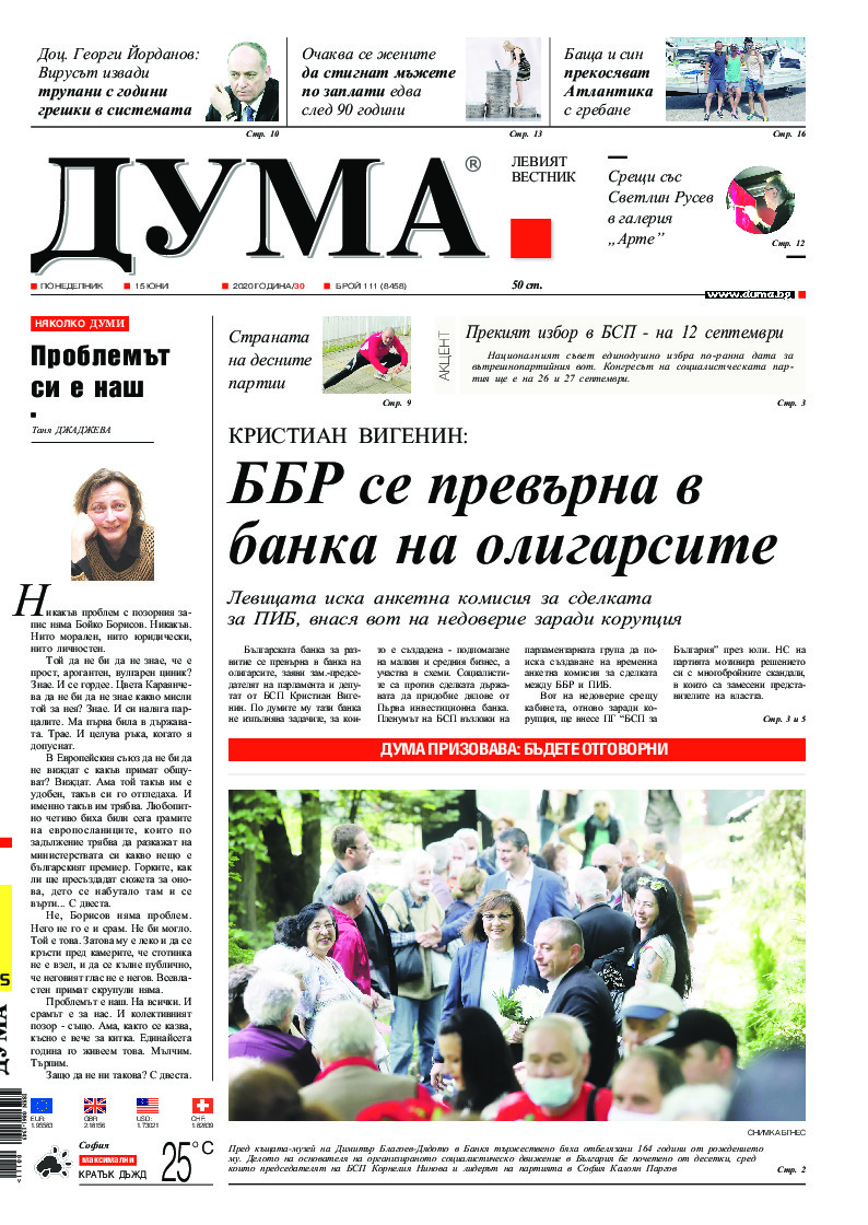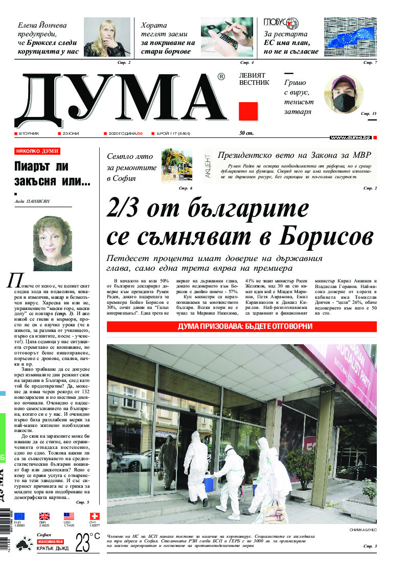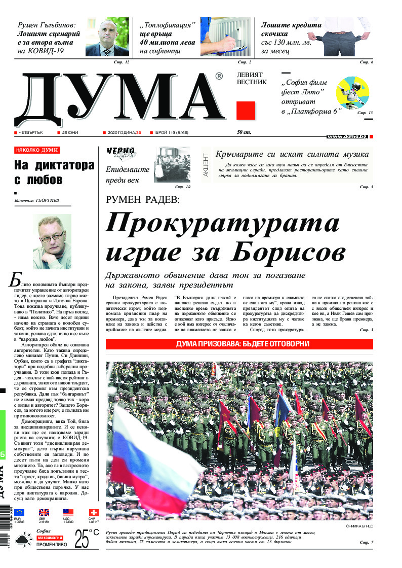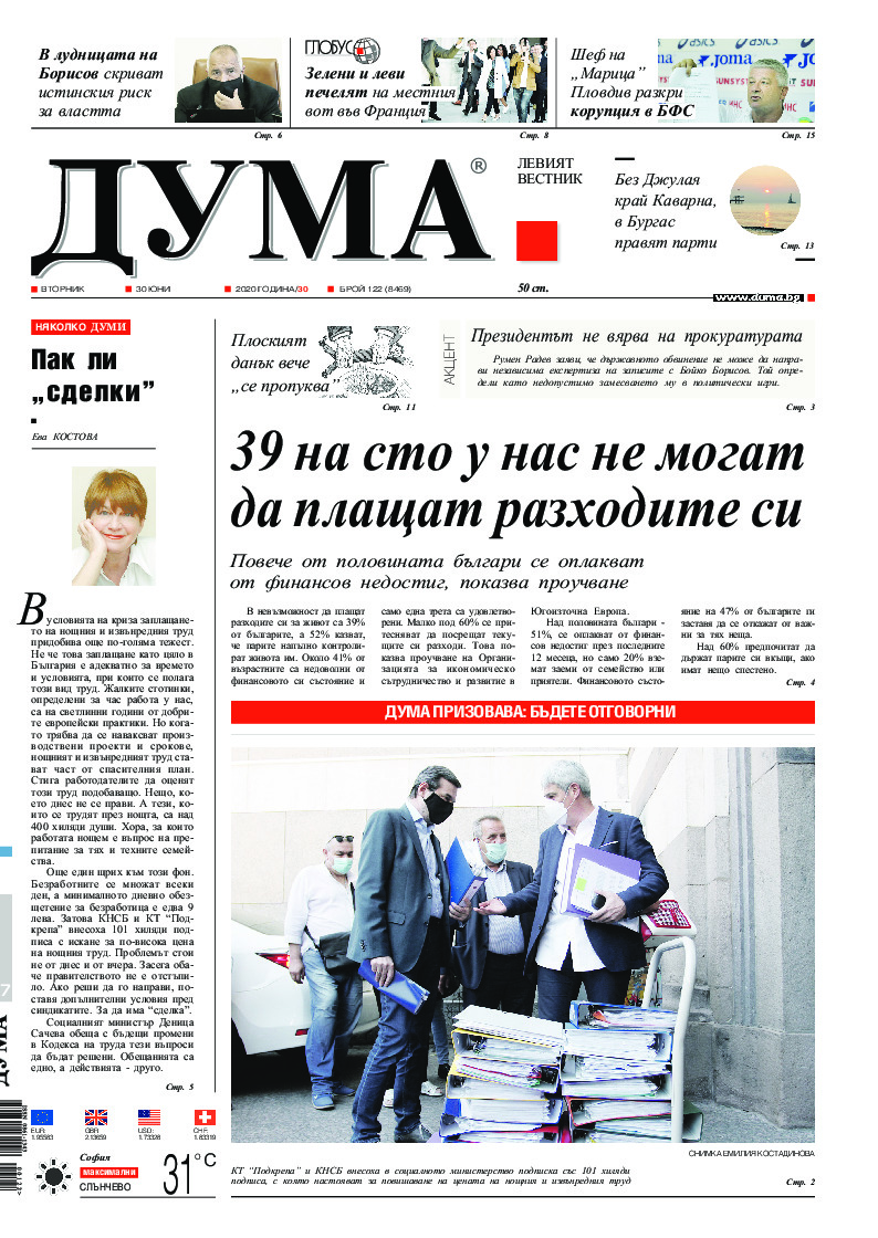 АБОНАМЕНТ за вестник „ДУМА“ за 2026 година. Можете да се абонирате в: „Български пощи“ АД до 15 декември 2025 г., „Доби прес“ ЕООД до 28 декември 2025 г., в редакцията на вестника до 20 декември 2025 г. Каталожен номер 6. Цени: 12 месеца - 149 € / 291,42 лв., 6 месеца - 75 € / 146,69 лв., 3 месеца - 40 € / 78,23 лв., 1 месец - 14 € / 27,38 лв. За повече информация тел. 02 9705 203 и 02 9705 216 отдел „Разпространение” на в-к ДУМА на ул. „Позитано” 20 А. E-mail: abonament@duma.bg АБОНАМЕНТ за вестник „ДУМА“ за 2026 година. Можете да се абонирате в: „Български пощи“ АД до 15 декември 2025 г., „Доби прес“ ЕООД до 28 декември 2025 г., в редакцията на вестника до 20 декември 2025 г. Каталожен номер 6. Цени: 12 месеца - 149 € / 291,42 лв., 6 месеца - 75 € / 146,69 лв., 3 месеца - 40 € / 78,23 лв., 1 месец - 14 € / 27,38 лв. За повече информация тел. 02 9705 203 и 02 9705 216 отдел „Разпространение” на в-к ДУМА на ул. „Позитано” 20 А. E-mail: abonament@duma.bg