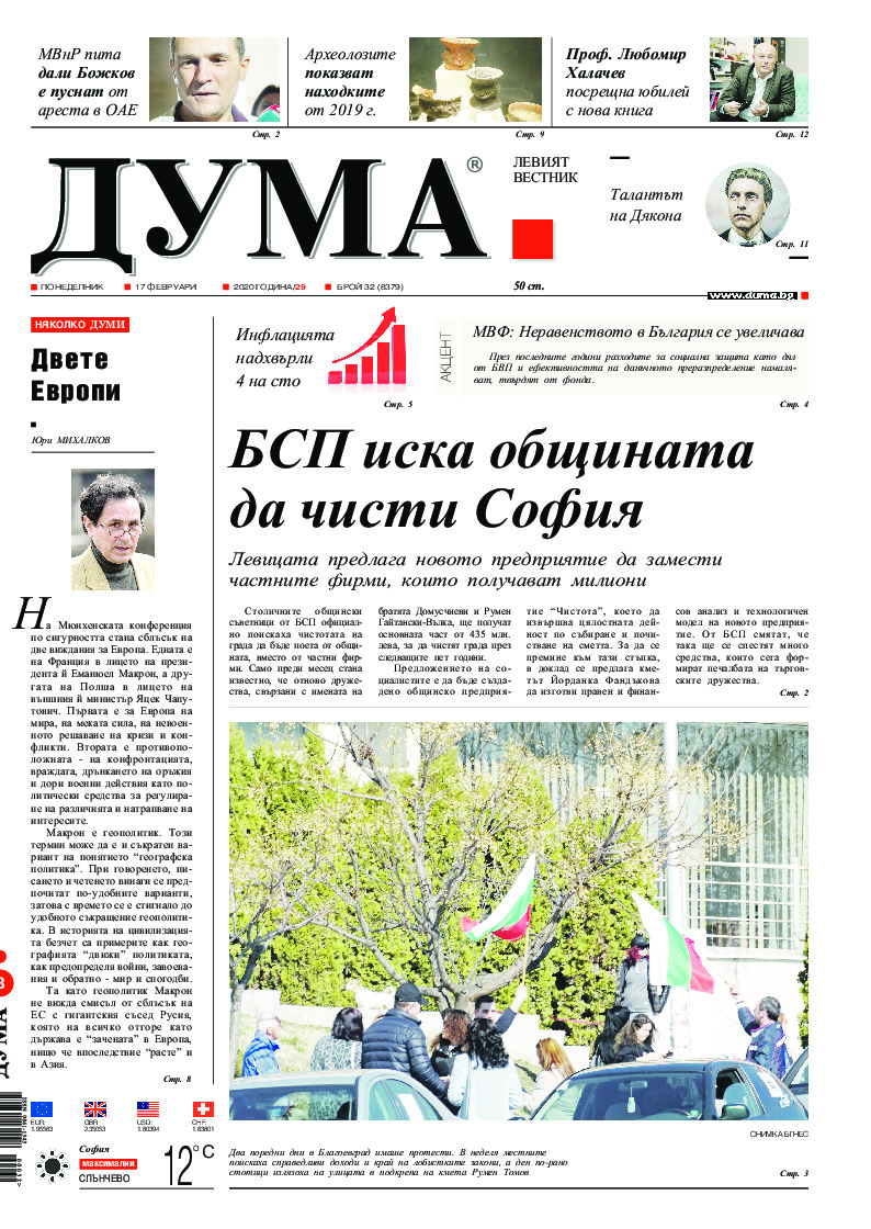 АБОНАМЕНТ за вестник „ДУМА“ за 2026 година. Можете да се абонирате в: „Български пощи“ АД до 15 декември 2025 г., „Доби прес“ ЕООД до 28 декември 2025 г., в редакцията на вестника до 20 декември 2025 г. Каталожен номер 6. Цени: 12 месеца - 149 € / 291,42 лв., 6 месеца - 75 € / 146,69 лв., 3 месеца - 40 € / 78,23 лв., 1 месец - 14 € / 27,38 лв. За повече информация тел. 02 9705 203 и 02 9705 216 отдел „Разпространение” на в-к ДУМА на ул. „Позитано” 20 А. E-mail: abonament@duma.bg АБОНАМЕНТ за вестник „ДУМА“ за 2026 година. Можете да се абонирате в: „Български пощи“ АД до 15 декември 2025 г., „Доби прес“ ЕООД до 28 декември 2025 г., в редакцията на вестника до 20 декември 2025 г. Каталожен номер 6. Цени: 12 месеца - 149 € / 291,42 лв., 6 месеца - 75 € / 146,69 лв., 3 месеца - 40 € / 78,23 лв., 1 месец - 14 € / 27,38 лв. За повече информация тел. 02 9705 203 и 02 9705 216 отдел „Разпространение” на в-к ДУМА на ул. „Позитано” 20 А. E-mail: abonament@duma.bg