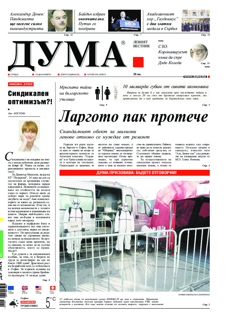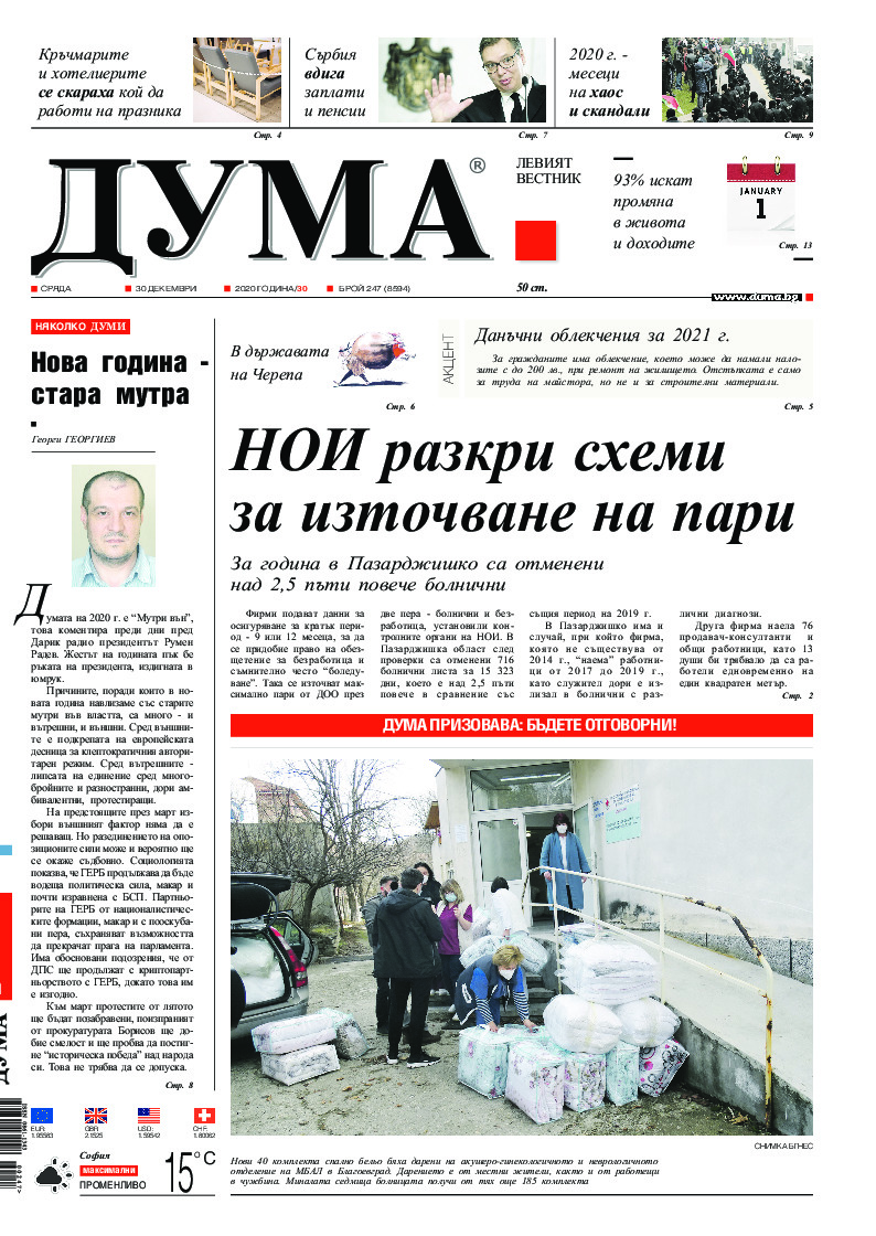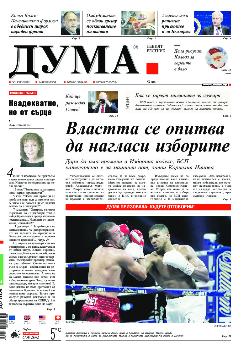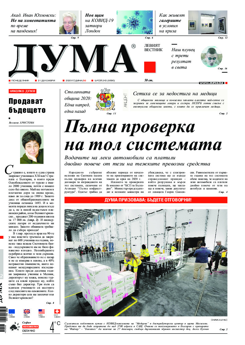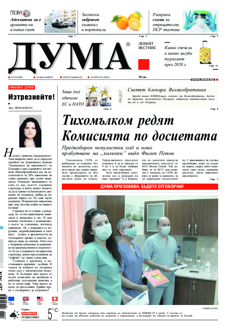 АБОНАМЕНТ за вестник „ДУМА“ за 2026 година. Можете да се абонирате в: „Български пощи“ АД до 15 декември 2025 г., „Доби прес“ ЕООД до 28 декември 2025 г., в редакцията на вестника до 20 декември 2025 г. Каталожен номер 6. Цени: 12 месеца - 149 € / 291,42 лв., 6 месеца - 75 € / 146,69 лв., 3 месеца - 40 € / 78,23 лв., 1 месец - 14 € / 27,38 лв. За повече информация тел. 02 9705 203 и 02 9705 216 отдел „Разпространение” на в-к ДУМА на ул. „Позитано” 20 А. E-mail: abonament@duma.bg АБОНАМЕНТ за вестник „ДУМА“ за 2026 година. Можете да се абонирате в: „Български пощи“ АД до 15 декември 2025 г., „Доби прес“ ЕООД до 28 декември 2025 г., в редакцията на вестника до 20 декември 2025 г. Каталожен номер 6. Цени: 12 месеца - 149 € / 291,42 лв., 6 месеца - 75 € / 146,69 лв., 3 месеца - 40 € / 78,23 лв., 1 месец - 14 € / 27,38 лв. За повече информация тел. 02 9705 203 и 02 9705 216 отдел „Разпространение” на в-к ДУМА на ул. „Позитано” 20 А. E-mail: abonament@duma.bg