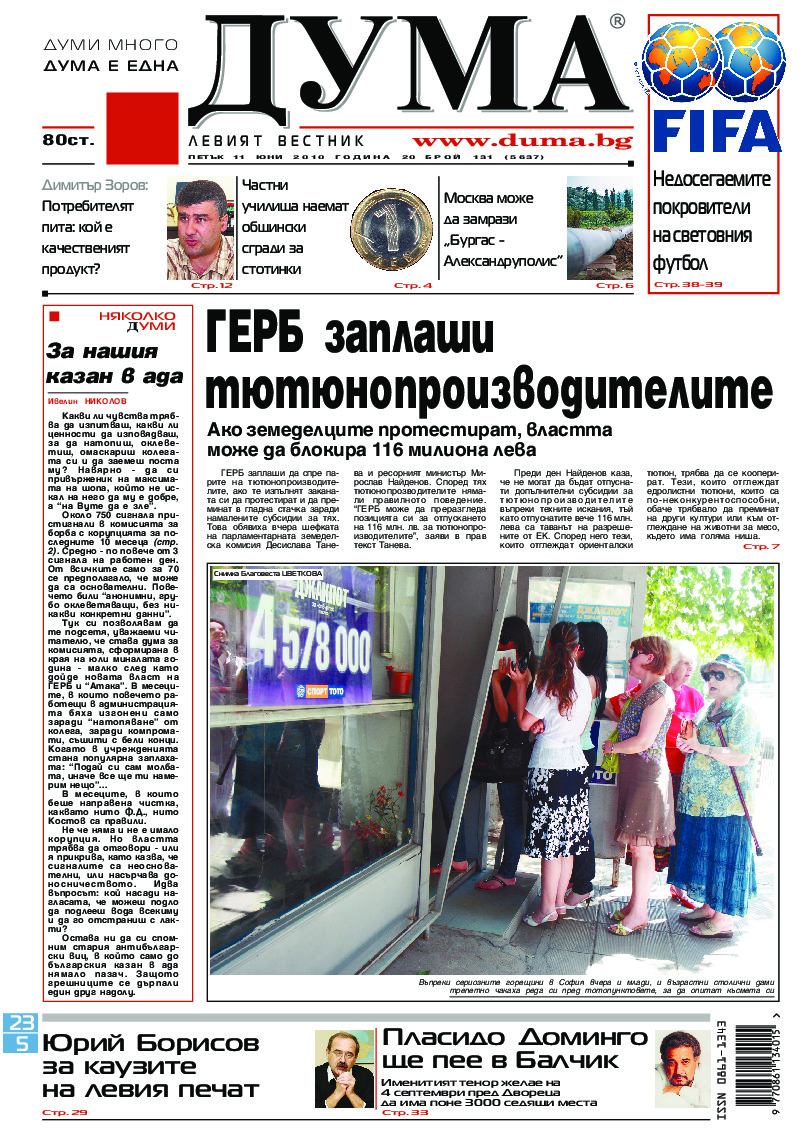 АБОНАМЕНТ за вестник „ДУМА“ за 2026 година. Можете да се абонирате в: „Български пощи“ АД до 15 декември 2025 г., „Доби прес“ ЕООД до 28 декември 2025 г., в редакцията на вестника до 20 декември 2025 г. Каталожен номер 6. Цени: 12 месеца - 149 € / 291,42 лв., 6 месеца - 75 € / 146,69 лв., 3 месеца - 40 € / 78,23 лв., 1 месец - 14 € / 27,38 лв. За повече информация тел. 02 9705 203 и 02 9705 216 отдел „Разпространение” на в-к ДУМА на ул. „Позитано” 20 А. E-mail: abonament@duma.bg АБОНАМЕНТ за вестник „ДУМА“ за 2026 година. Можете да се абонирате в: „Български пощи“ АД до 15 декември 2025 г., „Доби прес“ ЕООД до 28 декември 2025 г., в редакцията на вестника до 20 декември 2025 г. Каталожен номер 6. Цени: 12 месеца - 149 € / 291,42 лв., 6 месеца - 75 € / 146,69 лв., 3 месеца - 40 € / 78,23 лв., 1 месец - 14 € / 27,38 лв. За повече информация тел. 02 9705 203 и 02 9705 216 отдел „Разпространение” на в-к ДУМА на ул. „Позитано” 20 А. E-mail: abonament@duma.bg
