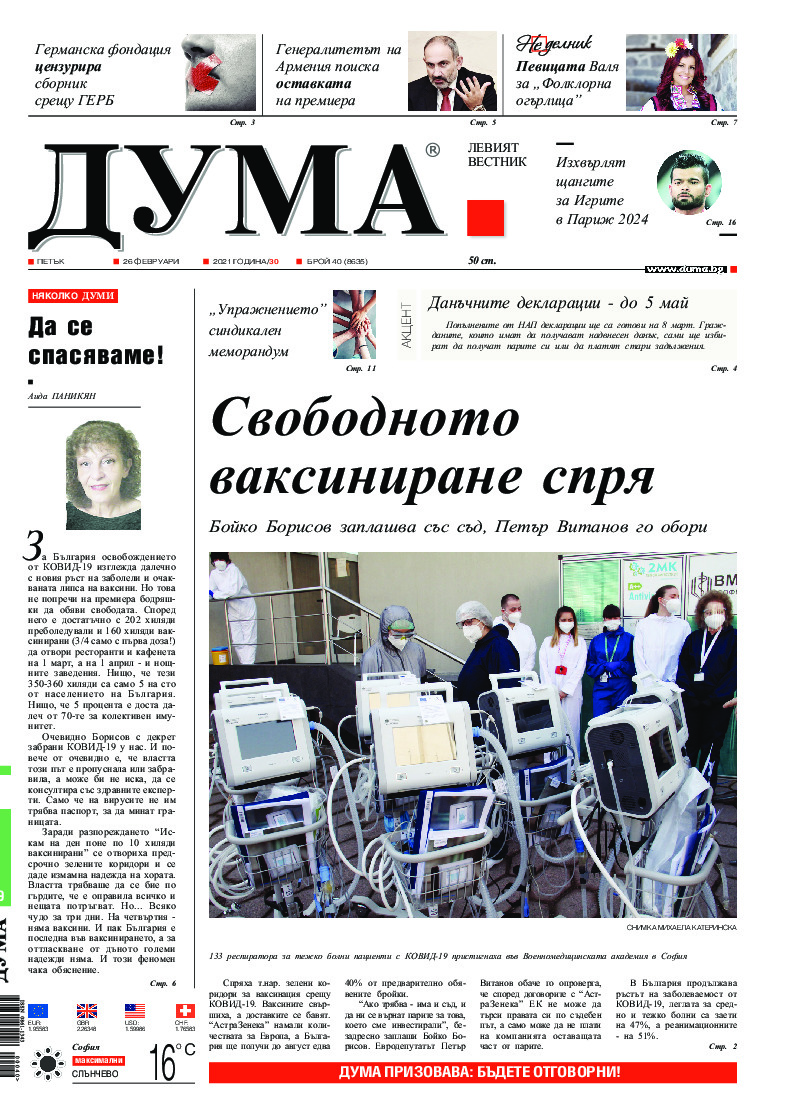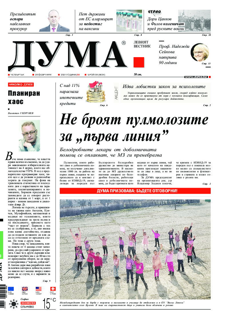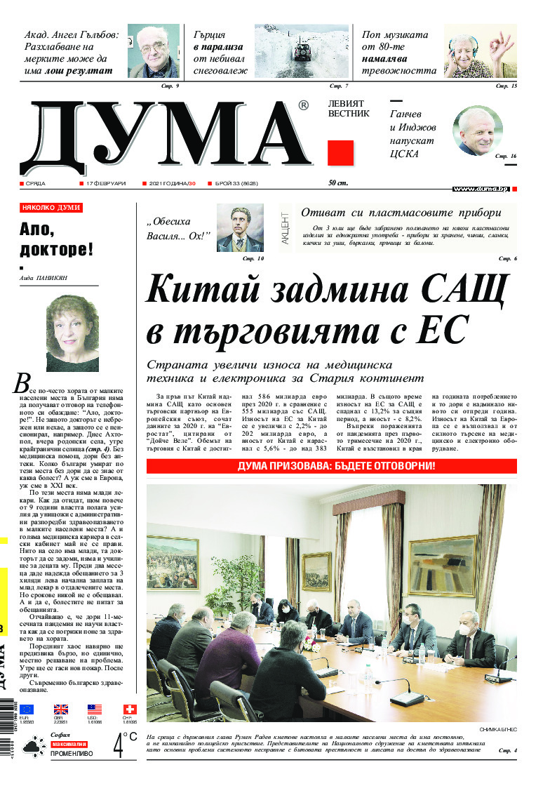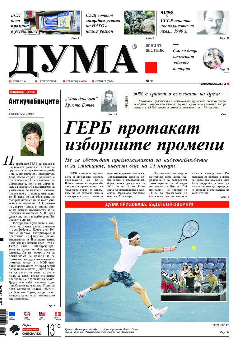 АБОНАМЕНТ за вестник „ДУМА“ за 2026 година. Можете да се абонирате в: „Български пощи“ АД до 15 декември 2025 г., „Доби прес“ ЕООД до 28 декември 2025 г., в редакцията на вестника до 20 декември 2025 г. Каталожен номер 6. Цени: 12 месеца - 149 € / 291,42 лв., 6 месеца - 75 € / 146,69 лв., 3 месеца - 40 € / 78,23 лв., 1 месец - 14 € / 27,38 лв. За повече информация тел. 02 9705 203 и 02 9705 216 отдел „Разпространение” на в-к ДУМА на ул. „Позитано” 20 А. E-mail: abonament@duma.bg АБОНАМЕНТ за вестник „ДУМА“ за 2026 година. Можете да се абонирате в: „Български пощи“ АД до 15 декември 2025 г., „Доби прес“ ЕООД до 28 декември 2025 г., в редакцията на вестника до 20 декември 2025 г. Каталожен номер 6. Цени: 12 месеца - 149 € / 291,42 лв., 6 месеца - 75 € / 146,69 лв., 3 месеца - 40 € / 78,23 лв., 1 месец - 14 € / 27,38 лв. За повече информация тел. 02 9705 203 и 02 9705 216 отдел „Разпространение” на в-к ДУМА на ул. „Позитано” 20 А. E-mail: abonament@duma.bg