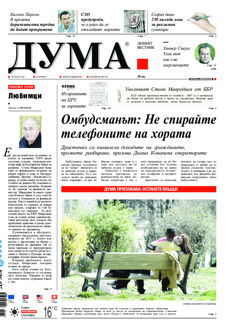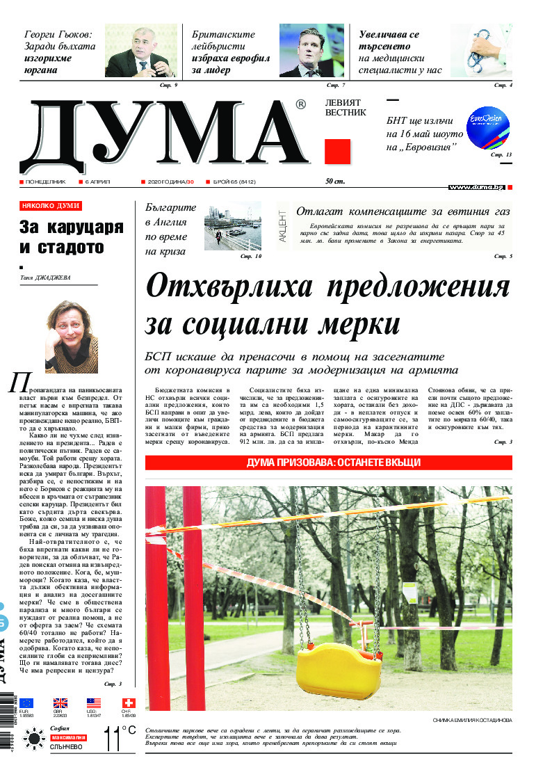 АБОНАМЕНТ за вестник „ДУМА“ за 2026 година. Можете да се абонирате в: „Български пощи“ АД до 15 декември 2025 г., „Доби прес“ ЕООД до 28 декември 2025 г., в редакцията на вестника до 20 декември 2025 г. Каталожен номер 6. Цени: 12 месеца - 149 € / 291,42 лв., 6 месеца - 75 € / 146,69 лв., 3 месеца - 40 € / 78,23 лв., 1 месец - 14 € / 27,38 лв. За повече информация тел. 02 9705 203 и 02 9705 216 отдел „Разпространение” на в-к ДУМА на ул. „Позитано” 20 А. E-mail: abonament@duma.bg АБОНАМЕНТ за вестник „ДУМА“ за 2026 година. Можете да се абонирате в: „Български пощи“ АД до 15 декември 2025 г., „Доби прес“ ЕООД до 28 декември 2025 г., в редакцията на вестника до 20 декември 2025 г. Каталожен номер 6. Цени: 12 месеца - 149 € / 291,42 лв., 6 месеца - 75 € / 146,69 лв., 3 месеца - 40 € / 78,23 лв., 1 месец - 14 € / 27,38 лв. За повече информация тел. 02 9705 203 и 02 9705 216 отдел „Разпространение” на в-к ДУМА на ул. „Позитано” 20 А. E-mail: abonament@duma.bg