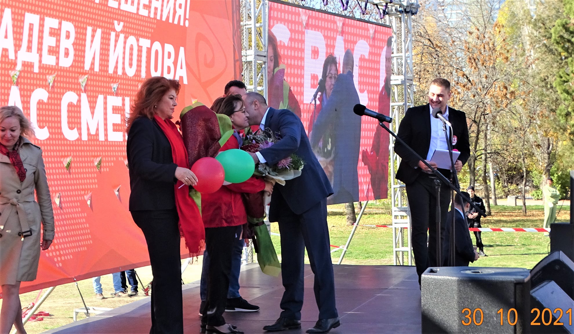 "Заедно с вас преди 5 години тръгнахме към победата и я постигнахме, когато малцина я очакваха. Аз съм щастлив, че от началото досега ние сме неразделни с един силен, опитен, стойностен човек - г-жа Йотова, член на БСП. Няма да ви предадем", заяви Радев пред симпатизантите и членовете на левицата. Председателят на БСП и водач на листата в 25-и МИР Корнелия Нинова припомни от сцената, че левицата разполага с план за изваждането на България от кризата. "За да стане това факт, най-голямото предизвикателство пред нас е парламент, стабилно мнозинство и редовно правителство. Сега не е време за партийци, а е време за държавници. Не е време за популизъм, а за отговорност и за смелост. Хората, които ще поемат управлението на страната, ще понесат много тежести, много удари, но ще останат в историята, ако успеят да преведат България и хората през трудностите. Вярвам, че ние от "БСП за България" сме тези хора - отговорни, смели, знаещи и можещи", увери тя.