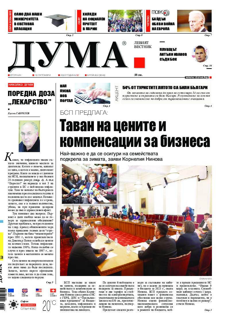 АБОНАМЕНТ за вестник „ДУМА“ за 2026 година. Можете да се абонирате в: „Български пощи“ АД до 15 декември 2025 г., „Доби прес“ ЕООД до 28 декември 2025 г., в редакцията на вестника до 20 декември 2025 г. Каталожен номер 6. Цени: 12 месеца - 149 € / 291,42 лв., 6 месеца - 75 € / 146,69 лв., 3 месеца - 40 € / 78,23 лв., 1 месец - 14 € / 27,38 лв. За повече информация тел. 02 9705 203 и 02 9705 216 отдел „Разпространение” на в-к ДУМА на ул. „Позитано” 20 А. E-mail: abonament@duma.bg АБОНАМЕНТ за вестник „ДУМА“ за 2026 година. Можете да се абонирате в: „Български пощи“ АД до 15 декември 2025 г., „Доби прес“ ЕООД до 28 декември 2025 г., в редакцията на вестника до 20 декември 2025 г. Каталожен номер 6. Цени: 12 месеца - 149 € / 291,42 лв., 6 месеца - 75 € / 146,69 лв., 3 месеца - 40 € / 78,23 лв., 1 месец - 14 € / 27,38 лв. За повече информация тел. 02 9705 203 и 02 9705 216 отдел „Разпространение” на в-к ДУМА на ул. „Позитано” 20 А. E-mail: abonament@duma.bg
