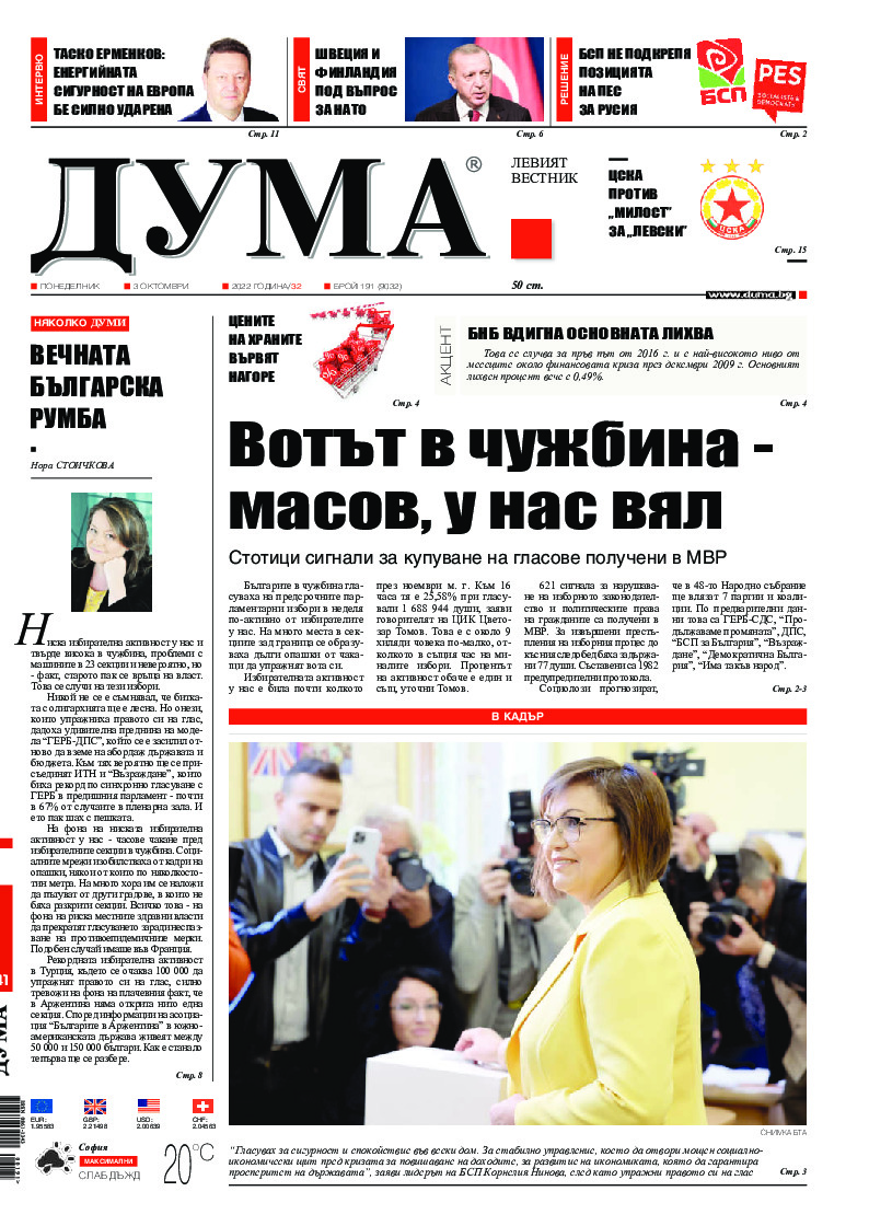 АБОНАМЕНТ за вестник „ДУМА“ за 2026 година. Можете да се абонирате в: „Български пощи“ АД до 15 декември 2025 г., „Доби прес“ ЕООД до 28 декември 2025 г., в редакцията на вестника до 20 декември 2025 г. Каталожен номер 6. Цени: 12 месеца - 149 € / 291,42 лв., 6 месеца - 75 € / 146,69 лв., 3 месеца - 40 € / 78,23 лв., 1 месец - 14 € / 27,38 лв. За повече информация тел. 02 9705 203 и 02 9705 216 отдел „Разпространение” на в-к ДУМА на ул. „Позитано” 20 А. E-mail: abonament@duma.bg АБОНАМЕНТ за вестник „ДУМА“ за 2026 година. Можете да се абонирате в: „Български пощи“ АД до 15 декември 2025 г., „Доби прес“ ЕООД до 28 декември 2025 г., в редакцията на вестника до 20 декември 2025 г. Каталожен номер 6. Цени: 12 месеца - 149 € / 291,42 лв., 6 месеца - 75 € / 146,69 лв., 3 месеца - 40 € / 78,23 лв., 1 месец - 14 € / 27,38 лв. За повече информация тел. 02 9705 203 и 02 9705 216 отдел „Разпространение” на в-к ДУМА на ул. „Позитано” 20 А. E-mail: abonament@duma.bg