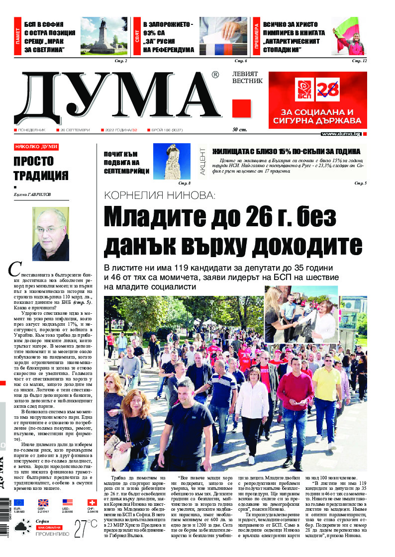 АБОНАМЕНТ за вестник „ДУМА“ за 2026 година. Можете да се абонирате в: „Български пощи“ АД до 15 декември 2025 г., „Доби прес“ ЕООД до 28 декември 2025 г., в редакцията на вестника до 20 декември 2025 г. Каталожен номер 6. Цени: 12 месеца - 149 € / 291,42 лв., 6 месеца - 75 € / 146,69 лв., 3 месеца - 40 € / 78,23 лв., 1 месец - 14 € / 27,38 лв. За повече информация тел. 02 9705 203 и 02 9705 216 отдел „Разпространение” на в-к ДУМА на ул. „Позитано” 20 А. E-mail: abonament@duma.bg АБОНАМЕНТ за вестник „ДУМА“ за 2026 година. Можете да се абонирате в: „Български пощи“ АД до 15 декември 2025 г., „Доби прес“ ЕООД до 28 декември 2025 г., в редакцията на вестника до 20 декември 2025 г. Каталожен номер 6. Цени: 12 месеца - 149 € / 291,42 лв., 6 месеца - 75 € / 146,69 лв., 3 месеца - 40 € / 78,23 лв., 1 месец - 14 € / 27,38 лв. За повече информация тел. 02 9705 203 и 02 9705 216 отдел „Разпространение” на в-к ДУМА на ул. „Позитано” 20 А. E-mail: abonament@duma.bg