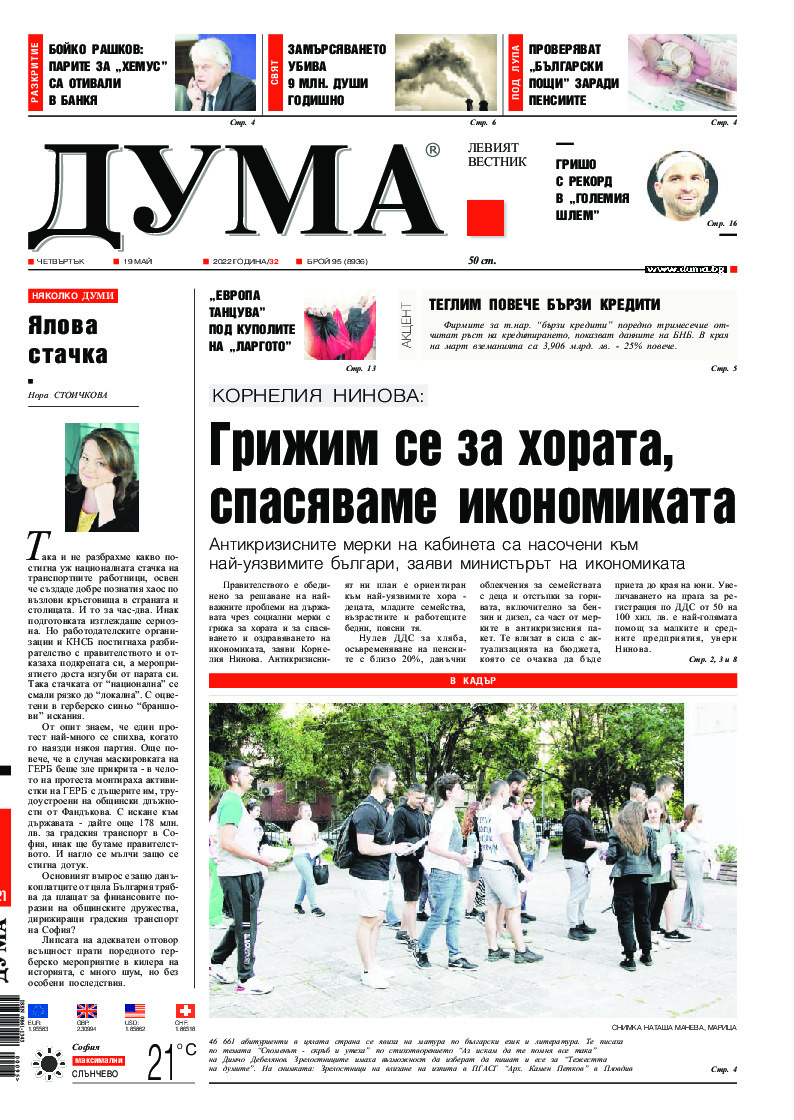АБОНАМЕНТ за вестник „ДУМА“ за 2026 година. Можете да се абонирате в: „Български пощи“ АД до 15 декември 2025 г., „Доби прес“ ЕООД до 28 декември 2025 г., в редакцията на вестника до 20 декември 2025 г. Каталожен номер 6. Цени: 12 месеца - 149 € / 291,42 лв., 6 месеца - 75 € / 146,69 лв., 3 месеца - 40 € / 78,23 лв., 1 месец - 14 € / 27,38 лв. За повече информация тел. 02 9705 203 и 02 9705 216 отдел „Разпространение” на в-к ДУМА на ул. „Позитано” 20 А. E-mail: abonament@duma.bg АБОНАМЕНТ за вестник „ДУМА“ за 2026 година. Можете да се абонирате в: „Български пощи“ АД до 15 декември 2025 г., „Доби прес“ ЕООД до 28 декември 2025 г., в редакцията на вестника до 20 декември 2025 г. Каталожен номер 6. Цени: 12 месеца - 149 € / 291,42 лв., 6 месеца - 75 € / 146,69 лв., 3 месеца - 40 € / 78,23 лв., 1 месец - 14 € / 27,38 лв. За повече информация тел. 02 9705 203 и 02 9705 216 отдел „Разпространение” на в-к ДУМА на ул. „Позитано” 20 А. E-mail: abonament@duma.bg