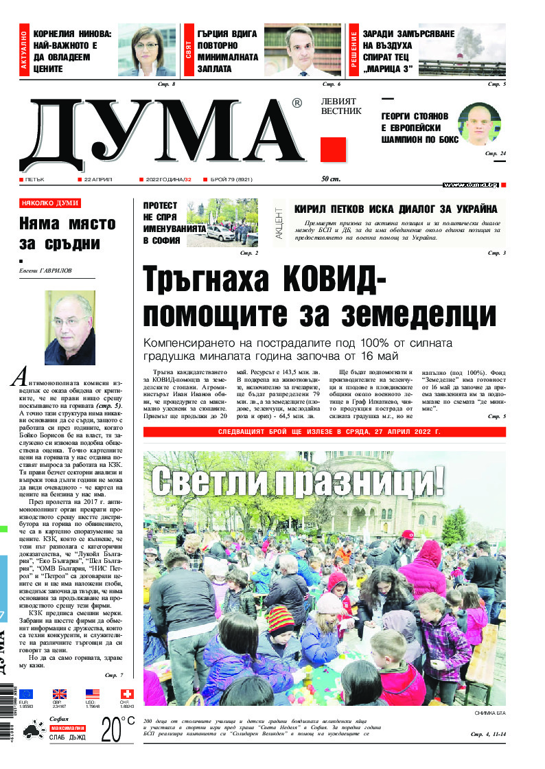 АБОНАМЕНТ за вестник „ДУМА“ за 2026 година. Можете да се абонирате в: „Български пощи“ АД до 15 декември 2025 г., „Доби прес“ ЕООД до 28 декември 2025 г., в редакцията на вестника до 20 декември 2025 г. Каталожен номер 6. Цени: 12 месеца - 149 € / 291,42 лв., 6 месеца - 75 € / 146,69 лв., 3 месеца - 40 € / 78,23 лв., 1 месец - 14 € / 27,38 лв. За повече информация тел. 02 9705 203 и 02 9705 216 отдел „Разпространение” на в-к ДУМА на ул. „Позитано” 20 А. E-mail: abonament@duma.bg АБОНАМЕНТ за вестник „ДУМА“ за 2026 година. Можете да се абонирате в: „Български пощи“ АД до 15 декември 2025 г., „Доби прес“ ЕООД до 28 декември 2025 г., в редакцията на вестника до 20 декември 2025 г. Каталожен номер 6. Цени: 12 месеца - 149 € / 291,42 лв., 6 месеца - 75 € / 146,69 лв., 3 месеца - 40 € / 78,23 лв., 1 месец - 14 € / 27,38 лв. За повече информация тел. 02 9705 203 и 02 9705 216 отдел „Разпространение” на в-к ДУМА на ул. „Позитано” 20 А. E-mail: abonament@duma.bg
