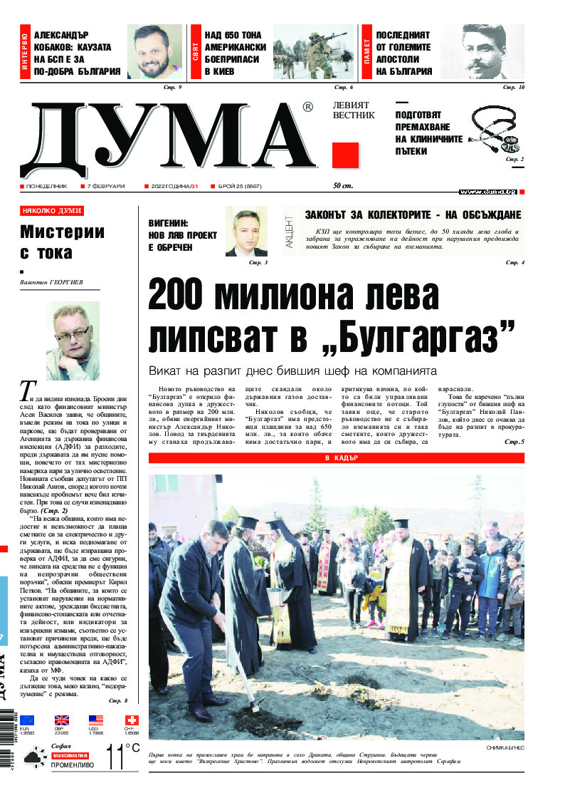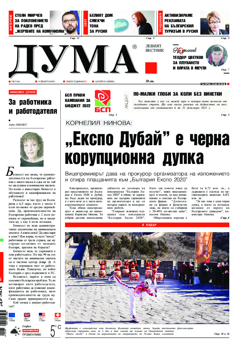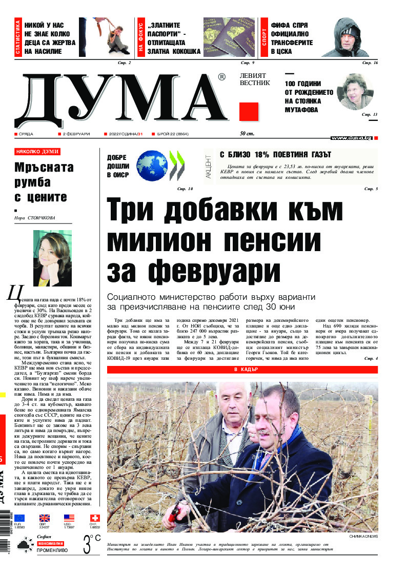АБОНАМЕНТ за вестник „ДУМА“ за 2026 година. Можете да се абонирате в: „Български пощи“ АД до 15 декември 2025 г., „Доби прес“ ЕООД до 28 декември 2025 г., в редакцията на вестника до 20 декември 2025 г. Каталожен номер 6. Цени: 12 месеца - 149 € / 291,42 лв., 6 месеца - 75 € / 146,69 лв., 3 месеца - 40 € / 78,23 лв., 1 месец - 14 € / 27,38 лв. За повече информация тел. 02 9705 203 и 02 9705 216 отдел „Разпространение” на в-к ДУМА на ул. „Позитано” 20 А. E-mail: abonament@duma.bg АБОНАМЕНТ за вестник „ДУМА“ за 2026 година. Можете да се абонирате в: „Български пощи“ АД до 15 декември 2025 г., „Доби прес“ ЕООД до 28 декември 2025 г., в редакцията на вестника до 20 декември 2025 г. Каталожен номер 6. Цени: 12 месеца - 149 € / 291,42 лв., 6 месеца - 75 € / 146,69 лв., 3 месеца - 40 € / 78,23 лв., 1 месец - 14 € / 27,38 лв. За повече информация тел. 02 9705 203 и 02 9705 216 отдел „Разпространение” на в-к ДУМА на ул. „Позитано” 20 А. E-mail: abonament@duma.bg