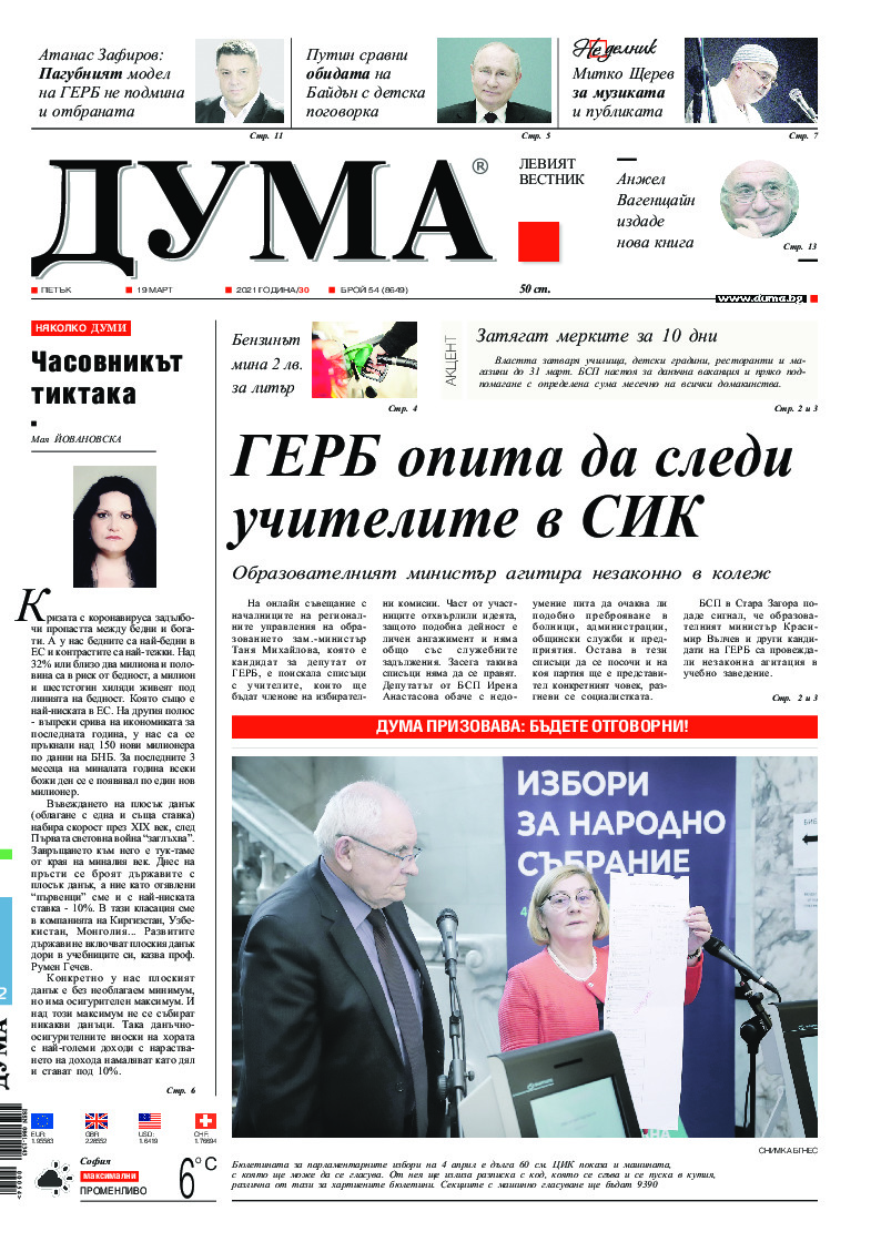 АБОНАМЕНТ за вестник „ДУМА“ за 2026 година. Можете да се абонирате в: „Български пощи“ АД до 15 декември 2025 г., „Доби прес“ ЕООД до 28 декември 2025 г., в редакцията на вестника до 20 декември 2025 г. Каталожен номер 6. Цени: 12 месеца - 149 € / 291,42 лв., 6 месеца - 75 € / 146,69 лв., 3 месеца - 40 € / 78,23 лв., 1 месец - 14 € / 27,38 лв. За повече информация тел. 02 9705 203 и 02 9705 216 отдел „Разпространение” на в-к ДУМА на ул. „Позитано” 20 А. E-mail: abonament@duma.bg АБОНАМЕНТ за вестник „ДУМА“ за 2026 година. Можете да се абонирате в: „Български пощи“ АД до 15 декември 2025 г., „Доби прес“ ЕООД до 28 декември 2025 г., в редакцията на вестника до 20 декември 2025 г. Каталожен номер 6. Цени: 12 месеца - 149 € / 291,42 лв., 6 месеца - 75 € / 146,69 лв., 3 месеца - 40 € / 78,23 лв., 1 месец - 14 € / 27,38 лв. За повече информация тел. 02 9705 203 и 02 9705 216 отдел „Разпространение” на в-к ДУМА на ул. „Позитано” 20 А. E-mail: abonament@duma.bg