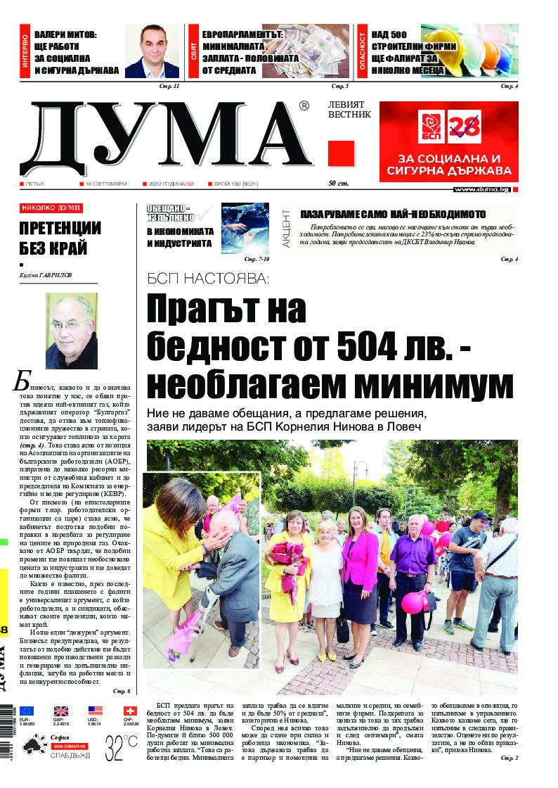 АБОНАМЕНТ за вестник „ДУМА“ за 2026 година. Можете да се абонирате в: „Български пощи“ АД до 15 декември 2025 г., „Доби прес“ ЕООД до 28 декември 2025 г., в редакцията на вестника до 20 декември 2025 г. Каталожен номер 6. Цени: 12 месеца - 149 € / 291,42 лв., 6 месеца - 75 € / 146,69 лв., 3 месеца - 40 € / 78,23 лв., 1 месец - 14 € / 27,38 лв. За повече информация тел. 02 9705 203 и 02 9705 216 отдел „Разпространение” на в-к ДУМА на ул. „Позитано” 20 А. E-mail: abonament@duma.bg АБОНАМЕНТ за вестник „ДУМА“ за 2026 година. Можете да се абонирате в: „Български пощи“ АД до 15 декември 2025 г., „Доби прес“ ЕООД до 28 декември 2025 г., в редакцията на вестника до 20 декември 2025 г. Каталожен номер 6. Цени: 12 месеца - 149 € / 291,42 лв., 6 месеца - 75 € / 146,69 лв., 3 месеца - 40 € / 78,23 лв., 1 месец - 14 € / 27,38 лв. За повече информация тел. 02 9705 203 и 02 9705 216 отдел „Разпространение” на в-к ДУМА на ул. „Позитано” 20 А. E-mail: abonament@duma.bg