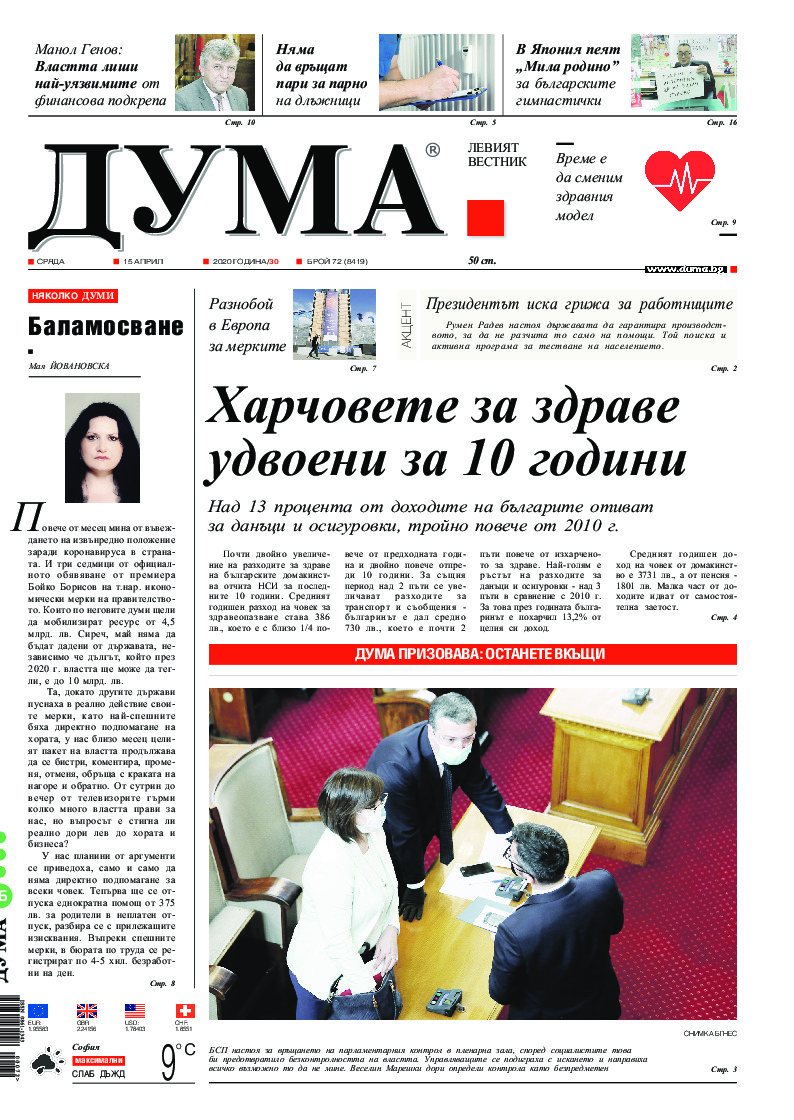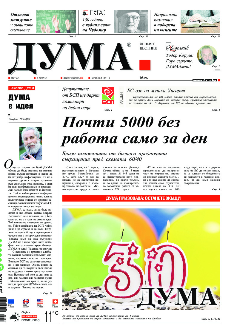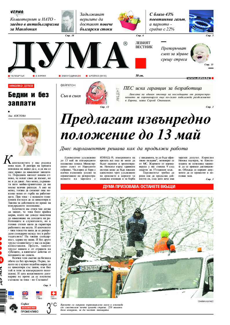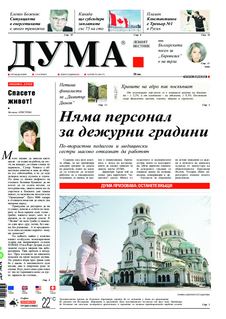 АБОНАМЕНТ за вестник „ДУМА“ за 2026 година. Можете да се абонирате в: „Български пощи“ АД до 15 декември 2025 г., „Доби прес“ ЕООД до 28 декември 2025 г., в редакцията на вестника до 20 декември 2025 г. Каталожен номер 6. Цени: 12 месеца - 149 € / 291,42 лв., 6 месеца - 75 € / 146,69 лв., 3 месеца - 40 € / 78,23 лв., 1 месец - 14 € / 27,38 лв. За повече информация тел. 02 9705 203 и 02 9705 216 отдел „Разпространение” на в-к ДУМА на ул. „Позитано” 20 А. E-mail: abonament@duma.bg АБОНАМЕНТ за вестник „ДУМА“ за 2026 година. Можете да се абонирате в: „Български пощи“ АД до 15 декември 2025 г., „Доби прес“ ЕООД до 28 декември 2025 г., в редакцията на вестника до 20 декември 2025 г. Каталожен номер 6. Цени: 12 месеца - 149 € / 291,42 лв., 6 месеца - 75 € / 146,69 лв., 3 месеца - 40 € / 78,23 лв., 1 месец - 14 € / 27,38 лв. За повече информация тел. 02 9705 203 и 02 9705 216 отдел „Разпространение” на в-к ДУМА на ул. „Позитано” 20 А. E-mail: abonament@duma.bg