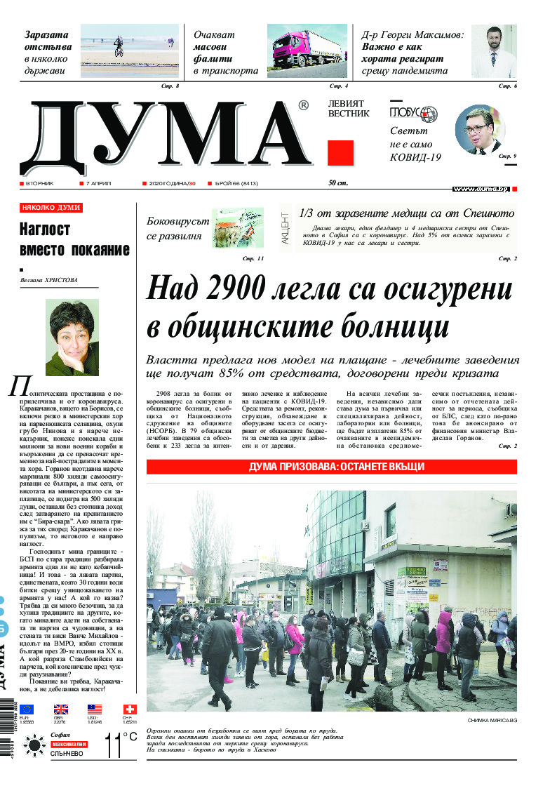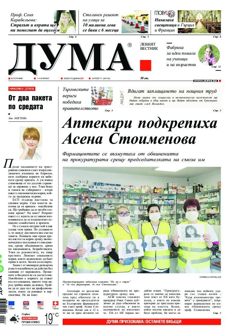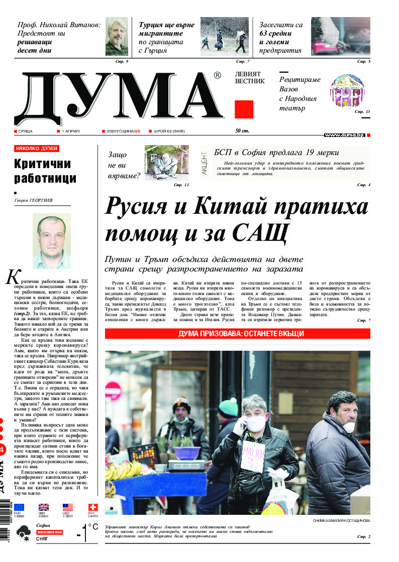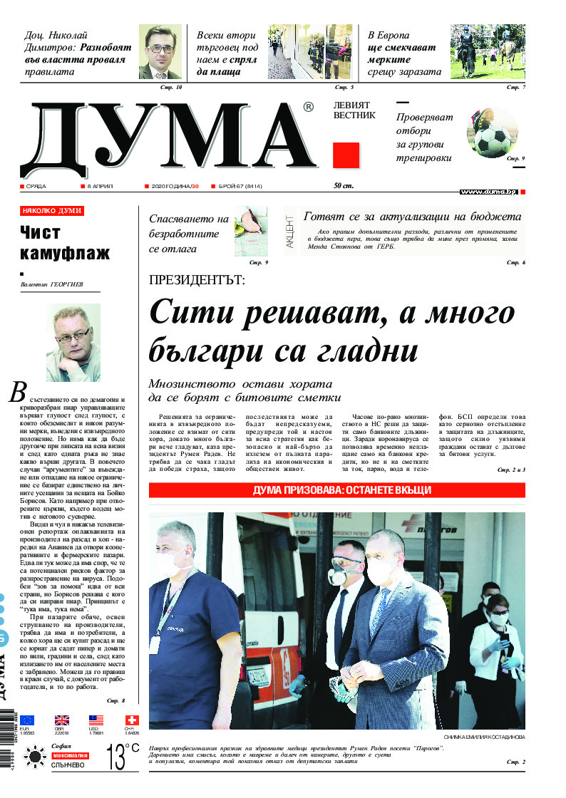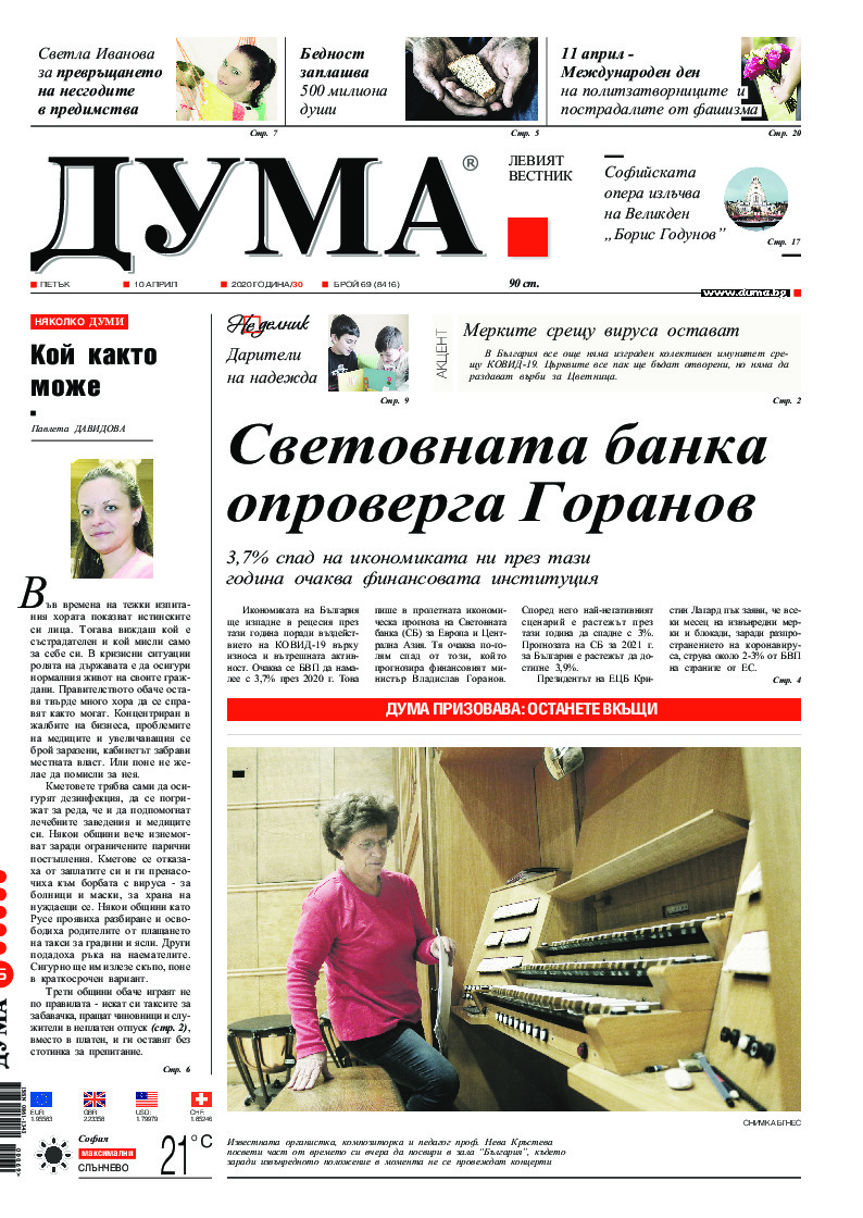 АБОНАМЕНТ за вестник „ДУМА“ за 2026 година. Можете да се абонирате в: „Български пощи“ АД до 15 декември 2025 г., „Доби прес“ ЕООД до 28 декември 2025 г., в редакцията на вестника до 20 декември 2025 г. Каталожен номер 6. Цени: 12 месеца - 149 € / 291,42 лв., 6 месеца - 75 € / 146,69 лв., 3 месеца - 40 € / 78,23 лв., 1 месец - 14 € / 27,38 лв. За повече информация тел. 02 9705 203 и 02 9705 216 отдел „Разпространение” на в-к ДУМА на ул. „Позитано” 20 А. E-mail: abonament@duma.bg АБОНАМЕНТ за вестник „ДУМА“ за 2026 година. Можете да се абонирате в: „Български пощи“ АД до 15 декември 2025 г., „Доби прес“ ЕООД до 28 декември 2025 г., в редакцията на вестника до 20 декември 2025 г. Каталожен номер 6. Цени: 12 месеца - 149 € / 291,42 лв., 6 месеца - 75 € / 146,69 лв., 3 месеца - 40 € / 78,23 лв., 1 месец - 14 € / 27,38 лв. За повече информация тел. 02 9705 203 и 02 9705 216 отдел „Разпространение” на в-к ДУМА на ул. „Позитано” 20 А. E-mail: abonament@duma.bg