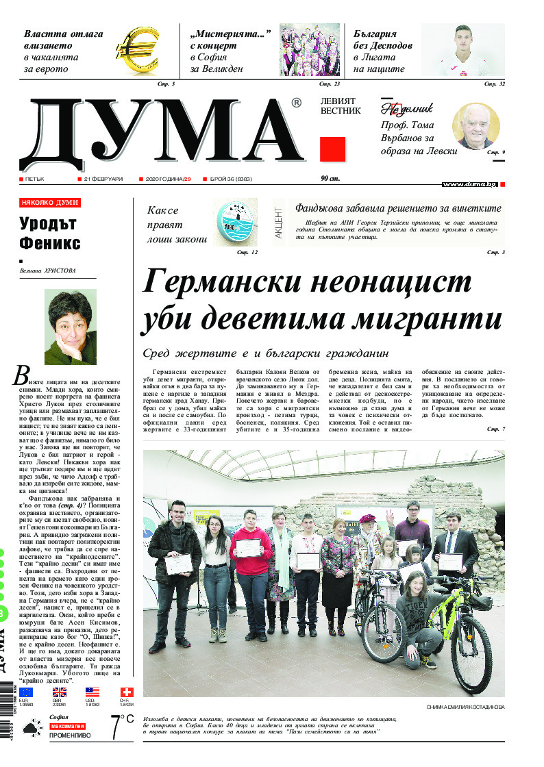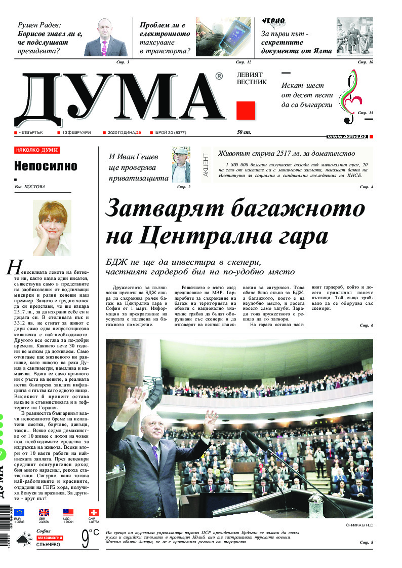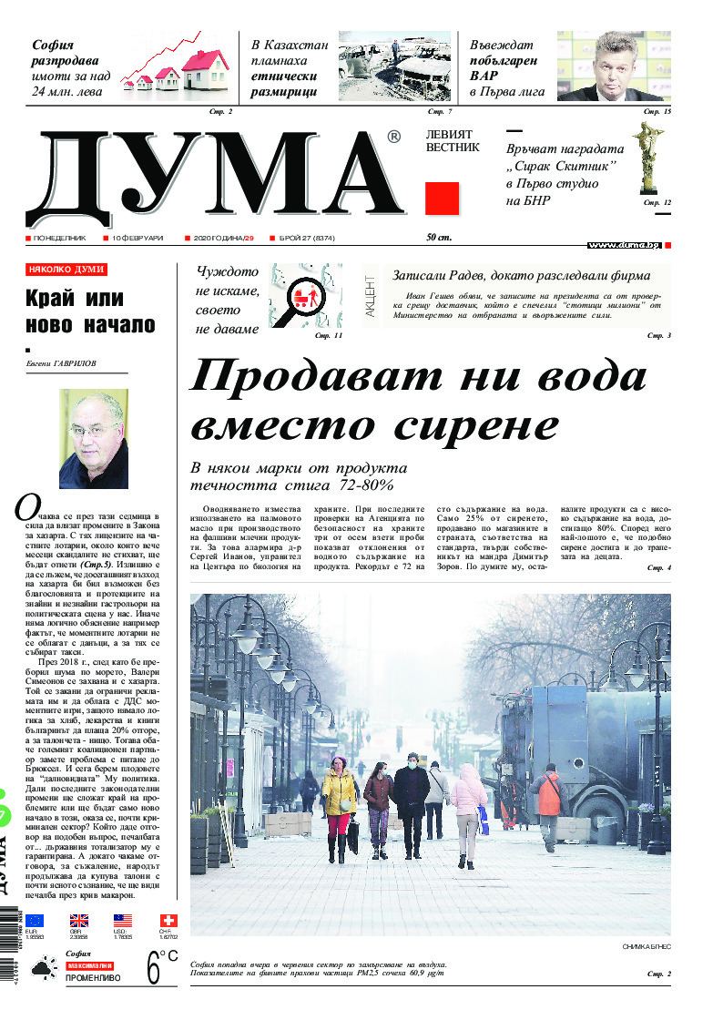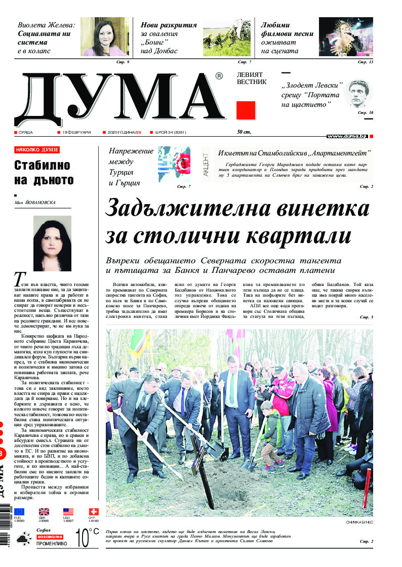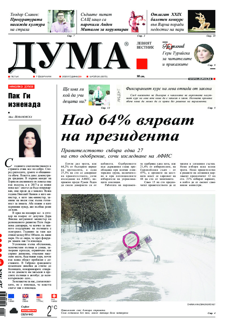 АБОНАМЕНТ за вестник „ДУМА“ за 2026 година. Можете да се абонирате в: „Български пощи“ АД до 15 декември 2025 г., „Доби прес“ ЕООД до 28 декември 2025 г., в редакцията на вестника до 20 декември 2025 г. Каталожен номер 6. Цени: 12 месеца - 149 € / 291,42 лв., 6 месеца - 75 € / 146,69 лв., 3 месеца - 40 € / 78,23 лв., 1 месец - 14 € / 27,38 лв. За повече информация тел. 02 9705 203 и 02 9705 216 отдел „Разпространение” на в-к ДУМА на ул. „Позитано” 20 А. E-mail: abonament@duma.bg АБОНАМЕНТ за вестник „ДУМА“ за 2026 година. Можете да се абонирате в: „Български пощи“ АД до 15 декември 2025 г., „Доби прес“ ЕООД до 28 декември 2025 г., в редакцията на вестника до 20 декември 2025 г. Каталожен номер 6. Цени: 12 месеца - 149 € / 291,42 лв., 6 месеца - 75 € / 146,69 лв., 3 месеца - 40 € / 78,23 лв., 1 месец - 14 € / 27,38 лв. За повече информация тел. 02 9705 203 и 02 9705 216 отдел „Разпространение” на в-к ДУМА на ул. „Позитано” 20 А. E-mail: abonament@duma.bg