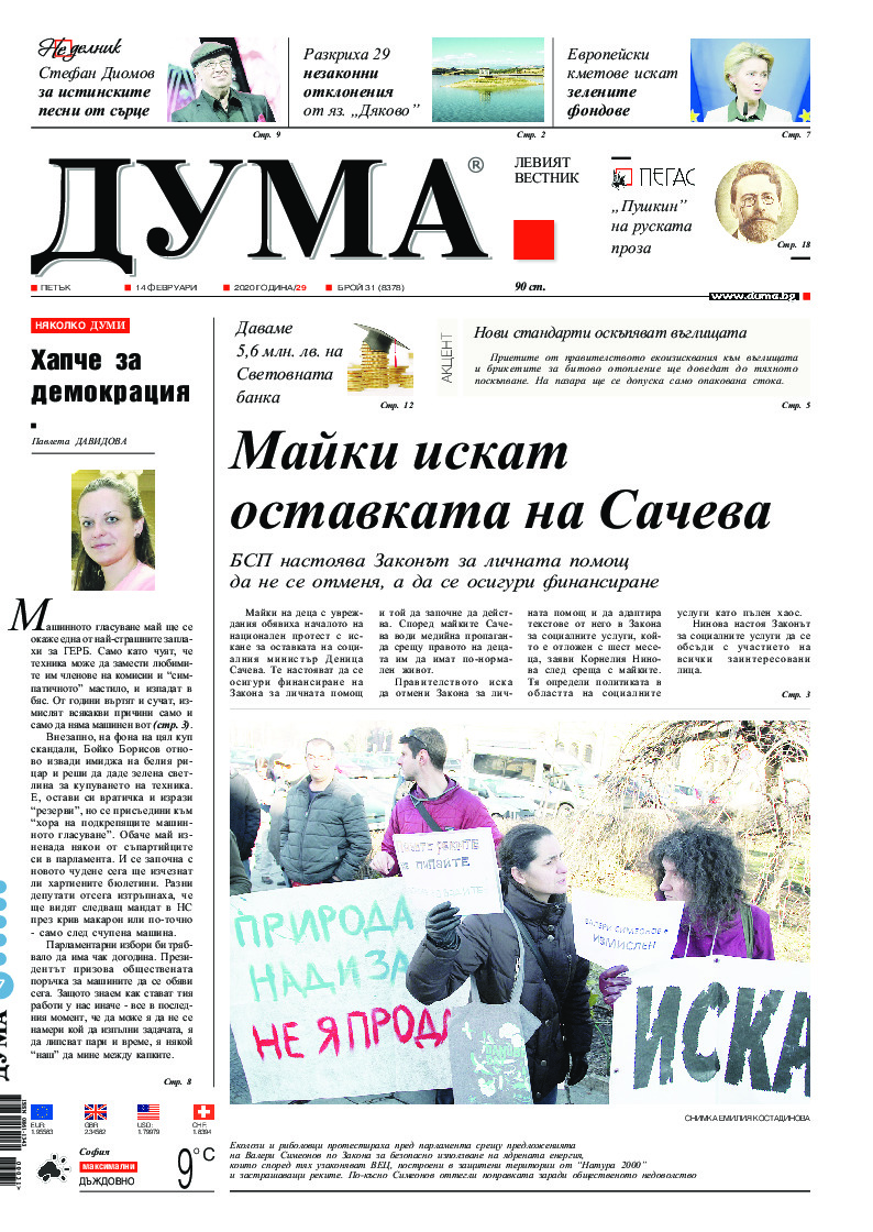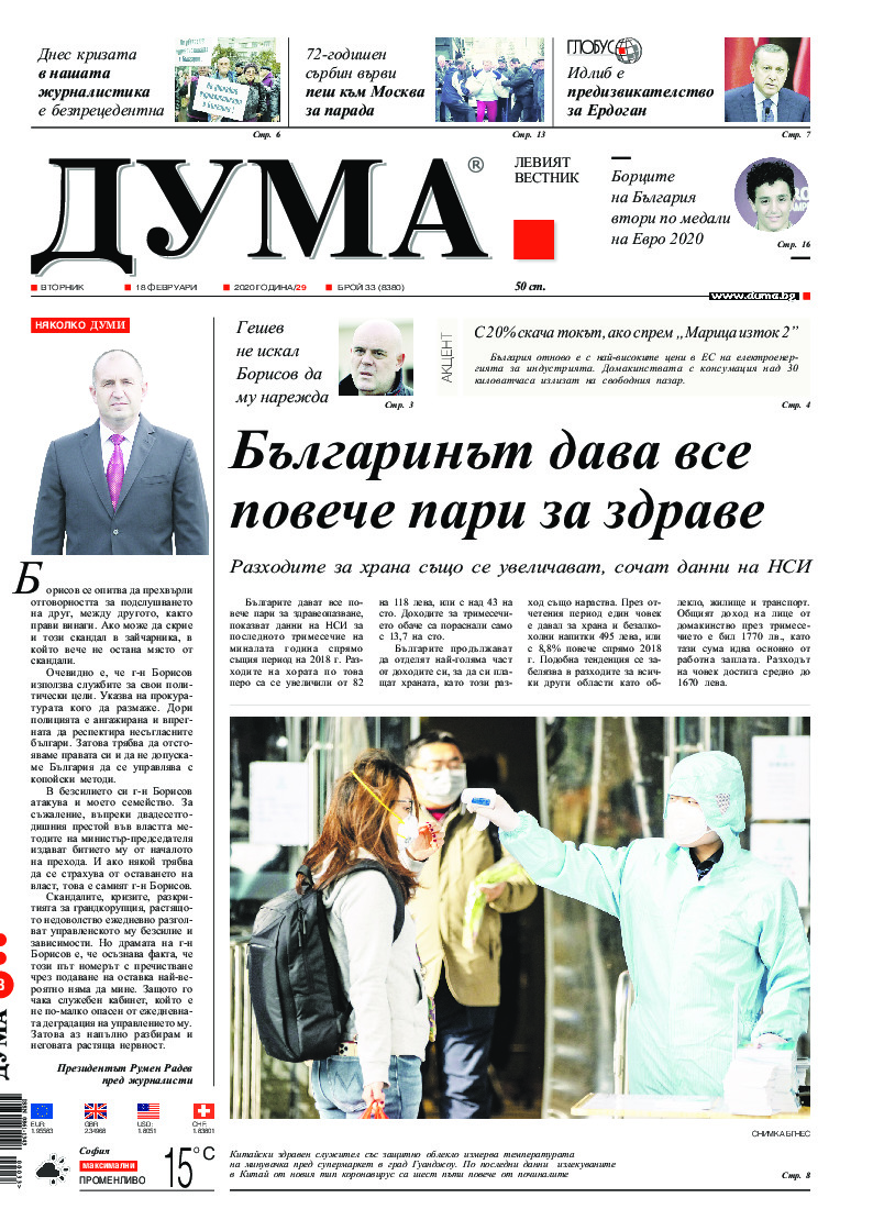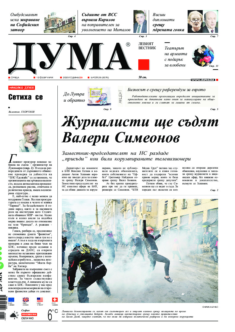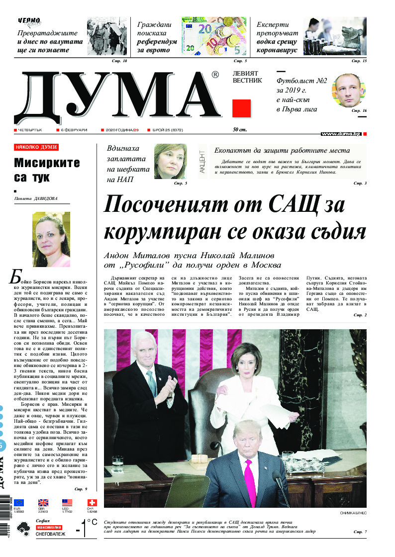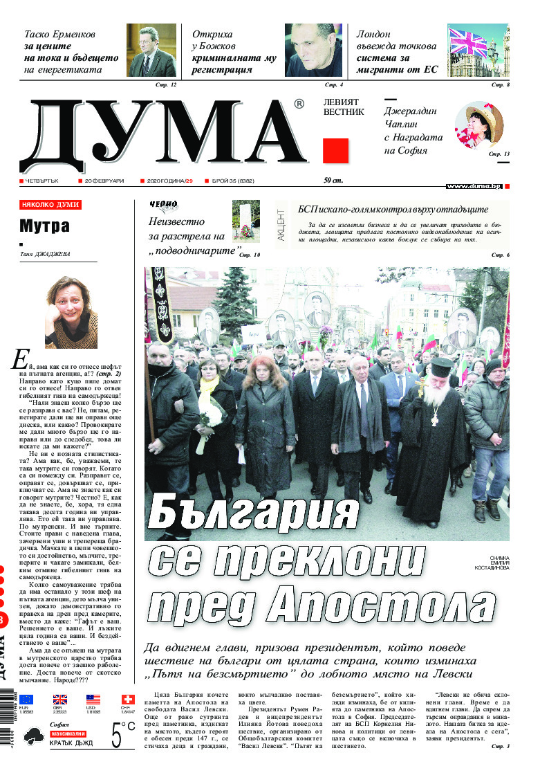 АБОНАМЕНТ за вестник „ДУМА“ за 2026 година. Можете да се абонирате в: „Български пощи“ АД до 15 декември 2025 г., „Доби прес“ ЕООД до 28 декември 2025 г., в редакцията на вестника до 20 декември 2025 г. Каталожен номер 6. Цени: 12 месеца - 149 € / 291,42 лв., 6 месеца - 75 € / 146,69 лв., 3 месеца - 40 € / 78,23 лв., 1 месец - 14 € / 27,38 лв. За повече информация тел. 02 9705 203 и 02 9705 216 отдел „Разпространение” на в-к ДУМА на ул. „Позитано” 20 А. E-mail: abonament@duma.bg АБОНАМЕНТ за вестник „ДУМА“ за 2026 година. Можете да се абонирате в: „Български пощи“ АД до 15 декември 2025 г., „Доби прес“ ЕООД до 28 декември 2025 г., в редакцията на вестника до 20 декември 2025 г. Каталожен номер 6. Цени: 12 месеца - 149 € / 291,42 лв., 6 месеца - 75 € / 146,69 лв., 3 месеца - 40 € / 78,23 лв., 1 месец - 14 € / 27,38 лв. За повече информация тел. 02 9705 203 и 02 9705 216 отдел „Разпространение” на в-к ДУМА на ул. „Позитано” 20 А. E-mail: abonament@duma.bg