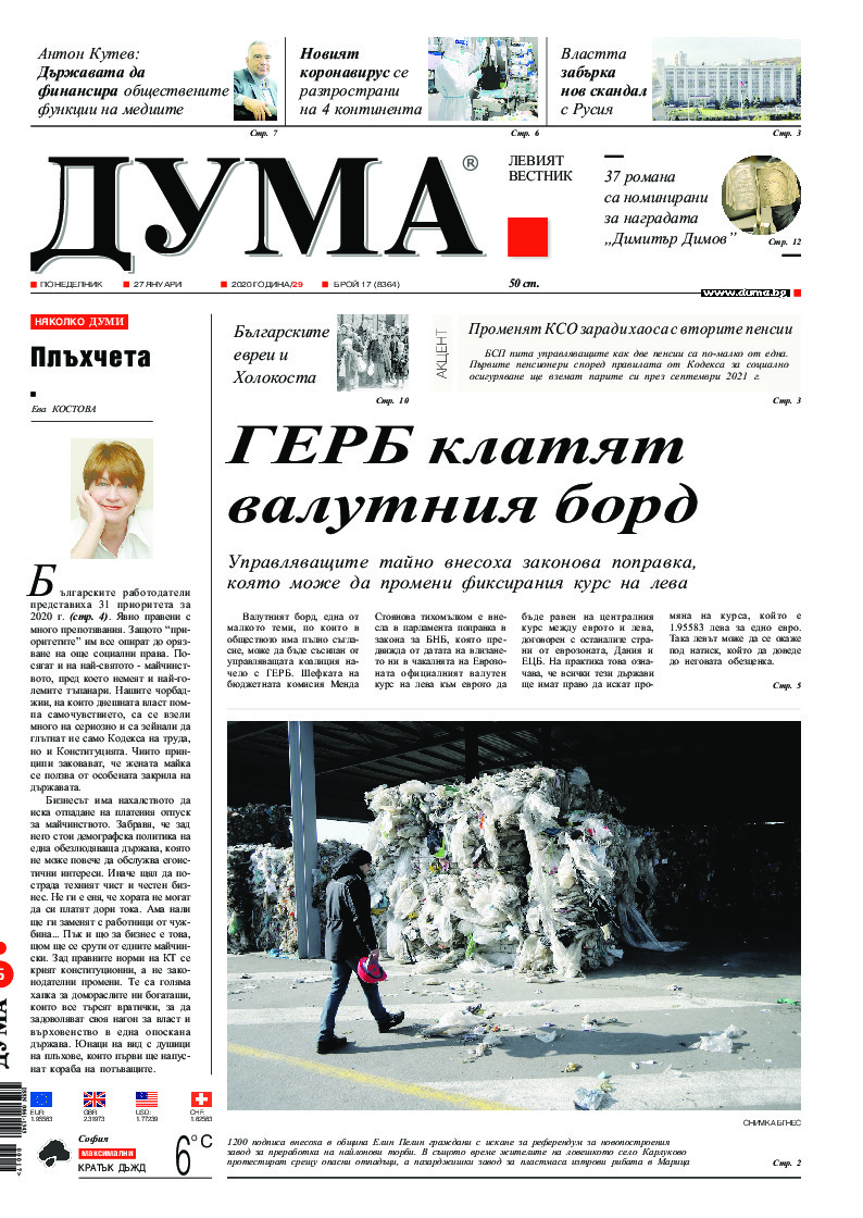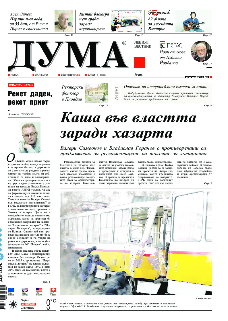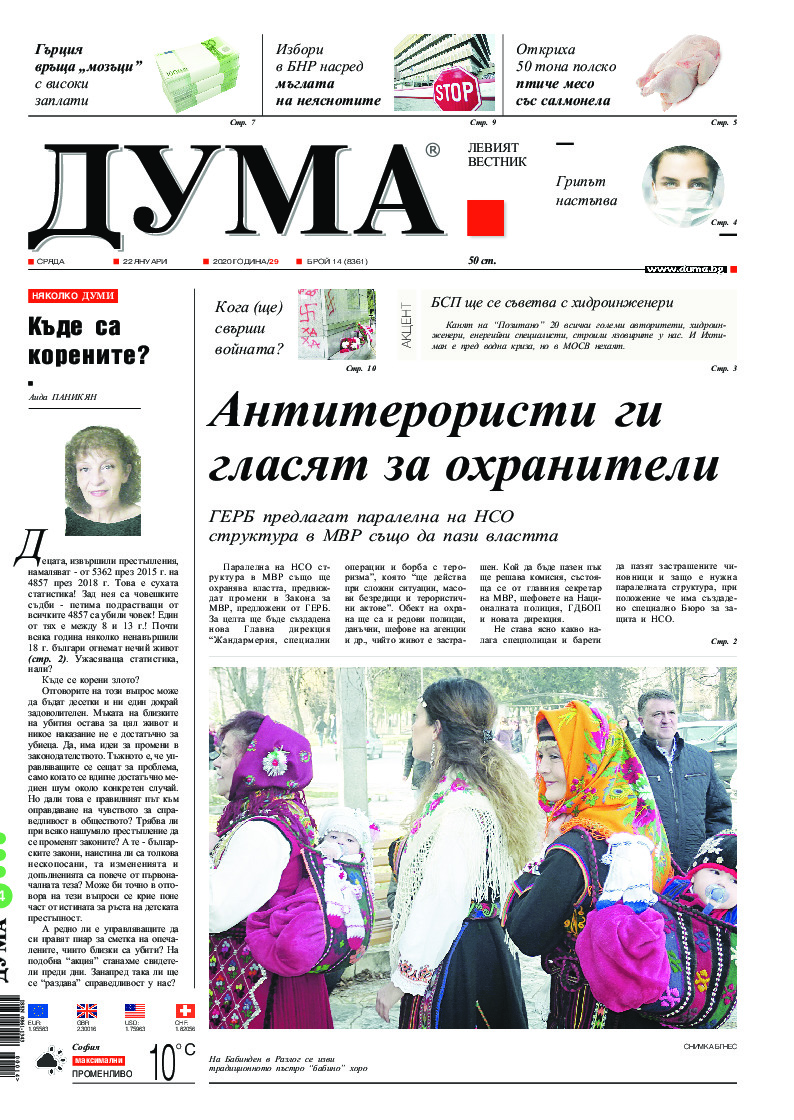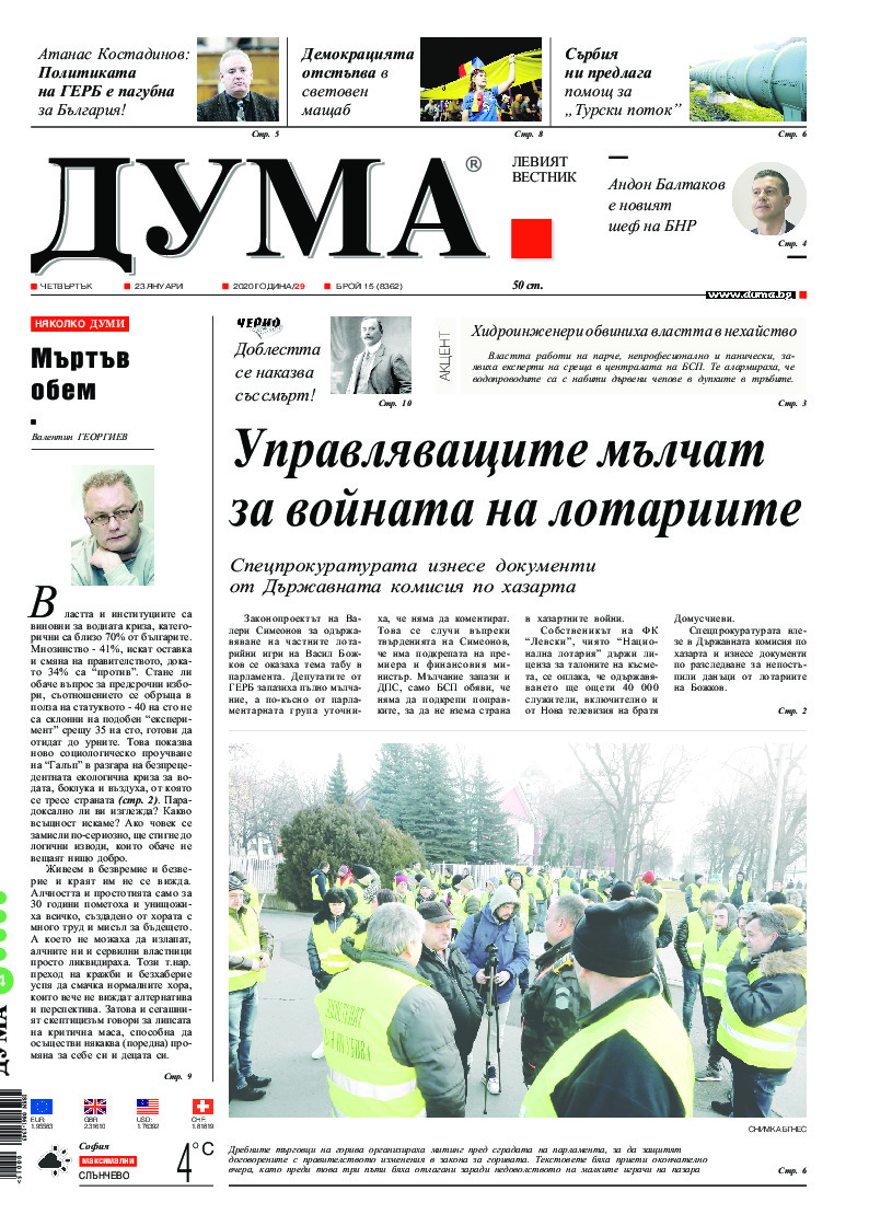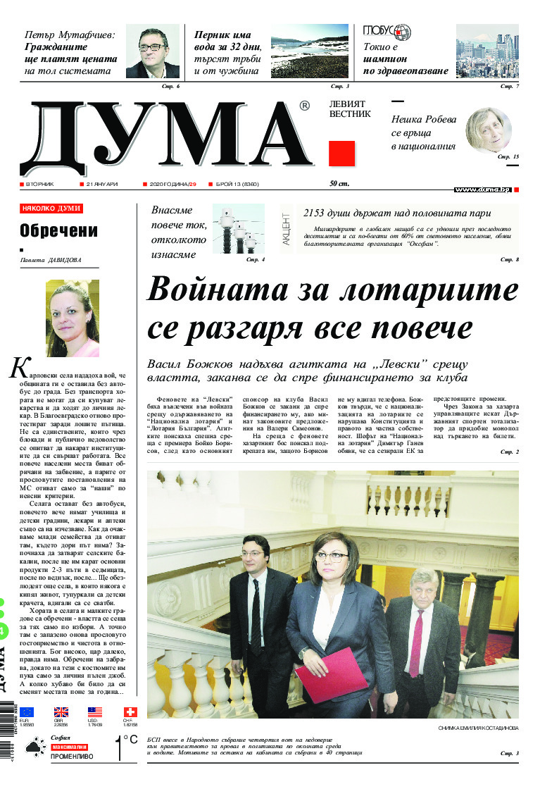 АБОНАМЕНТ за вестник „ДУМА“ за 2026 година. Можете да се абонирате в: „Български пощи“ АД до 15 декември 2025 г., „Доби прес“ ЕООД до 28 декември 2025 г., в редакцията на вестника до 20 декември 2025 г. Каталожен номер 6. Цени: 12 месеца - 149 € / 291,42 лв., 6 месеца - 75 € / 146,69 лв., 3 месеца - 40 € / 78,23 лв., 1 месец - 14 € / 27,38 лв. За повече информация тел. 02 9705 203 и 02 9705 216 отдел „Разпространение” на в-к ДУМА на ул. „Позитано” 20 А. E-mail: abonament@duma.bg АБОНАМЕНТ за вестник „ДУМА“ за 2026 година. Можете да се абонирате в: „Български пощи“ АД до 15 декември 2025 г., „Доби прес“ ЕООД до 28 декември 2025 г., в редакцията на вестника до 20 декември 2025 г. Каталожен номер 6. Цени: 12 месеца - 149 € / 291,42 лв., 6 месеца - 75 € / 146,69 лв., 3 месеца - 40 € / 78,23 лв., 1 месец - 14 € / 27,38 лв. За повече информация тел. 02 9705 203 и 02 9705 216 отдел „Разпространение” на в-к ДУМА на ул. „Позитано” 20 А. E-mail: abonament@duma.bg