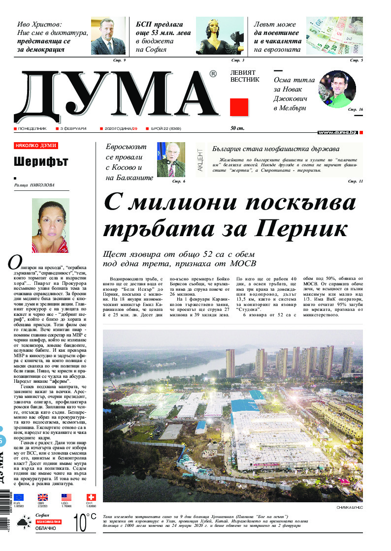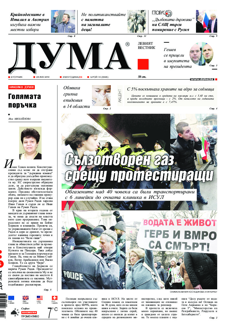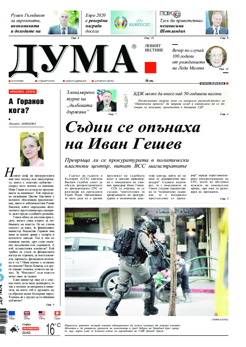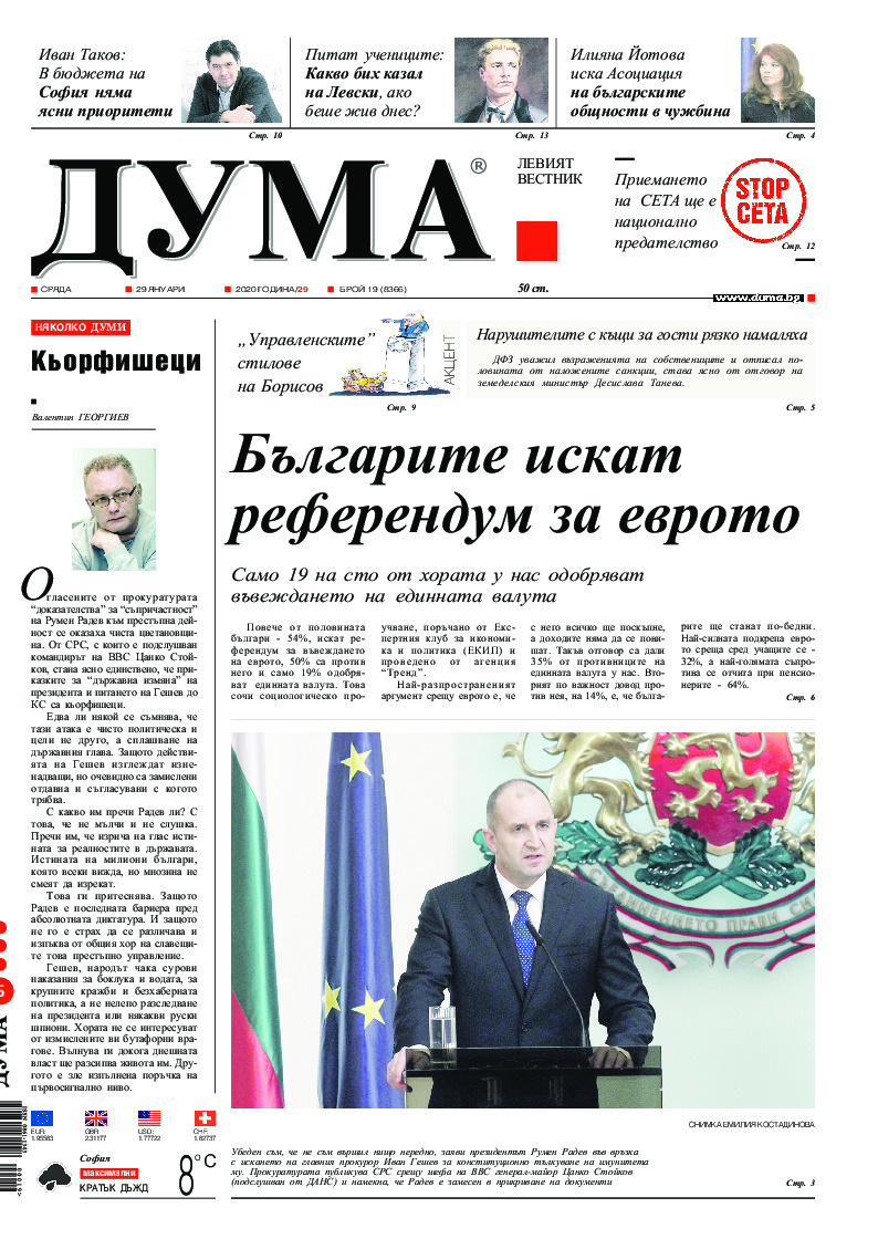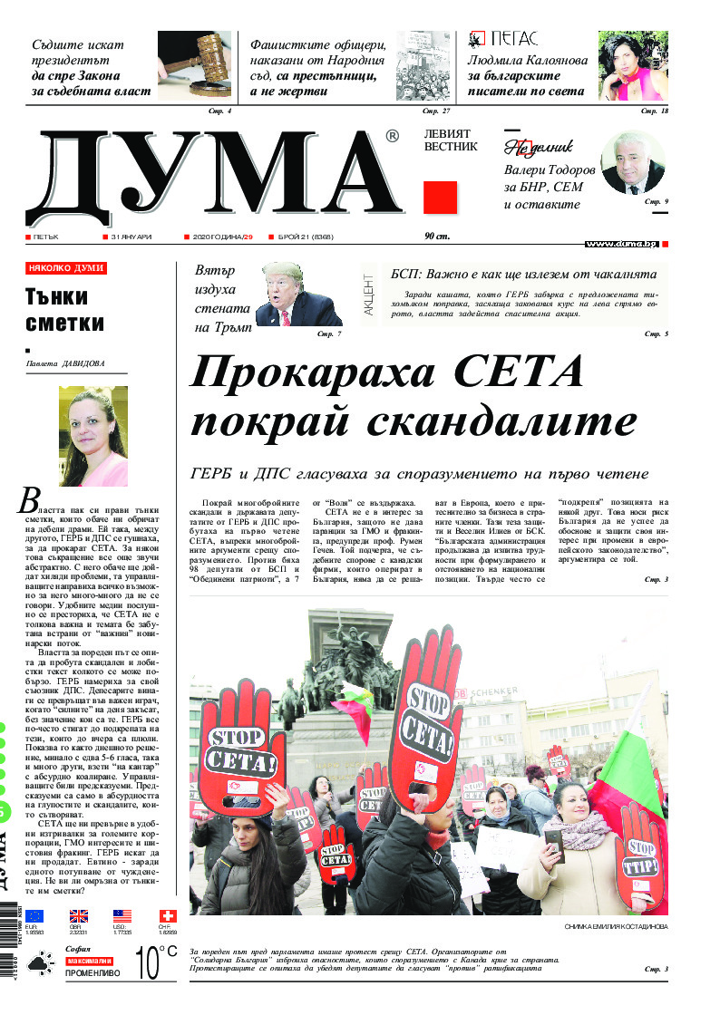 АБОНАМЕНТ за вестник „ДУМА“ за 2026 година. Можете да се абонирате в: „Български пощи“ АД до 15 декември 2025 г., „Доби прес“ ЕООД до 28 декември 2025 г., в редакцията на вестника до 20 декември 2025 г. Каталожен номер 6. Цени: 12 месеца - 149 € / 291,42 лв., 6 месеца - 75 € / 146,69 лв., 3 месеца - 40 € / 78,23 лв., 1 месец - 14 € / 27,38 лв. За повече информация тел. 02 9705 203 и 02 9705 216 отдел „Разпространение” на в-к ДУМА на ул. „Позитано” 20 А. E-mail: abonament@duma.bg АБОНАМЕНТ за вестник „ДУМА“ за 2026 година. Можете да се абонирате в: „Български пощи“ АД до 15 декември 2025 г., „Доби прес“ ЕООД до 28 декември 2025 г., в редакцията на вестника до 20 декември 2025 г. Каталожен номер 6. Цени: 12 месеца - 149 € / 291,42 лв., 6 месеца - 75 € / 146,69 лв., 3 месеца - 40 € / 78,23 лв., 1 месец - 14 € / 27,38 лв. За повече информация тел. 02 9705 203 и 02 9705 216 отдел „Разпространение” на в-к ДУМА на ул. „Позитано” 20 А. E-mail: abonament@duma.bg