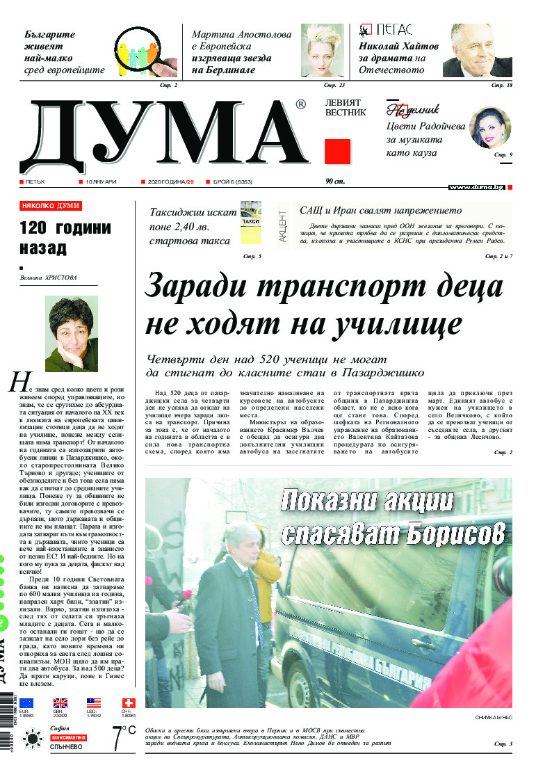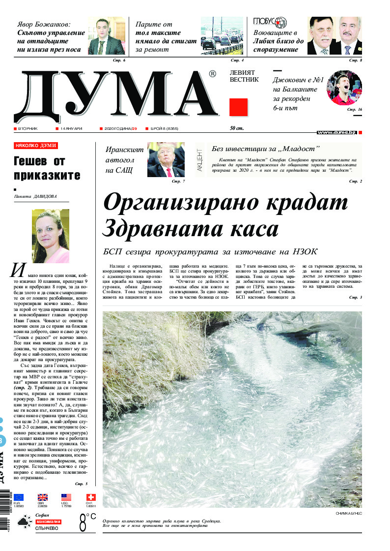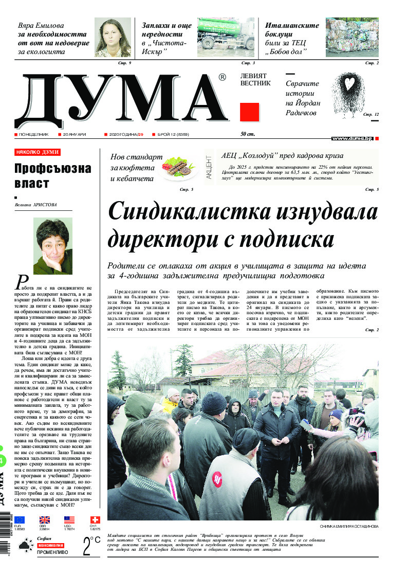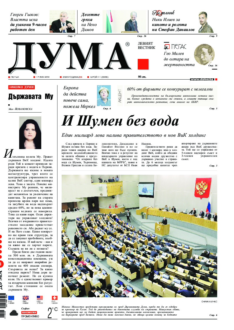 АБОНАМЕНТ за вестник „ДУМА“ за 2026 година. Можете да се абонирате в: „Български пощи“ АД до 15 декември 2025 г., „Доби прес“ ЕООД до 28 декември 2025 г., в редакцията на вестника до 20 декември 2025 г. Каталожен номер 6. Цени: 12 месеца - 149 € / 291,42 лв., 6 месеца - 75 € / 146,69 лв., 3 месеца - 40 € / 78,23 лв., 1 месец - 14 € / 27,38 лв. За повече информация тел. 02 9705 203 и 02 9705 216 отдел „Разпространение” на в-к ДУМА на ул. „Позитано” 20 А. E-mail: abonament@duma.bg АБОНАМЕНТ за вестник „ДУМА“ за 2026 година. Можете да се абонирате в: „Български пощи“ АД до 15 декември 2025 г., „Доби прес“ ЕООД до 28 декември 2025 г., в редакцията на вестника до 20 декември 2025 г. Каталожен номер 6. Цени: 12 месеца - 149 € / 291,42 лв., 6 месеца - 75 € / 146,69 лв., 3 месеца - 40 € / 78,23 лв., 1 месец - 14 € / 27,38 лв. За повече информация тел. 02 9705 203 и 02 9705 216 отдел „Разпространение” на в-к ДУМА на ул. „Позитано” 20 А. E-mail: abonament@duma.bg