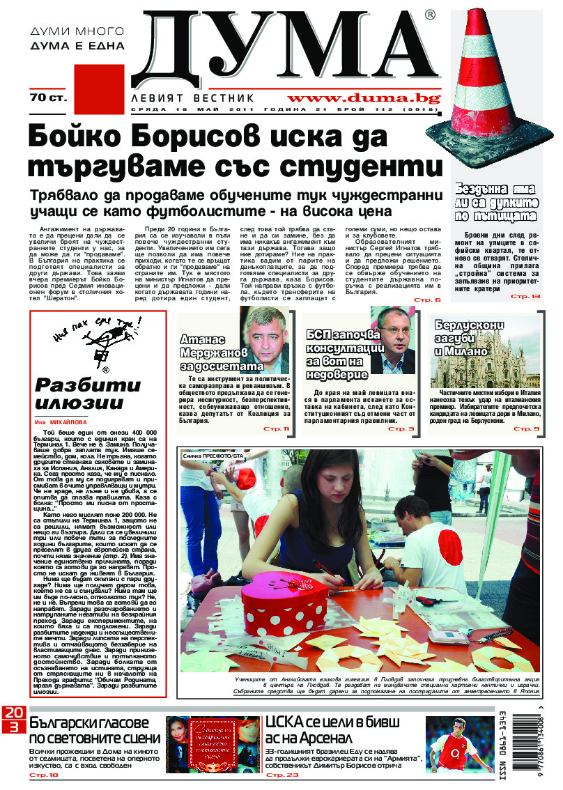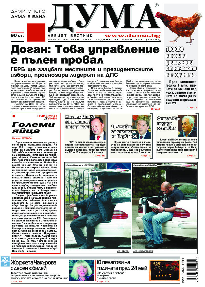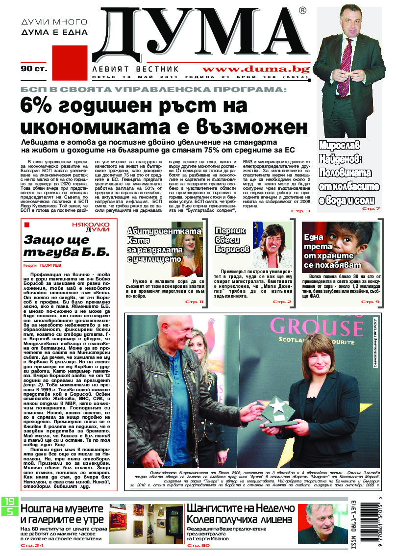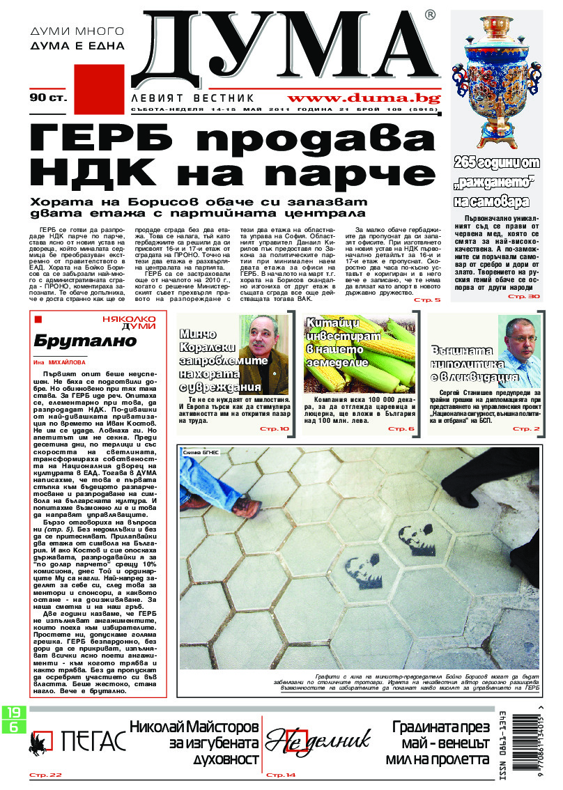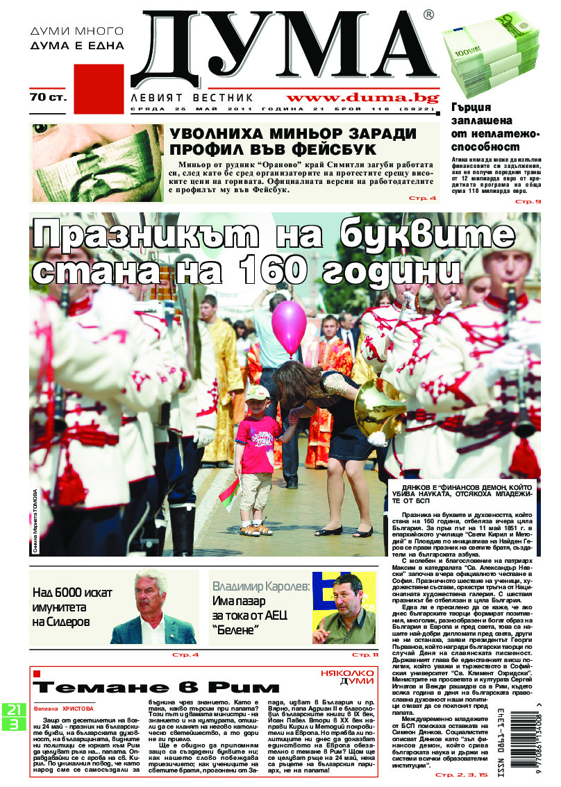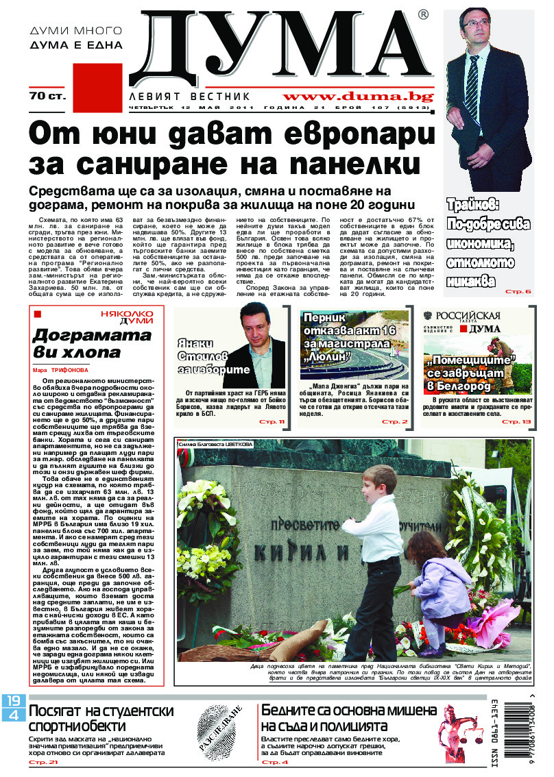 АБОНАМЕНТ за вестник „ДУМА“ за 2026 година. Можете да се абонирате в: „Български пощи“ АД до 15 декември 2025 г., „Доби прес“ ЕООД до 28 декември 2025 г., в редакцията на вестника до 20 декември 2025 г. Каталожен номер 6. Цени: 12 месеца - 149 € / 291,42 лв., 6 месеца - 75 € / 146,69 лв., 3 месеца - 40 € / 78,23 лв., 1 месец - 14 € / 27,38 лв. За повече информация тел. 02 9705 203 и 02 9705 216 отдел „Разпространение” на в-к ДУМА на ул. „Позитано” 20 А. E-mail: abonament@duma.bg АБОНАМЕНТ за вестник „ДУМА“ за 2026 година. Можете да се абонирате в: „Български пощи“ АД до 15 декември 2025 г., „Доби прес“ ЕООД до 28 декември 2025 г., в редакцията на вестника до 20 декември 2025 г. Каталожен номер 6. Цени: 12 месеца - 149 € / 291,42 лв., 6 месеца - 75 € / 146,69 лв., 3 месеца - 40 € / 78,23 лв., 1 месец - 14 € / 27,38 лв. За повече информация тел. 02 9705 203 и 02 9705 216 отдел „Разпространение” на в-к ДУМА на ул. „Позитано” 20 А. E-mail: abonament@duma.bg