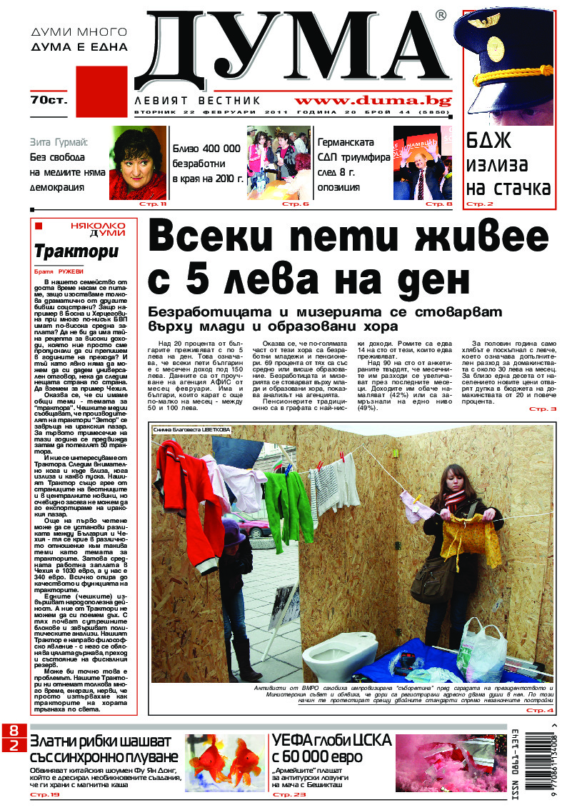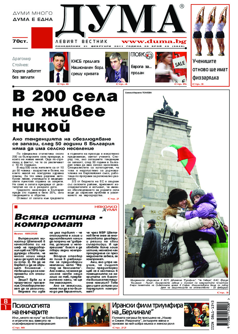 АБОНАМЕНТ за вестник „ДУМА“ за 2026 година. Можете да се абонирате в: „Български пощи“ АД до 15 декември 2025 г., „Доби прес“ ЕООД до 28 декември 2025 г., в редакцията на вестника до 20 декември 2025 г. Каталожен номер 6. Цени: 12 месеца - 149 € / 291,42 лв., 6 месеца - 75 € / 146,69 лв., 3 месеца - 40 € / 78,23 лв., 1 месец - 14 € / 27,38 лв. За повече информация тел. 02 9705 203 и 02 9705 216 отдел „Разпространение” на в-к ДУМА на ул. „Позитано” 20 А. E-mail: abonament@duma.bg АБОНАМЕНТ за вестник „ДУМА“ за 2026 година. Можете да се абонирате в: „Български пощи“ АД до 15 декември 2025 г., „Доби прес“ ЕООД до 28 декември 2025 г., в редакцията на вестника до 20 декември 2025 г. Каталожен номер 6. Цени: 12 месеца - 149 € / 291,42 лв., 6 месеца - 75 € / 146,69 лв., 3 месеца - 40 € / 78,23 лв., 1 месец - 14 € / 27,38 лв. За повече информация тел. 02 9705 203 и 02 9705 216 отдел „Разпространение” на в-к ДУМА на ул. „Позитано” 20 А. E-mail: abonament@duma.bg