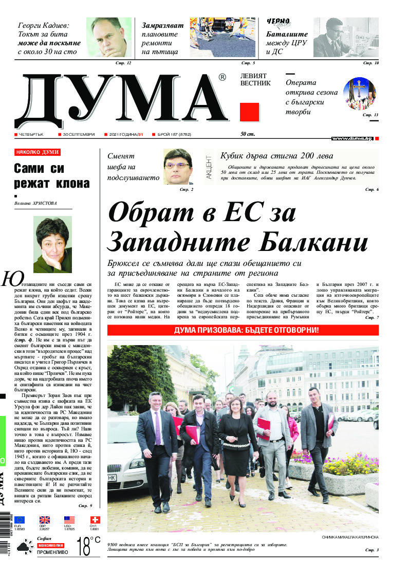 АБОНАМЕНТ за вестник „ДУМА“ за 2026 година. Можете да се абонирате в: „Български пощи“ АД до 15 декември 2025 г., „Доби прес“ ЕООД до 28 декември 2025 г., в редакцията на вестника до 20 декември 2025 г. Каталожен номер 6. Цени: 12 месеца - 149 € / 291,42 лв., 6 месеца - 75 € / 146,69 лв., 3 месеца - 40 € / 78,23 лв., 1 месец - 14 € / 27,38 лв. За повече информация тел. 02 9705 203 и 02 9705 216 отдел „Разпространение” на в-к ДУМА на ул. „Позитано” 20 А. E-mail: abonament@duma.bg АБОНАМЕНТ за вестник „ДУМА“ за 2026 година. Можете да се абонирате в: „Български пощи“ АД до 15 декември 2025 г., „Доби прес“ ЕООД до 28 декември 2025 г., в редакцията на вестника до 20 декември 2025 г. Каталожен номер 6. Цени: 12 месеца - 149 € / 291,42 лв., 6 месеца - 75 € / 146,69 лв., 3 месеца - 40 € / 78,23 лв., 1 месец - 14 € / 27,38 лв. За повече информация тел. 02 9705 203 и 02 9705 216 отдел „Разпространение” на в-к ДУМА на ул. „Позитано” 20 А. E-mail: abonament@duma.bg