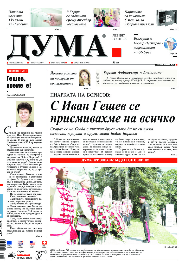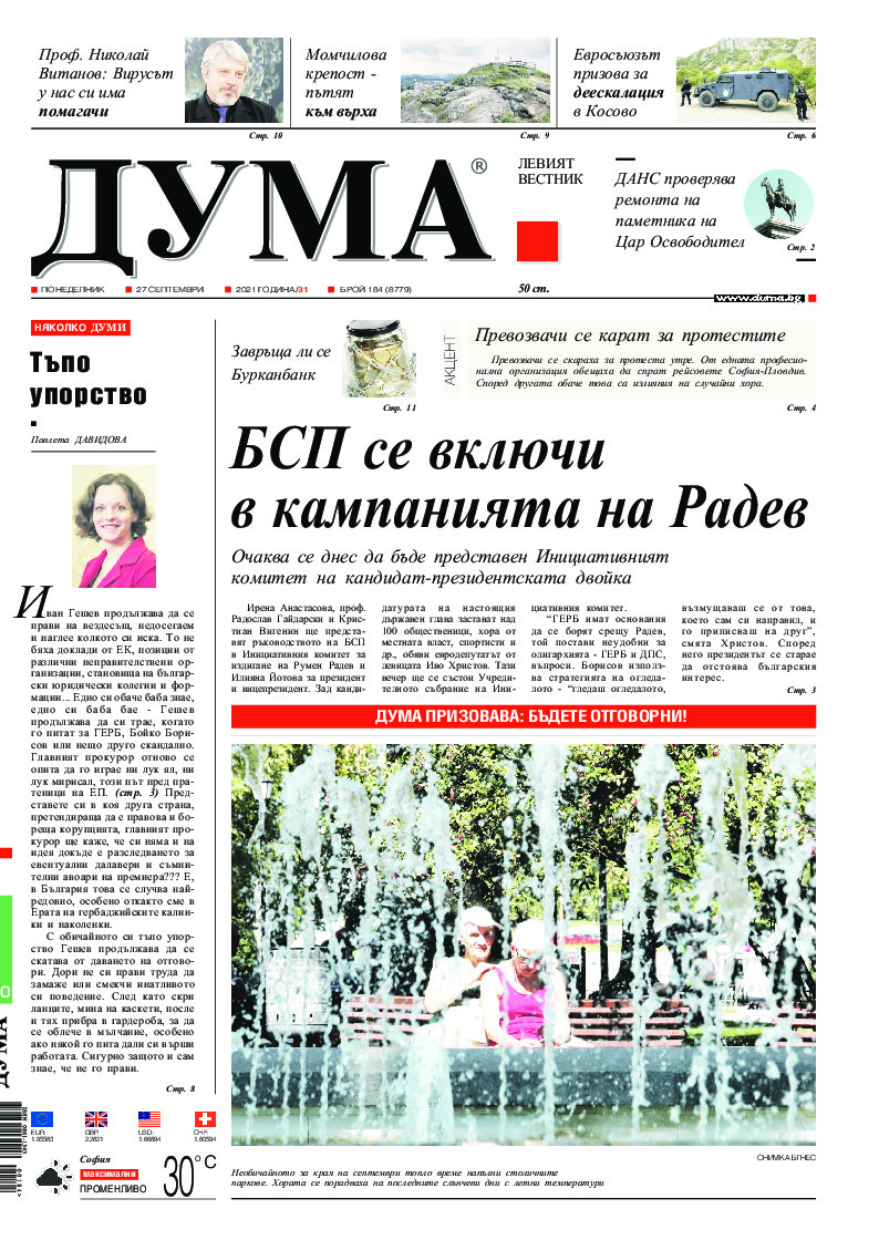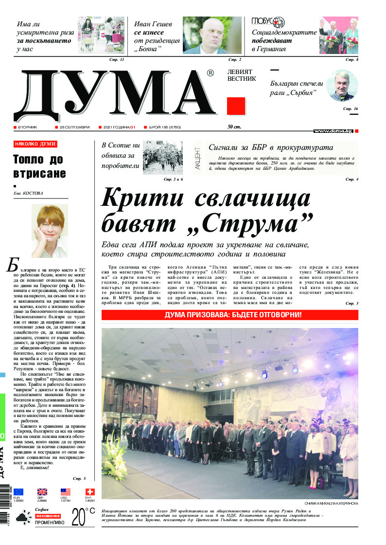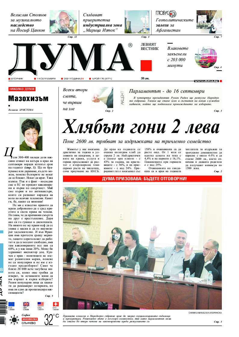 АБОНАМЕНТ за вестник „ДУМА“ за 2026 година. Можете да се абонирате в: „Български пощи“ АД до 15 декември 2025 г., „Доби прес“ ЕООД до 28 декември 2025 г., в редакцията на вестника до 20 декември 2025 г. Каталожен номер 6. Цени: 12 месеца - 149 € / 291,42 лв., 6 месеца - 75 € / 146,69 лв., 3 месеца - 40 € / 78,23 лв., 1 месец - 14 € / 27,38 лв. За повече информация тел. 02 9705 203 и 02 9705 216 отдел „Разпространение” на в-к ДУМА на ул. „Позитано” 20 А. E-mail: abonament@duma.bg АБОНАМЕНТ за вестник „ДУМА“ за 2026 година. Можете да се абонирате в: „Български пощи“ АД до 15 декември 2025 г., „Доби прес“ ЕООД до 28 декември 2025 г., в редакцията на вестника до 20 декември 2025 г. Каталожен номер 6. Цени: 12 месеца - 149 € / 291,42 лв., 6 месеца - 75 € / 146,69 лв., 3 месеца - 40 € / 78,23 лв., 1 месец - 14 € / 27,38 лв. За повече информация тел. 02 9705 203 и 02 9705 216 отдел „Разпространение” на в-к ДУМА на ул. „Позитано” 20 А. E-mail: abonament@duma.bg