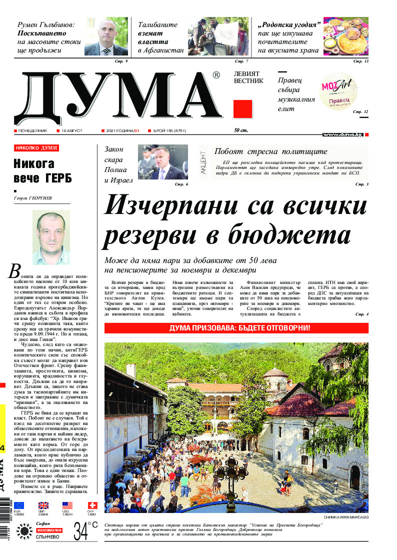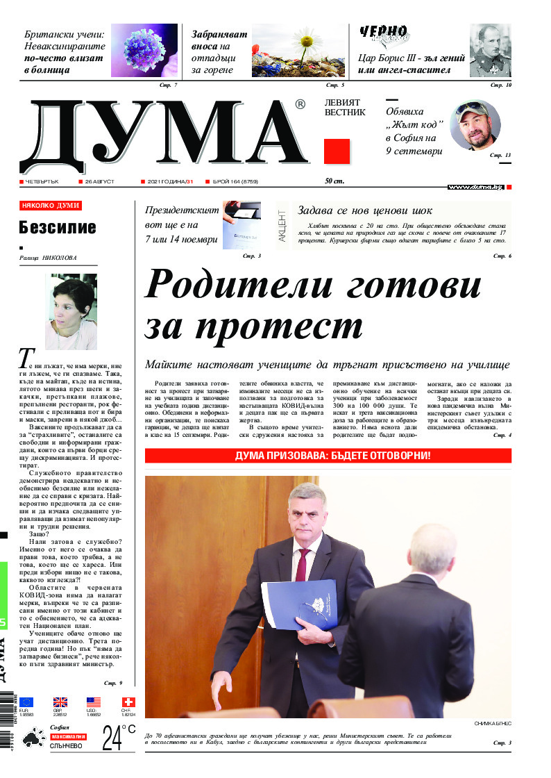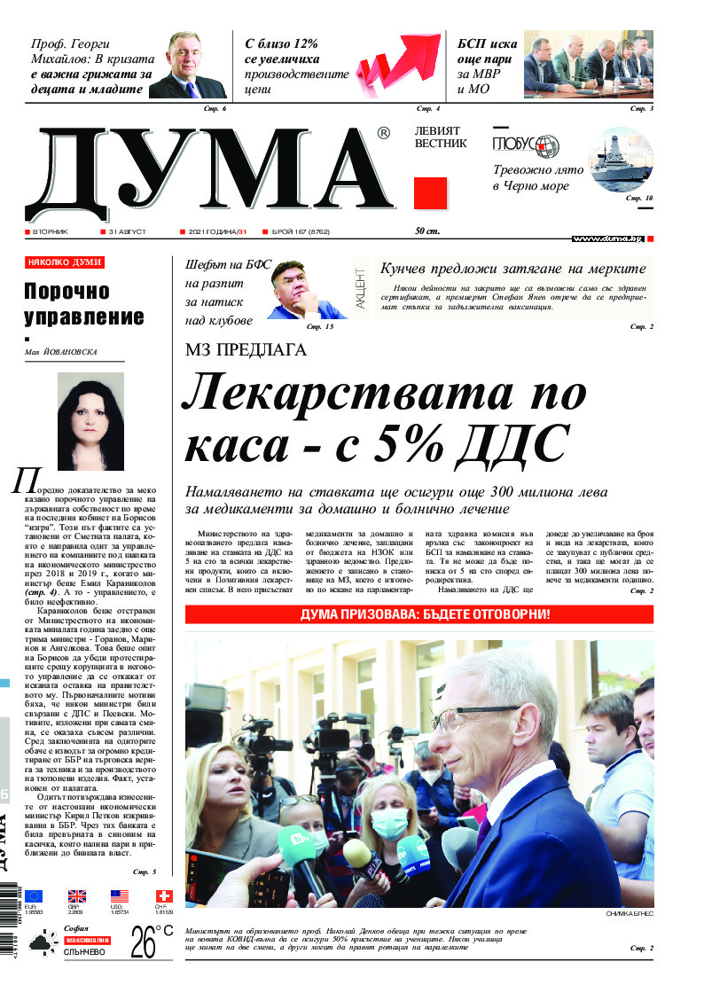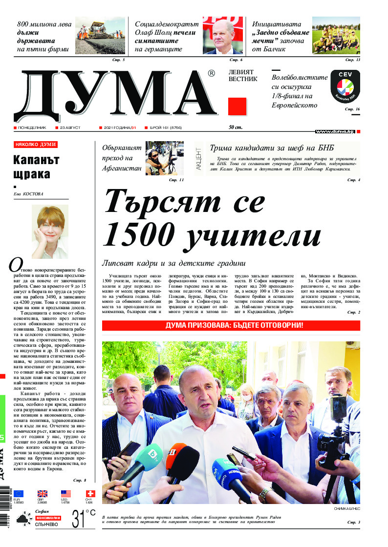 АБОНАМЕНТ за вестник „ДУМА“ за 2026 година. Можете да се абонирате в: „Български пощи“ АД до 15 декември 2025 г., „Доби прес“ ЕООД до 28 декември 2025 г., в редакцията на вестника до 20 декември 2025 г. Каталожен номер 6. Цени: 12 месеца - 149 € / 291,42 лв., 6 месеца - 75 € / 146,69 лв., 3 месеца - 40 € / 78,23 лв., 1 месец - 14 € / 27,38 лв. За повече информация тел. 02 9705 203 и 02 9705 216 отдел „Разпространение” на в-к ДУМА на ул. „Позитано” 20 А. E-mail: abonament@duma.bg АБОНАМЕНТ за вестник „ДУМА“ за 2026 година. Можете да се абонирате в: „Български пощи“ АД до 15 декември 2025 г., „Доби прес“ ЕООД до 28 декември 2025 г., в редакцията на вестника до 20 декември 2025 г. Каталожен номер 6. Цени: 12 месеца - 149 € / 291,42 лв., 6 месеца - 75 € / 146,69 лв., 3 месеца - 40 € / 78,23 лв., 1 месец - 14 € / 27,38 лв. За повече информация тел. 02 9705 203 и 02 9705 216 отдел „Разпространение” на в-к ДУМА на ул. „Позитано” 20 А. E-mail: abonament@duma.bg