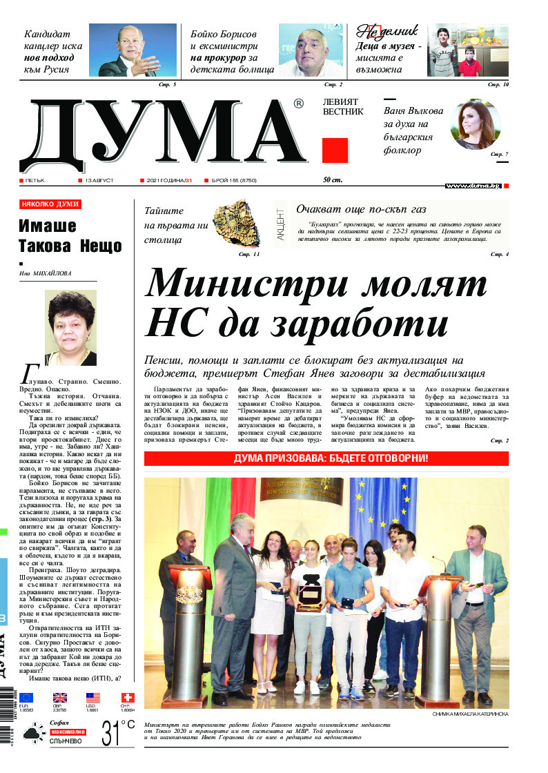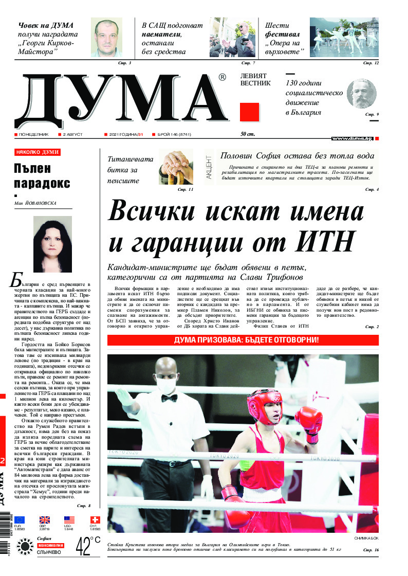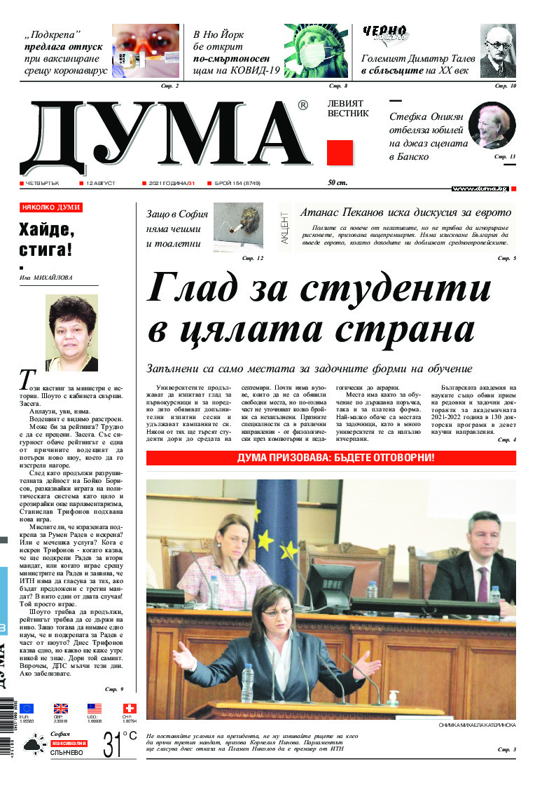 АБОНАМЕНТ за вестник „ДУМА“ за 2026 година. Можете да се абонирате в: „Български пощи“ АД до 15 декември 2025 г., „Доби прес“ ЕООД до 28 декември 2025 г., в редакцията на вестника до 20 декември 2025 г. Каталожен номер 6. Цени: 12 месеца - 149 € / 291,42 лв., 6 месеца - 75 € / 146,69 лв., 3 месеца - 40 € / 78,23 лв., 1 месец - 14 € / 27,38 лв. За повече информация тел. 02 9705 203 и 02 9705 216 отдел „Разпространение” на в-к ДУМА на ул. „Позитано” 20 А. E-mail: abonament@duma.bg АБОНАМЕНТ за вестник „ДУМА“ за 2026 година. Можете да се абонирате в: „Български пощи“ АД до 15 декември 2025 г., „Доби прес“ ЕООД до 28 декември 2025 г., в редакцията на вестника до 20 декември 2025 г. Каталожен номер 6. Цени: 12 месеца - 149 € / 291,42 лв., 6 месеца - 75 € / 146,69 лв., 3 месеца - 40 € / 78,23 лв., 1 месец - 14 € / 27,38 лв. За повече информация тел. 02 9705 203 и 02 9705 216 отдел „Разпространение” на в-к ДУМА на ул. „Позитано” 20 А. E-mail: abonament@duma.bg