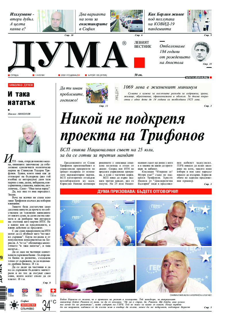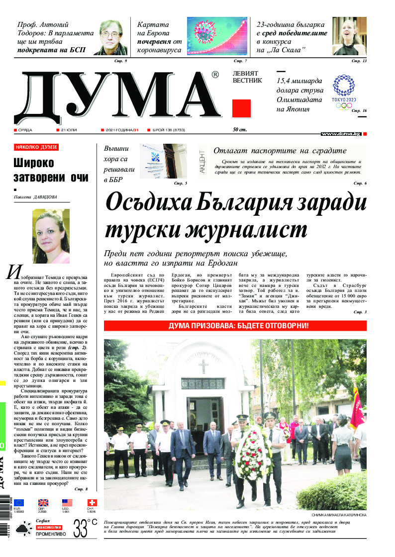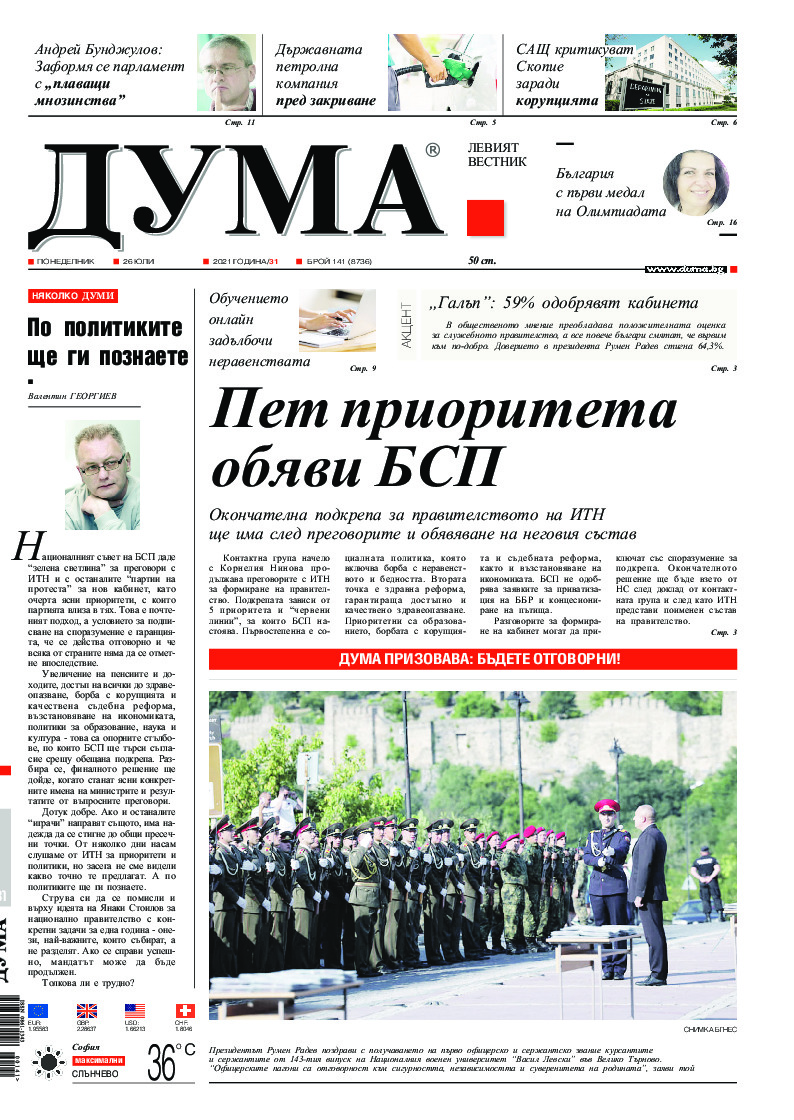 АБОНАМЕНТ за вестник „ДУМА“ за 2026 година. Можете да се абонирате в: „Български пощи“ АД до 15 декември 2025 г., „Доби прес“ ЕООД до 28 декември 2025 г., в редакцията на вестника до 20 декември 2025 г. Каталожен номер 6. Цени: 12 месеца - 149 € / 291,42 лв., 6 месеца - 75 € / 146,69 лв., 3 месеца - 40 € / 78,23 лв., 1 месец - 14 € / 27,38 лв. За повече информация тел. 02 9705 203 и 02 9705 216 отдел „Разпространение” на в-к ДУМА на ул. „Позитано” 20 А. E-mail: abonament@duma.bg АБОНАМЕНТ за вестник „ДУМА“ за 2026 година. Можете да се абонирате в: „Български пощи“ АД до 15 декември 2025 г., „Доби прес“ ЕООД до 28 декември 2025 г., в редакцията на вестника до 20 декември 2025 г. Каталожен номер 6. Цени: 12 месеца - 149 € / 291,42 лв., 6 месеца - 75 € / 146,69 лв., 3 месеца - 40 € / 78,23 лв., 1 месец - 14 € / 27,38 лв. За повече информация тел. 02 9705 203 и 02 9705 216 отдел „Разпространение” на в-к ДУМА на ул. „Позитано” 20 А. E-mail: abonament@duma.bg