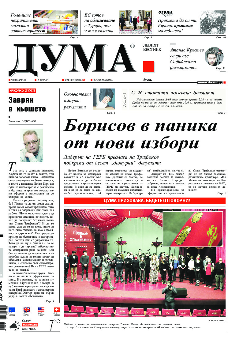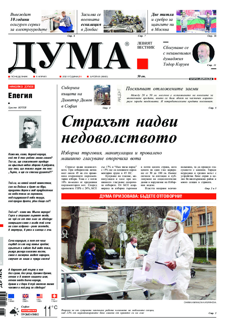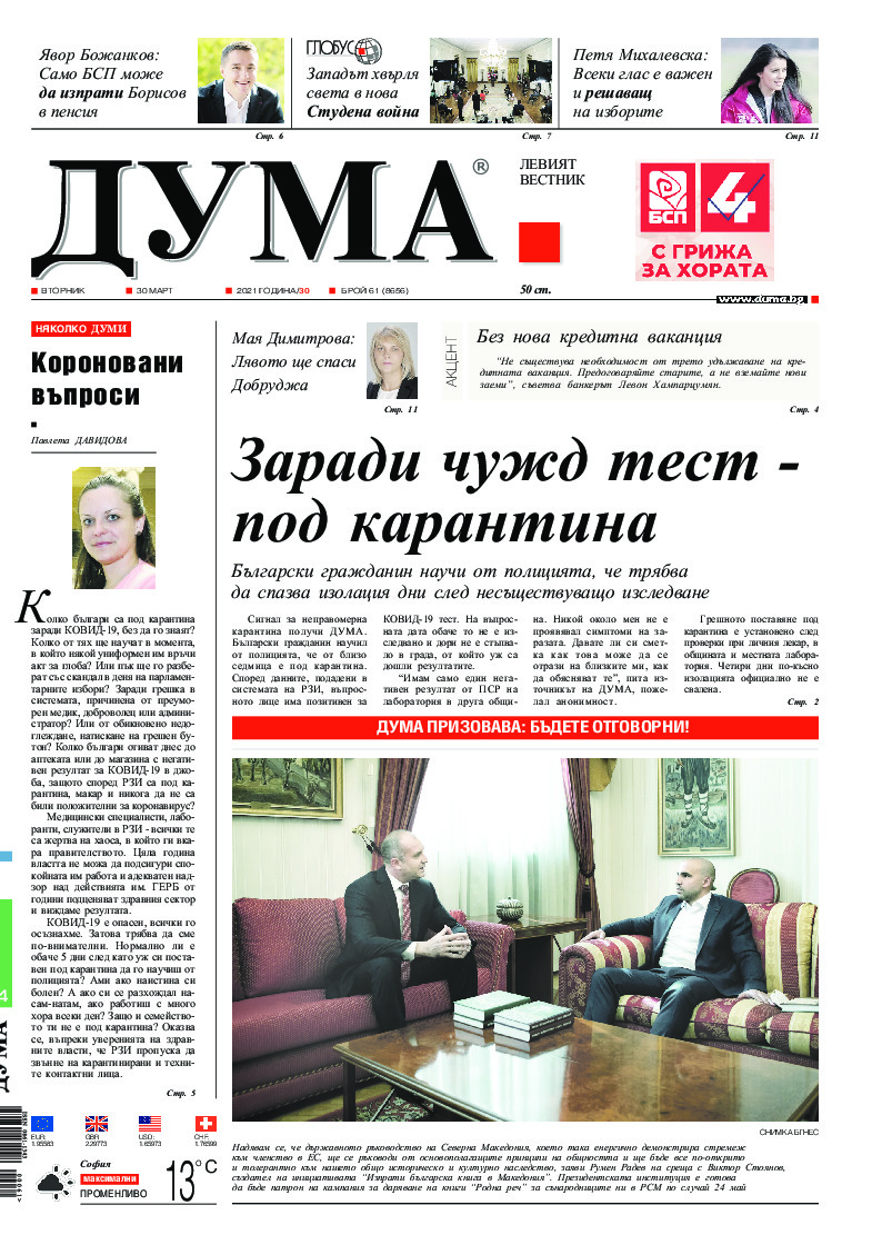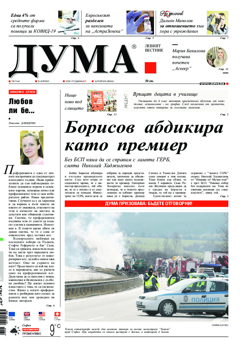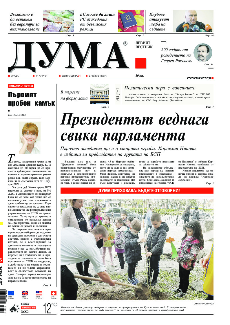 АБОНАМЕНТ за вестник „ДУМА“ за 2026 година. Можете да се абонирате в: „Български пощи“ АД до 15 декември 2025 г., „Доби прес“ ЕООД до 28 декември 2025 г., в редакцията на вестника до 20 декември 2025 г. Каталожен номер 6. Цени: 12 месеца - 149 € / 291,42 лв., 6 месеца - 75 € / 146,69 лв., 3 месеца - 40 € / 78,23 лв., 1 месец - 14 € / 27,38 лв. За повече информация тел. 02 9705 203 и 02 9705 216 отдел „Разпространение” на в-к ДУМА на ул. „Позитано” 20 А. E-mail: abonament@duma.bg АБОНАМЕНТ за вестник „ДУМА“ за 2026 година. Можете да се абонирате в: „Български пощи“ АД до 15 декември 2025 г., „Доби прес“ ЕООД до 28 декември 2025 г., в редакцията на вестника до 20 декември 2025 г. Каталожен номер 6. Цени: 12 месеца - 149 € / 291,42 лв., 6 месеца - 75 € / 146,69 лв., 3 месеца - 40 € / 78,23 лв., 1 месец - 14 € / 27,38 лв. За повече информация тел. 02 9705 203 и 02 9705 216 отдел „Разпространение” на в-к ДУМА на ул. „Позитано” 20 А. E-mail: abonament@duma.bg