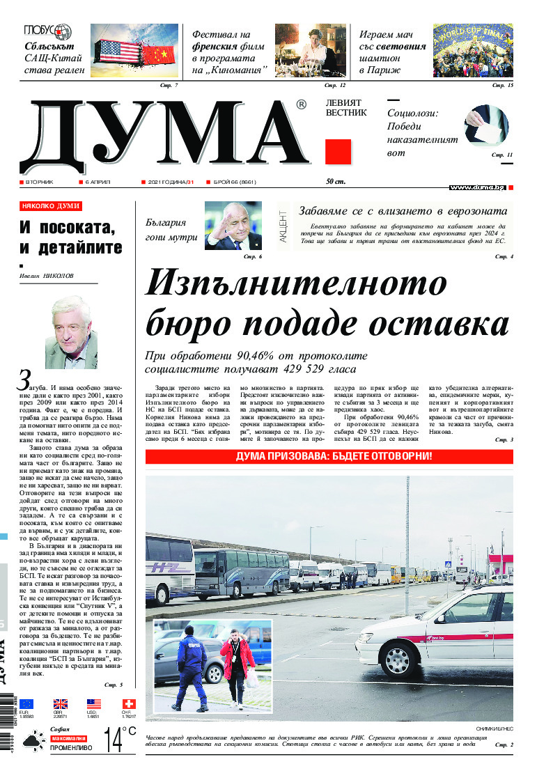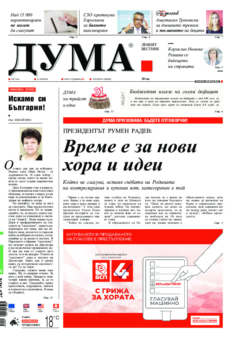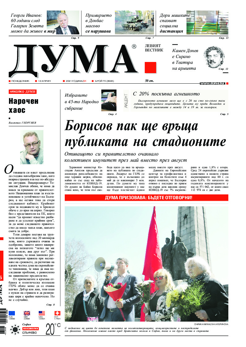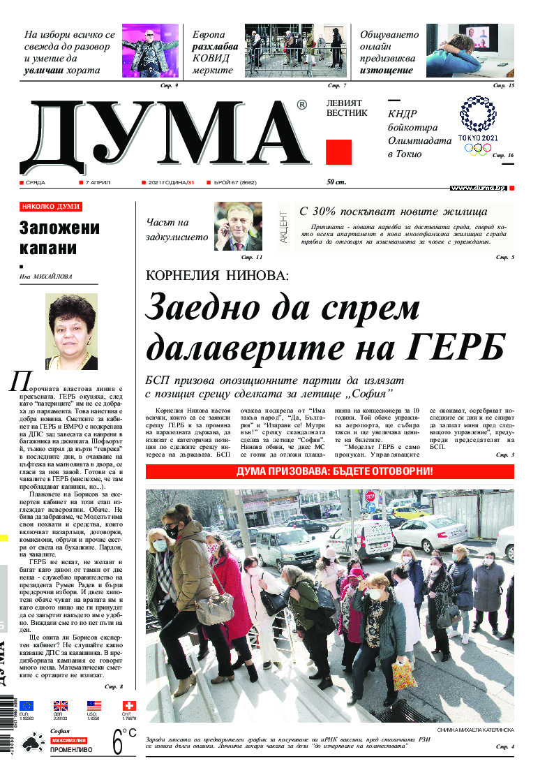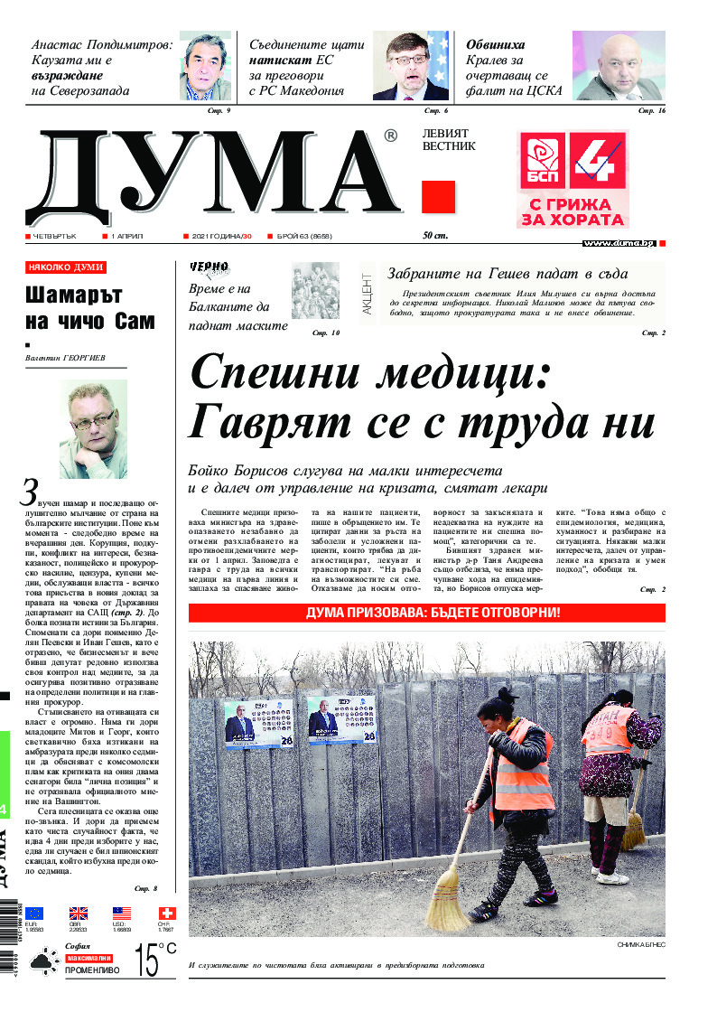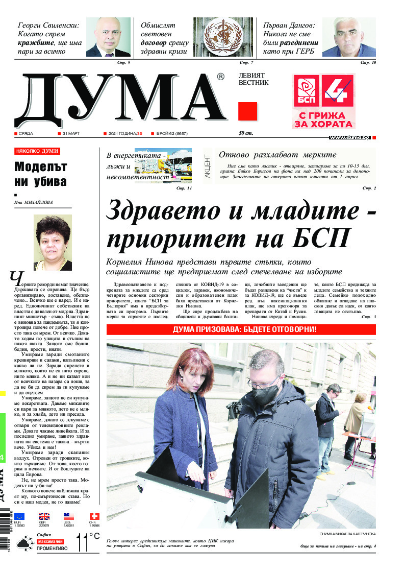 АБОНАМЕНТ за вестник „ДУМА“ за 2026 година. Можете да се абонирате в: „Български пощи“ АД до 15 декември 2025 г., „Доби прес“ ЕООД до 28 декември 2025 г., в редакцията на вестника до 20 декември 2025 г. Каталожен номер 6. Цени: 12 месеца - 149 € / 291,42 лв., 6 месеца - 75 € / 146,69 лв., 3 месеца - 40 € / 78,23 лв., 1 месец - 14 € / 27,38 лв. За повече информация тел. 02 9705 203 и 02 9705 216 отдел „Разпространение” на в-к ДУМА на ул. „Позитано” 20 А. E-mail: abonament@duma.bg АБОНАМЕНТ за вестник „ДУМА“ за 2026 година. Можете да се абонирате в: „Български пощи“ АД до 15 декември 2025 г., „Доби прес“ ЕООД до 28 декември 2025 г., в редакцията на вестника до 20 декември 2025 г. Каталожен номер 6. Цени: 12 месеца - 149 € / 291,42 лв., 6 месеца - 75 € / 146,69 лв., 3 месеца - 40 € / 78,23 лв., 1 месец - 14 € / 27,38 лв. За повече информация тел. 02 9705 203 и 02 9705 216 отдел „Разпространение” на в-к ДУМА на ул. „Позитано” 20 А. E-mail: abonament@duma.bg