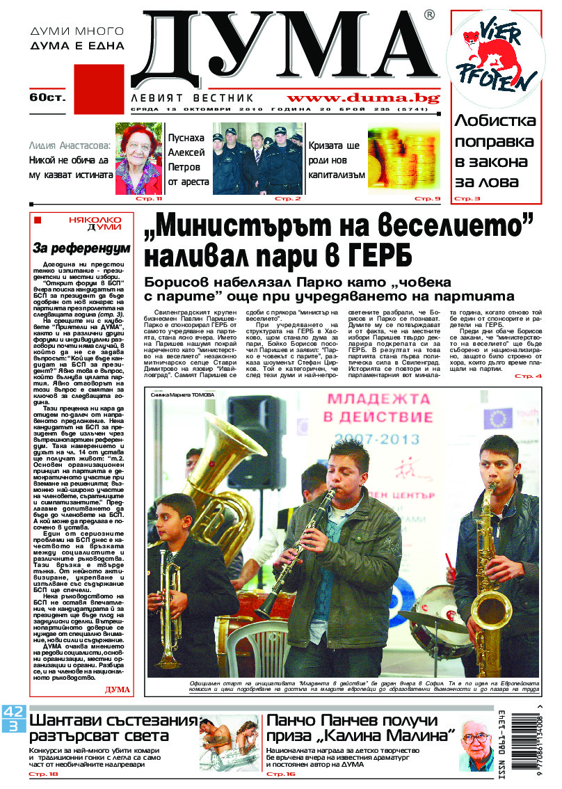 АБОНАМЕНТ за вестник „ДУМА“ за 2026 година. Можете да се абонирате в: „Български пощи“ АД до 15 декември 2025 г., „Доби прес“ ЕООД до 28 декември 2025 г., в редакцията на вестника до 20 декември 2025 г. Каталожен номер 6. Цени: 12 месеца - 149 € / 291,42 лв., 6 месеца - 75 € / 146,69 лв., 3 месеца - 40 € / 78,23 лв., 1 месец - 14 € / 27,38 лв. За повече информация тел. 02 9705 203 и 02 9705 216 отдел „Разпространение” на в-к ДУМА на ул. „Позитано” 20 А. E-mail: abonament@duma.bg АБОНАМЕНТ за вестник „ДУМА“ за 2026 година. Можете да се абонирате в: „Български пощи“ АД до 15 декември 2025 г., „Доби прес“ ЕООД до 28 декември 2025 г., в редакцията на вестника до 20 декември 2025 г. Каталожен номер 6. Цени: 12 месеца - 149 € / 291,42 лв., 6 месеца - 75 € / 146,69 лв., 3 месеца - 40 € / 78,23 лв., 1 месец - 14 € / 27,38 лв. За повече информация тел. 02 9705 203 и 02 9705 216 отдел „Разпространение” на в-к ДУМА на ул. „Позитано” 20 А. E-mail: abonament@duma.bg