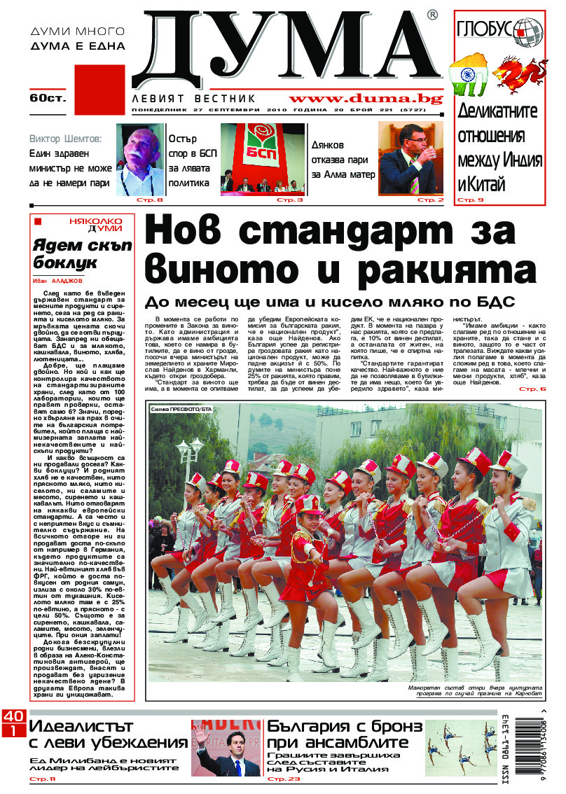 АБОНАМЕНТ за вестник „ДУМА“ за 2026 година. Можете да се абонирате в: „Български пощи“ АД до 15 декември 2025 г., „Доби прес“ ЕООД до 28 декември 2025 г., в редакцията на вестника до 20 декември 2025 г. Каталожен номер 6. Цени: 12 месеца - 149 € / 291,42 лв., 6 месеца - 75 € / 146,69 лв., 3 месеца - 40 € / 78,23 лв., 1 месец - 14 € / 27,38 лв. За повече информация тел. 02 9705 203 и 02 9705 216 отдел „Разпространение” на в-к ДУМА на ул. „Позитано” 20 А. E-mail: abonament@duma.bg АБОНАМЕНТ за вестник „ДУМА“ за 2026 година. Можете да се абонирате в: „Български пощи“ АД до 15 декември 2025 г., „Доби прес“ ЕООД до 28 декември 2025 г., в редакцията на вестника до 20 декември 2025 г. Каталожен номер 6. Цени: 12 месеца - 149 € / 291,42 лв., 6 месеца - 75 € / 146,69 лв., 3 месеца - 40 € / 78,23 лв., 1 месец - 14 € / 27,38 лв. За повече информация тел. 02 9705 203 и 02 9705 216 отдел „Разпространение” на в-к ДУМА на ул. „Позитано” 20 А. E-mail: abonament@duma.bg