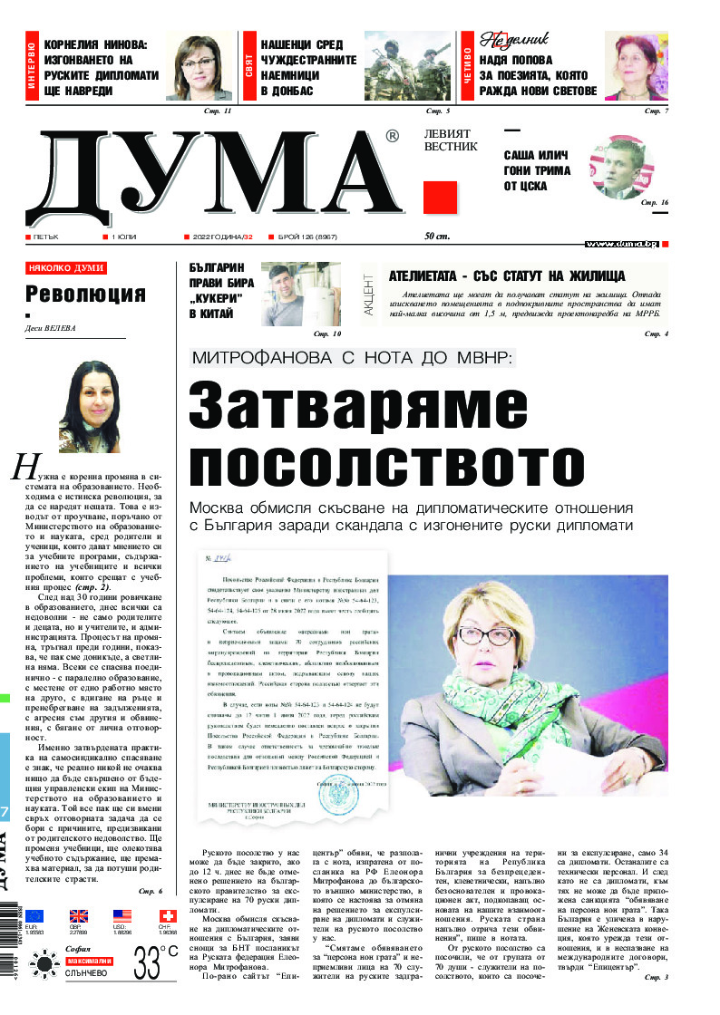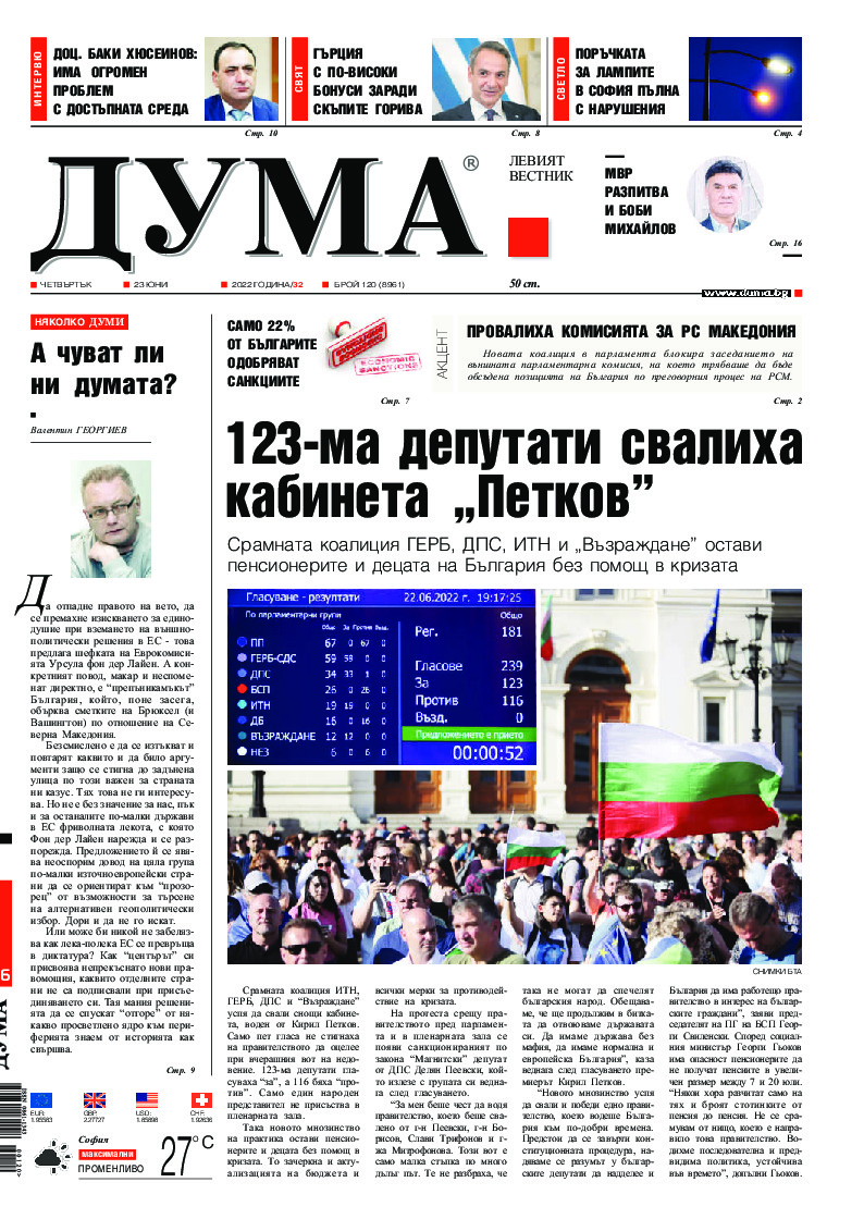 АБОНАМЕНТ за вестник „ДУМА“ за 2026 година. Можете да се абонирате в: „Български пощи“ АД до 15 декември 2025 г., „Доби прес“ ЕООД до 28 декември 2025 г., в редакцията на вестника до 20 декември 2025 г. Каталожен номер 6. Цени: 12 месеца - 149 € / 291,42 лв., 6 месеца - 75 € / 146,69 лв., 3 месеца - 40 € / 78,23 лв., 1 месец - 14 € / 27,38 лв. За повече информация тел. 02 9705 203 и 02 9705 216 отдел „Разпространение” на в-к ДУМА на ул. „Позитано” 20 А. E-mail: abonament@duma.bg АБОНАМЕНТ за вестник „ДУМА“ за 2026 година. Можете да се абонирате в: „Български пощи“ АД до 15 декември 2025 г., „Доби прес“ ЕООД до 28 декември 2025 г., в редакцията на вестника до 20 декември 2025 г. Каталожен номер 6. Цени: 12 месеца - 149 € / 291,42 лв., 6 месеца - 75 € / 146,69 лв., 3 месеца - 40 € / 78,23 лв., 1 месец - 14 € / 27,38 лв. За повече информация тел. 02 9705 203 и 02 9705 216 отдел „Разпространение” на в-к ДУМА на ул. „Позитано” 20 А. E-mail: abonament@duma.bg
