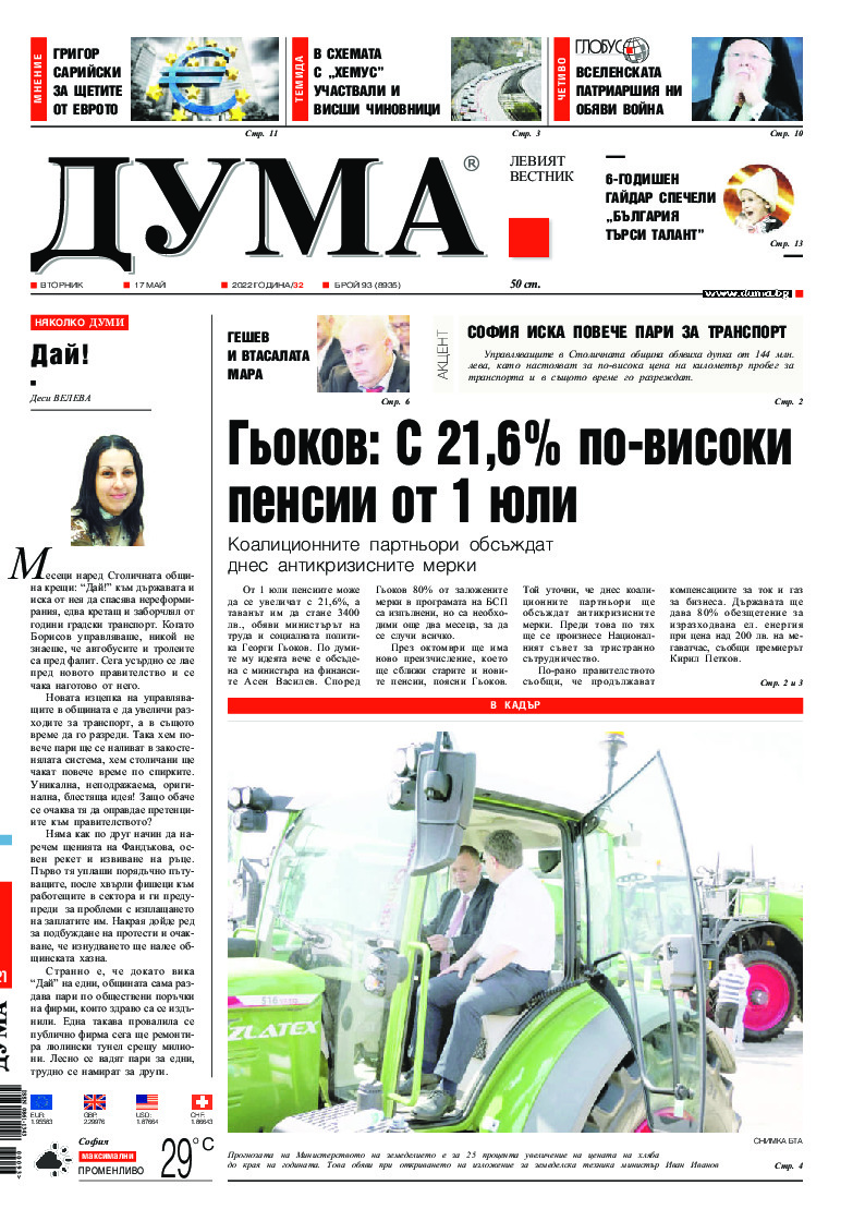 АБОНАМЕНТ за вестник „ДУМА“ за 2026 година. Можете да се абонирате в: „Български пощи“ АД до 15 декември 2025 г., „Доби прес“ ЕООД до 28 декември 2025 г., в редакцията на вестника до 20 декември 2025 г. Каталожен номер 6. Цени: 12 месеца - 149 € / 291,42 лв., 6 месеца - 75 € / 146,69 лв., 3 месеца - 40 € / 78,23 лв., 1 месец - 14 € / 27,38 лв. За повече информация тел. 02 9705 203 и 02 9705 216 отдел „Разпространение” на в-к ДУМА на ул. „Позитано” 20 А. E-mail: abonament@duma.bg АБОНАМЕНТ за вестник „ДУМА“ за 2026 година. Можете да се абонирате в: „Български пощи“ АД до 15 декември 2025 г., „Доби прес“ ЕООД до 28 декември 2025 г., в редакцията на вестника до 20 декември 2025 г. Каталожен номер 6. Цени: 12 месеца - 149 € / 291,42 лв., 6 месеца - 75 € / 146,69 лв., 3 месеца - 40 € / 78,23 лв., 1 месец - 14 € / 27,38 лв. За повече информация тел. 02 9705 203 и 02 9705 216 отдел „Разпространение” на в-к ДУМА на ул. „Позитано” 20 А. E-mail: abonament@duma.bg