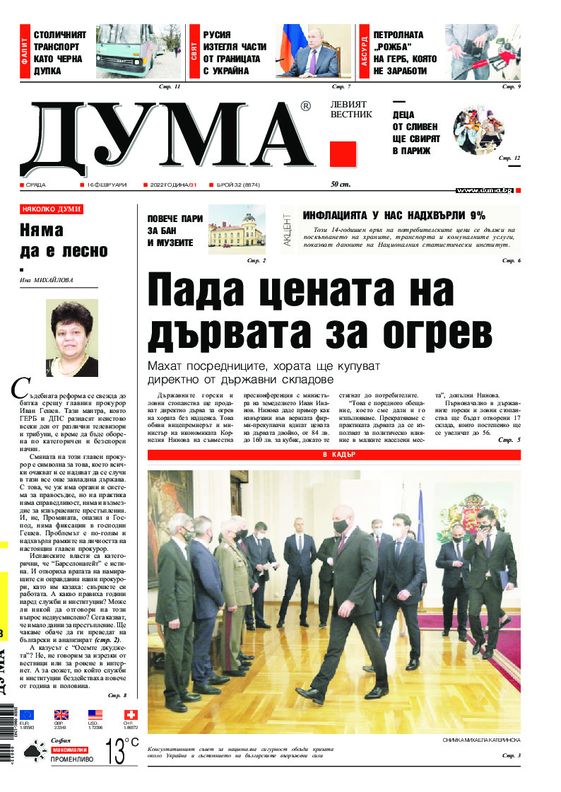 АБОНАМЕНТ за вестник „ДУМА“ за 2026 година. Можете да се абонирате в: „Български пощи“ АД до 15 декември 2025 г., „Доби прес“ ЕООД до 28 декември 2025 г., в редакцията на вестника до 20 декември 2025 г. Каталожен номер 6. Цени: 12 месеца - 149 € / 291,42 лв., 6 месеца - 75 € / 146,69 лв., 3 месеца - 40 € / 78,23 лв., 1 месец - 14 € / 27,38 лв. За повече информация тел. 02 9705 203 и 02 9705 216 отдел „Разпространение” на в-к ДУМА на ул. „Позитано” 20 А. E-mail: abonament@duma.bg АБОНАМЕНТ за вестник „ДУМА“ за 2026 година. Можете да се абонирате в: „Български пощи“ АД до 15 декември 2025 г., „Доби прес“ ЕООД до 28 декември 2025 г., в редакцията на вестника до 20 декември 2025 г. Каталожен номер 6. Цени: 12 месеца - 149 € / 291,42 лв., 6 месеца - 75 € / 146,69 лв., 3 месеца - 40 € / 78,23 лв., 1 месец - 14 € / 27,38 лв. За повече информация тел. 02 9705 203 и 02 9705 216 отдел „Разпространение” на в-к ДУМА на ул. „Позитано” 20 А. E-mail: abonament@duma.bg