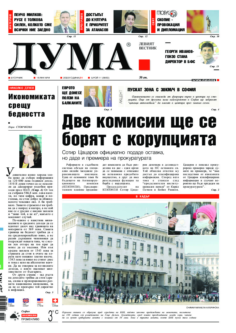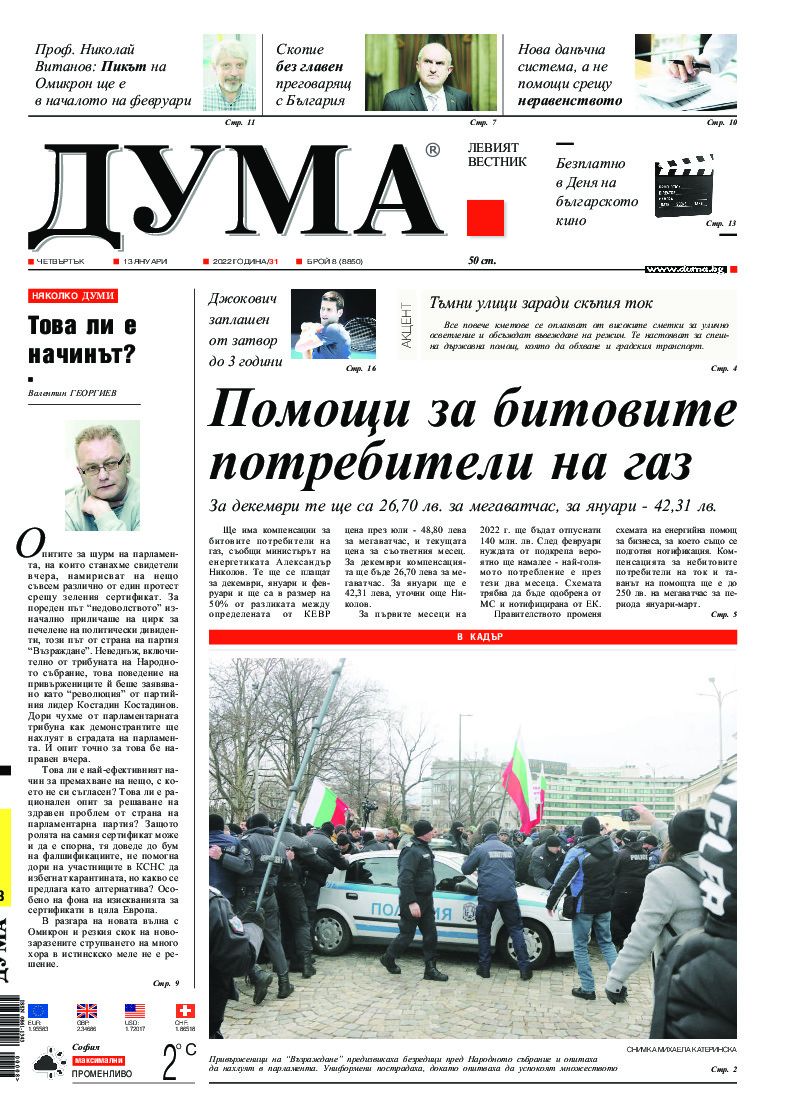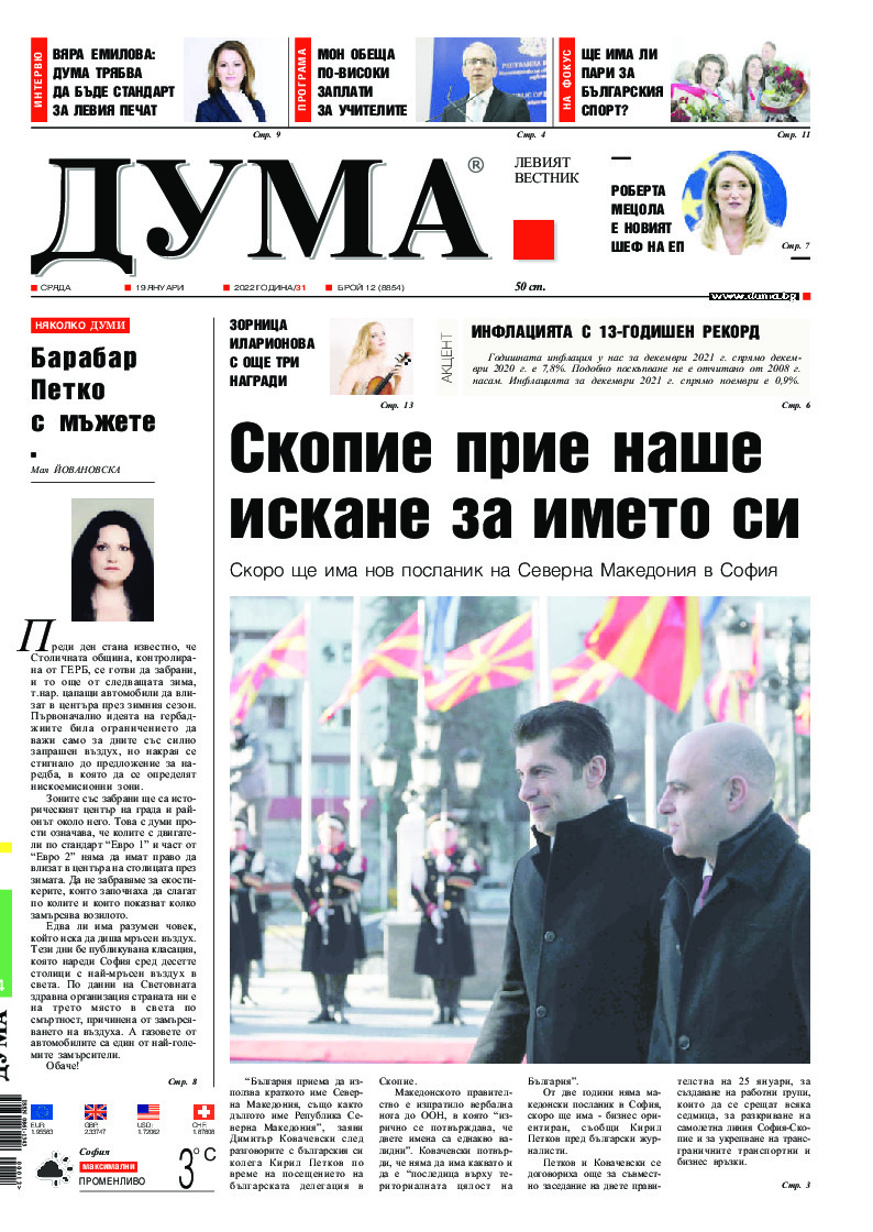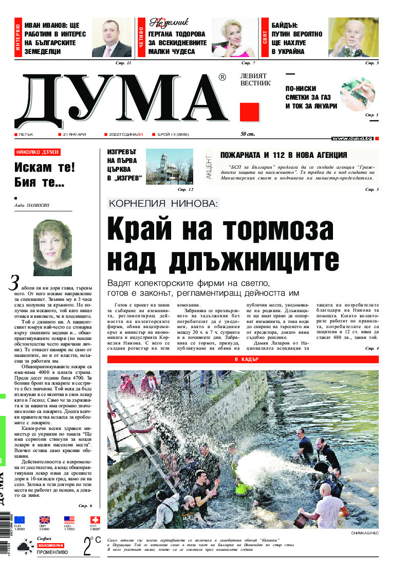 АБОНАМЕНТ за вестник „ДУМА“ за 2026 година. Можете да се абонирате в: „Български пощи“ АД до 15 декември 2025 г., „Доби прес“ ЕООД до 28 декември 2025 г., в редакцията на вестника до 20 декември 2025 г. Каталожен номер 6. Цени: 12 месеца - 149 € / 291,42 лв., 6 месеца - 75 € / 146,69 лв., 3 месеца - 40 € / 78,23 лв., 1 месец - 14 € / 27,38 лв. За повече информация тел. 02 9705 203 и 02 9705 216 отдел „Разпространение” на в-к ДУМА на ул. „Позитано” 20 А. E-mail: abonament@duma.bg АБОНАМЕНТ за вестник „ДУМА“ за 2026 година. Можете да се абонирате в: „Български пощи“ АД до 15 декември 2025 г., „Доби прес“ ЕООД до 28 декември 2025 г., в редакцията на вестника до 20 декември 2025 г. Каталожен номер 6. Цени: 12 месеца - 149 € / 291,42 лв., 6 месеца - 75 € / 146,69 лв., 3 месеца - 40 € / 78,23 лв., 1 месец - 14 € / 27,38 лв. За повече информация тел. 02 9705 203 и 02 9705 216 отдел „Разпространение” на в-к ДУМА на ул. „Позитано” 20 А. E-mail: abonament@duma.bg